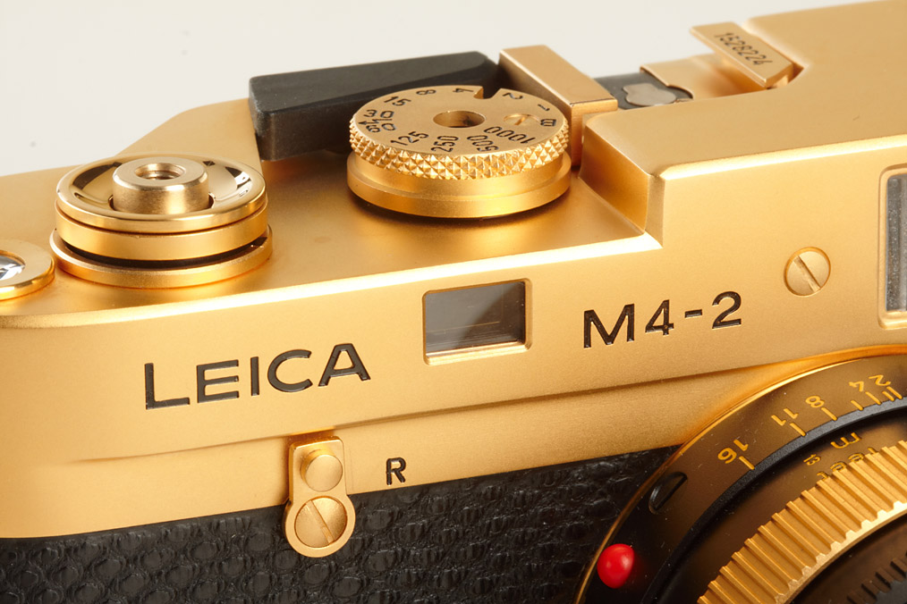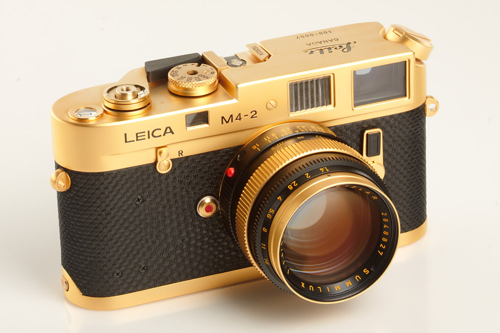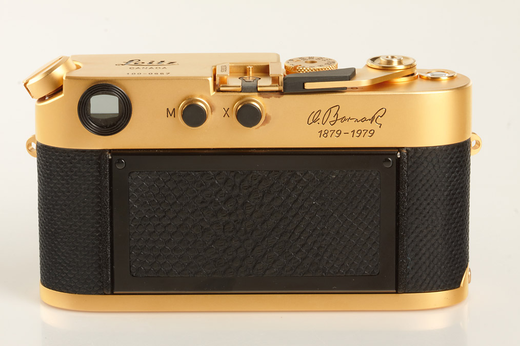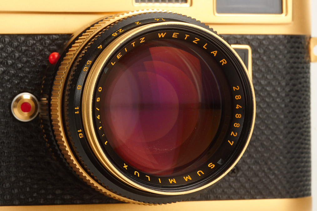 special gold edition Oskar Barnack 1879-1979 (special number 100-0657), gold plated Summilux-M 1.4/50mm no.2848827, in near mint condition with both original maker's boxes with matching numbers (rare!), with certificate, warranty card, instructions, caps, hood