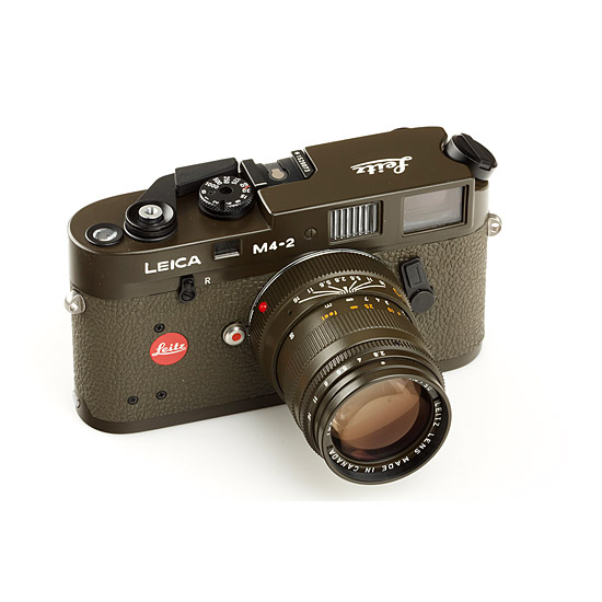 Leitz projected the Safari version for both R3 and M4-2 models in 1977. A handful of prototypes of the Safari M4-2 were made in Canada, but finally Leitz decided to only follow up with a Safari version of the reflex model. The offered olive M4-2 is in 100% original and near mint condition and comes with the matching olive sample-lens Tele-Elmarit-M 2.8/90mm no.3003244. A similar model with a 2/35 lens is illustrated in Nakamura page 90. According to this source the camera was produced as a sample for the Israeli Army. A rare and highly collectible camera which has never been before offered at an auction!