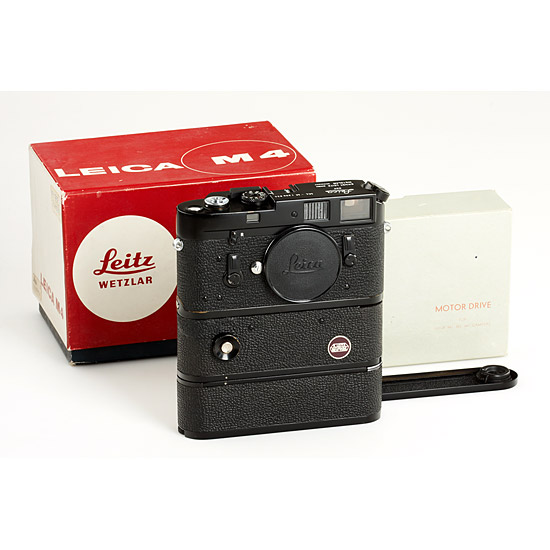 100% original M4-M black paint in excellent and perfect working condition, cap, base plate, maker's box with matching number, with matching E.Leitz New York Motor Drive 14000 no.02287 in perfect working condition with "AA" battery pack, German and English instructions, rare maker's box