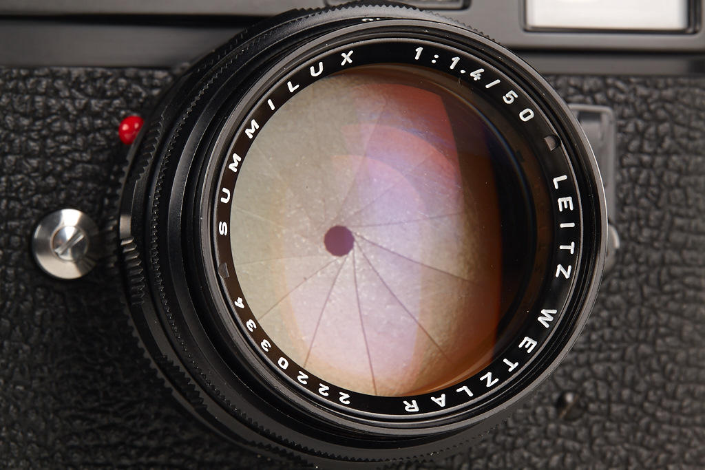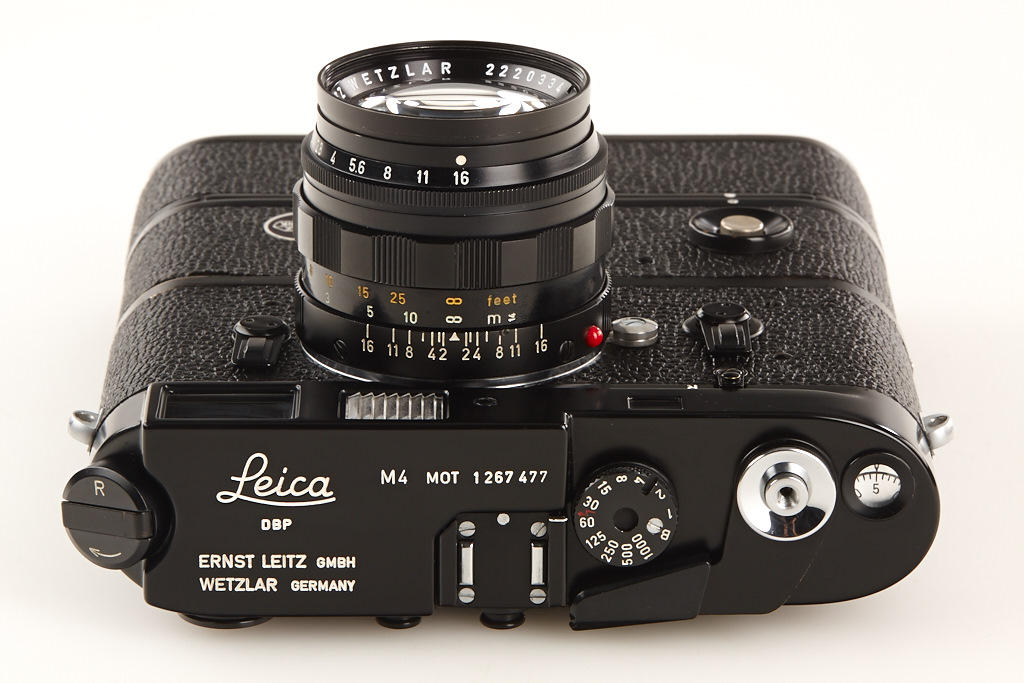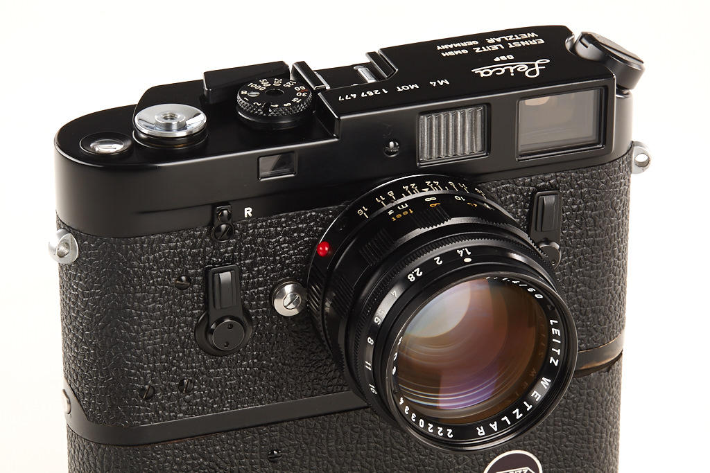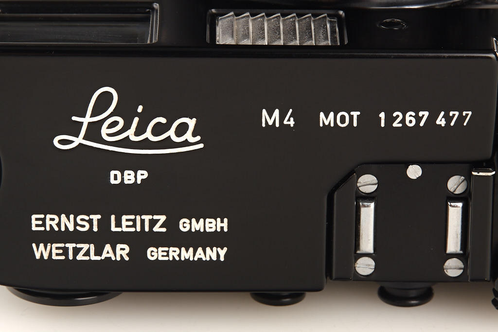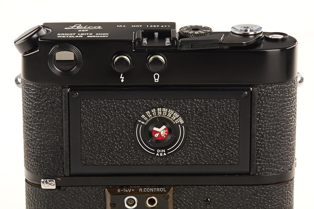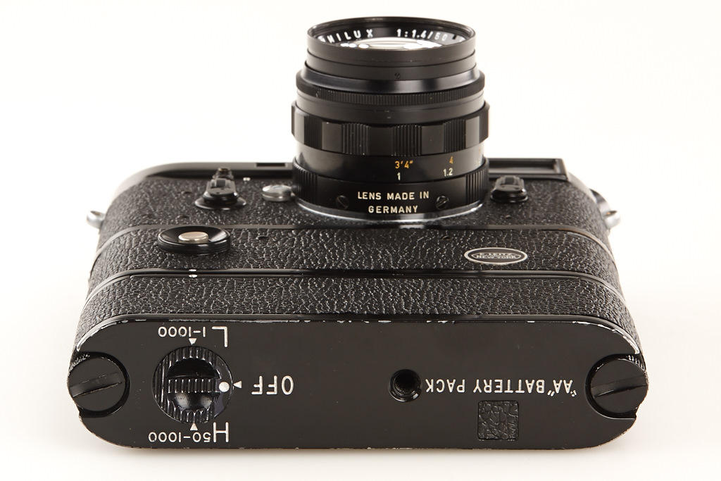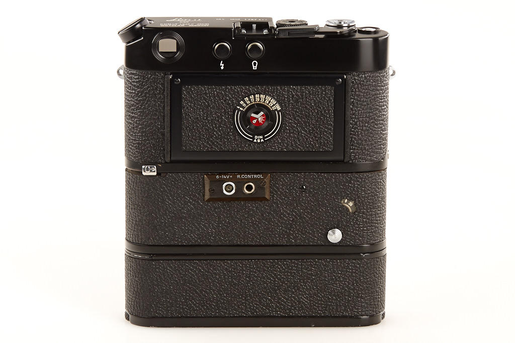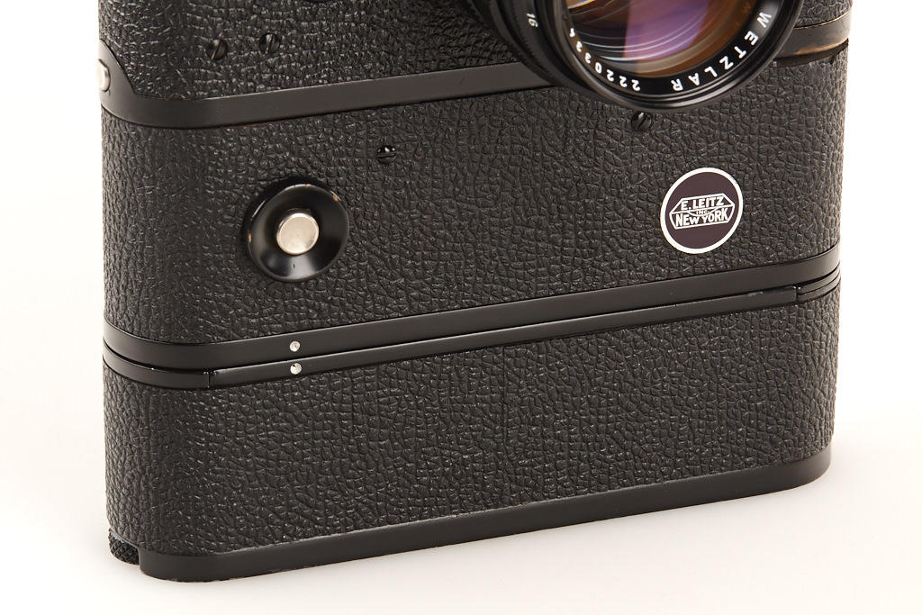 100% original M4 MOT black paint in almost mint and perfect working condition, with matching E.Leitz New York Motor Drive 14000 no.02616 (cond. B/A) in perfect working condition with "AA" battery pack, regular base plate, very rare black (partly painted) Summilux 1.4/50mm no.2220334 (clean lenses, cap)