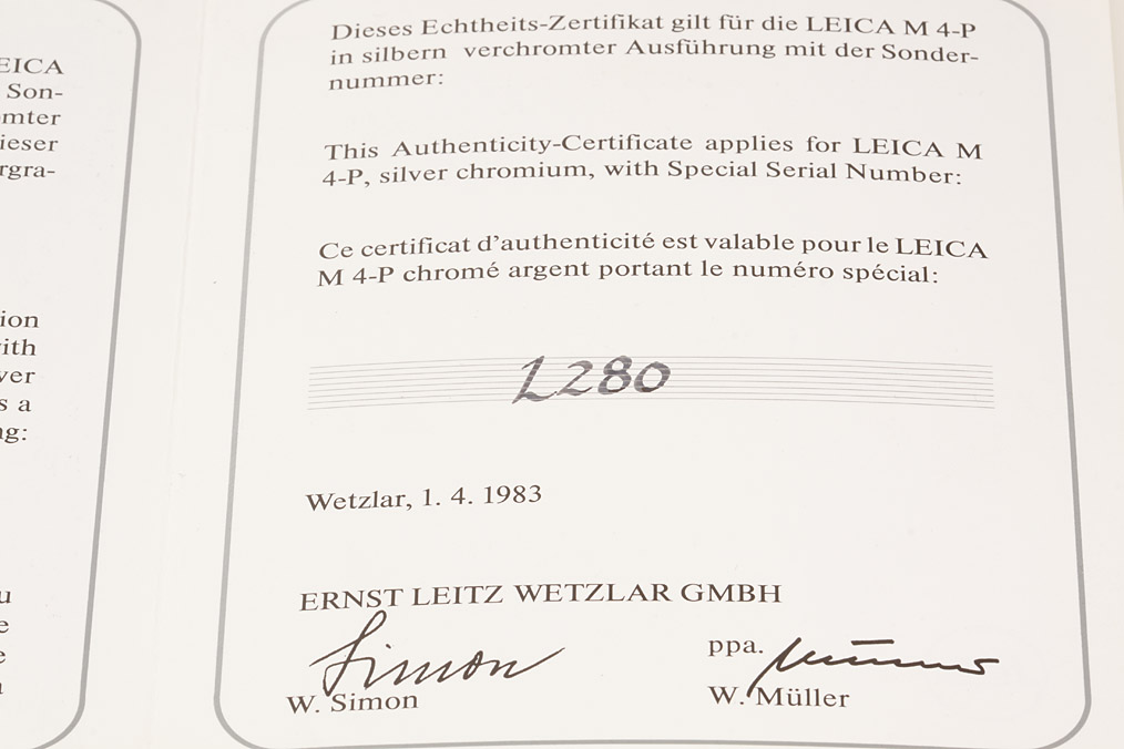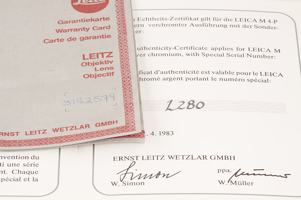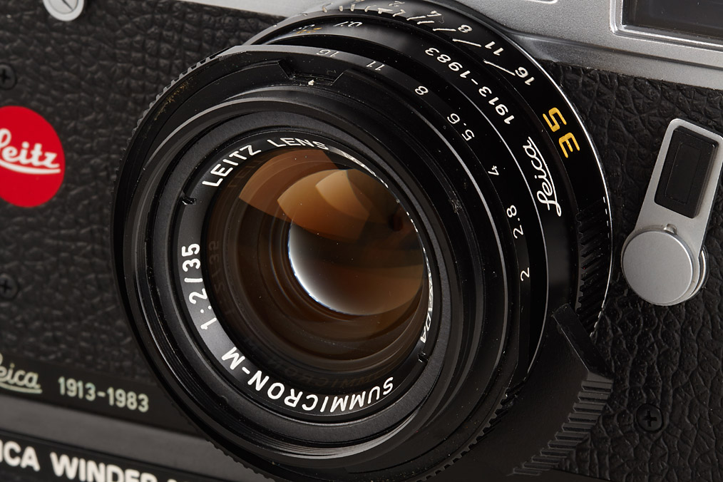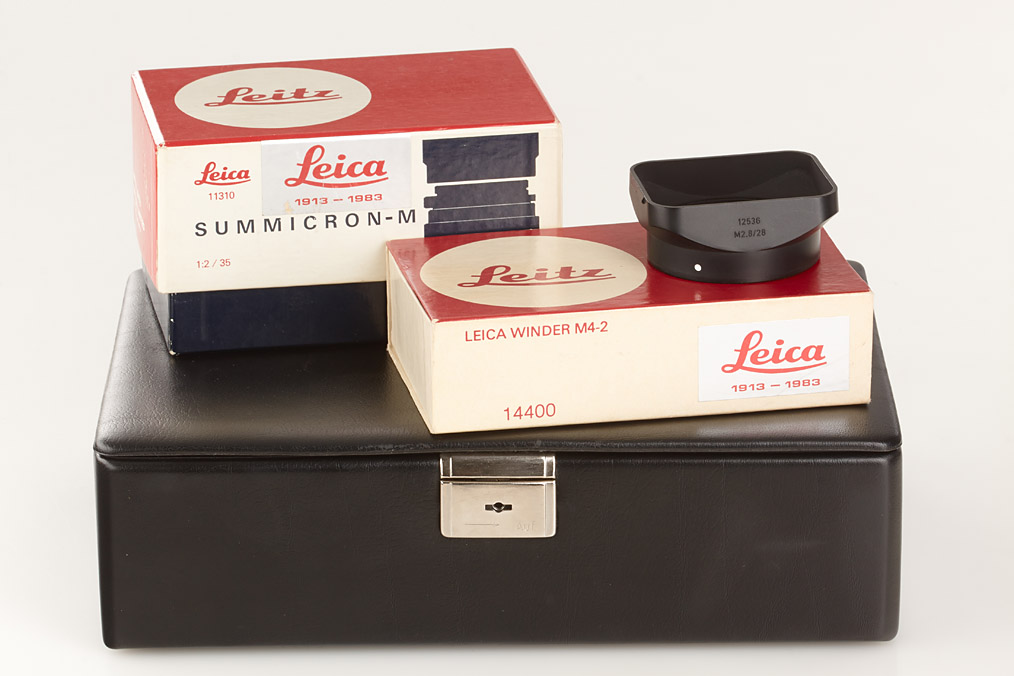 edition camera (special no.L280), M4-2 Winder (1913-1983, maker's box), authenticity certificate - all in special fitted presentation case, edition Summicron 2/35mm no.3182579, like new in makers box with hood, caps, warranty card, base plate