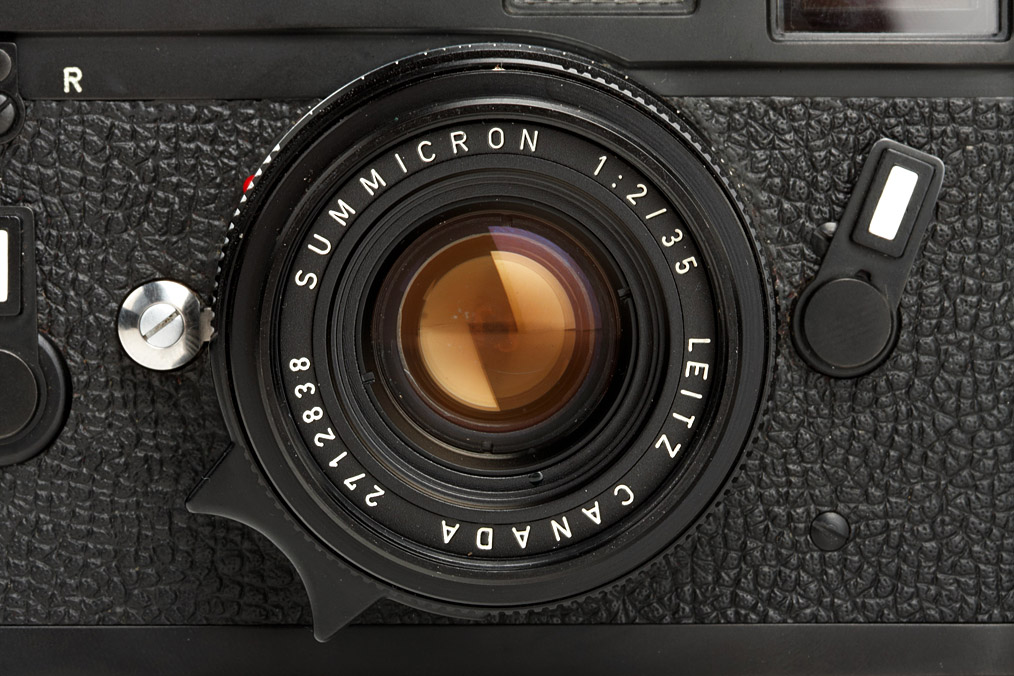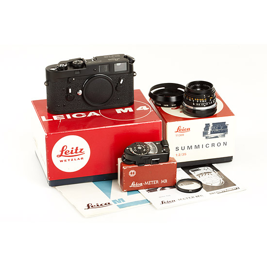 black anodised M4 in perfect working order (clean finder and shutter), cap, instruction book, strap, maker's box with matching number, Leicameter MR-4 black no.46961 with instruction book in maker's box, matching 2nd version Summicron 11309 2/35mm no.2712838 (caps, 12504 hood, filter) in maker's box with matching number