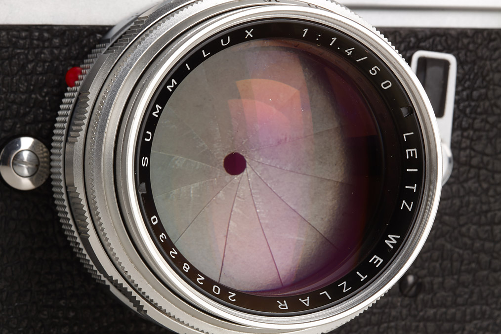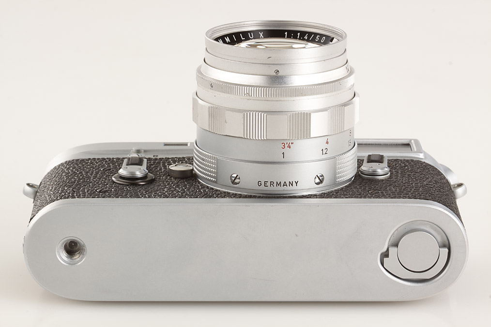 in very fine condition and good working order with late chrome Summilux 1.4/50mm no.2028230 (clean lenses), instructions, warranty card