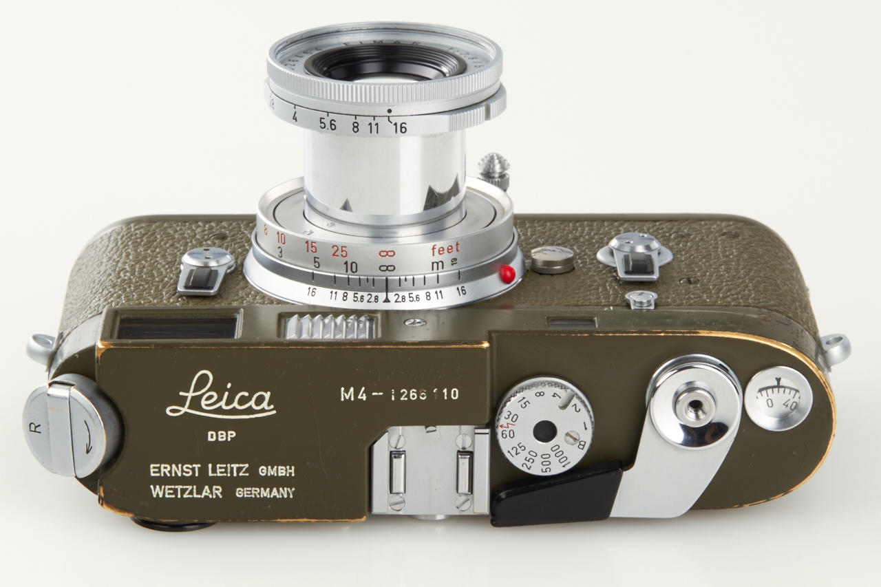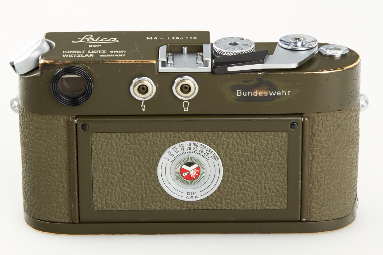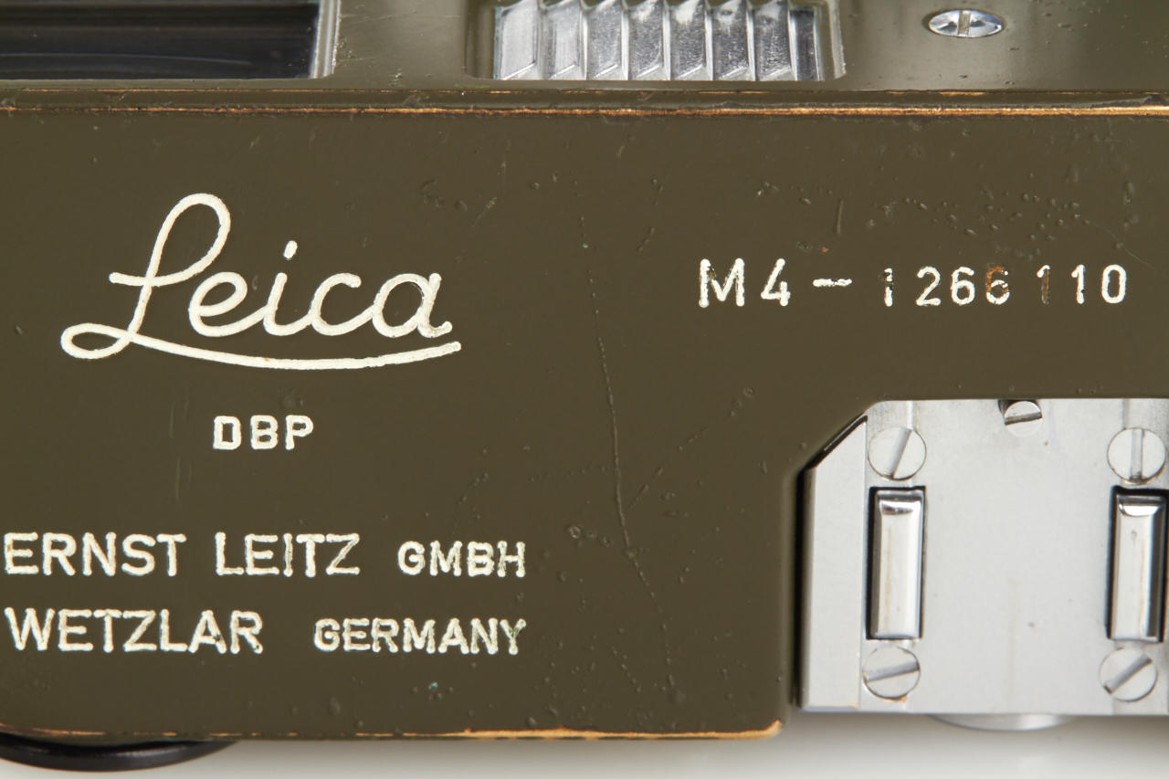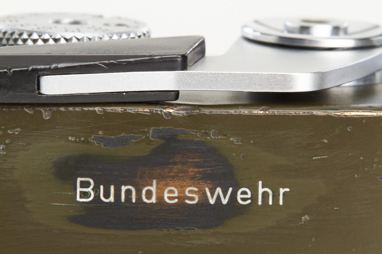 One of the rarest M cameras in authentic condition and working order! Only thirty M4 cameras were finished in olive green for the German Bundeswehr (numbers 1266101-126613199), engraved 'BUNDESWEHR' on rear of top plate, inclusive chrome Elmar 2.8/50mm no.2326464. The outer parts of the camera were recently carefully cleaned and non original repaint removed, some vulcanite damages were perfectly fixed by Ottmar Michaely in Wetzlar.
