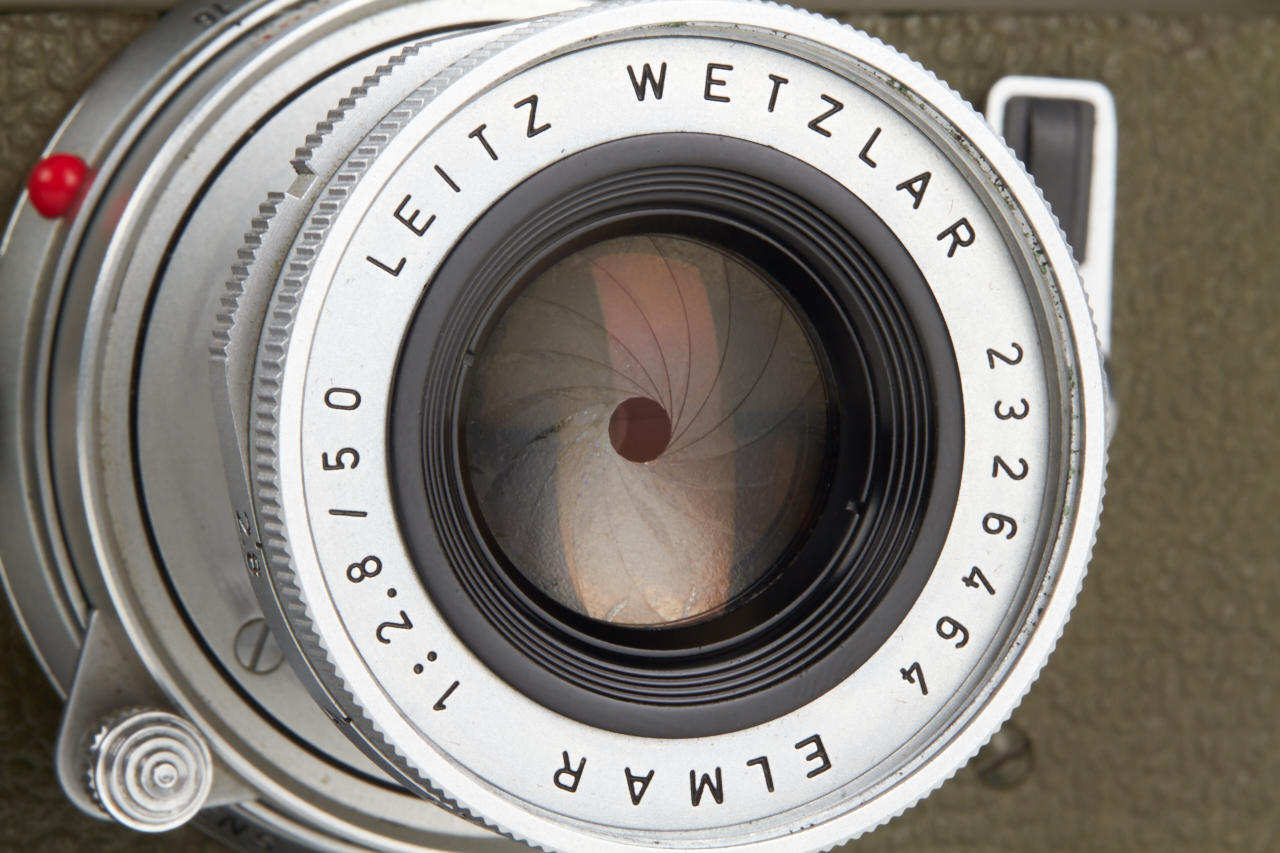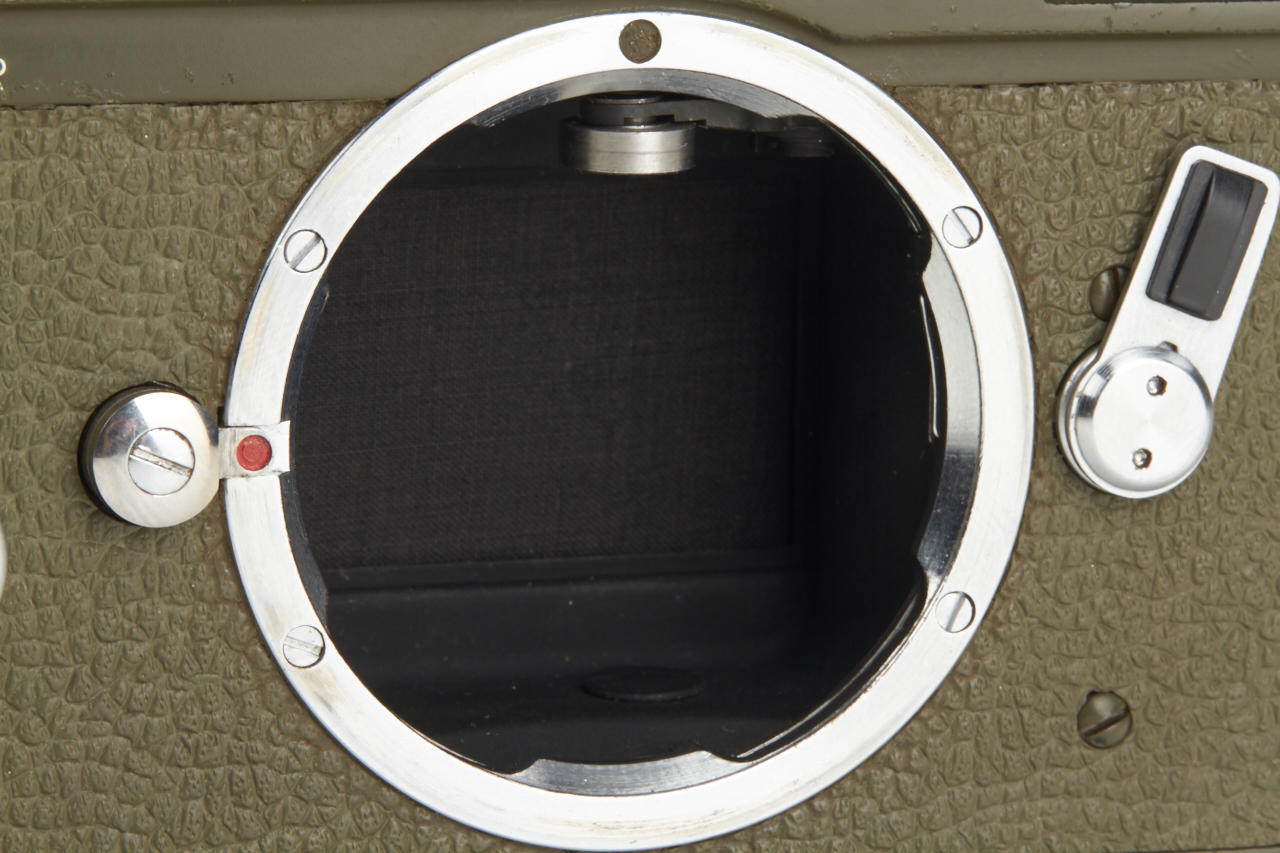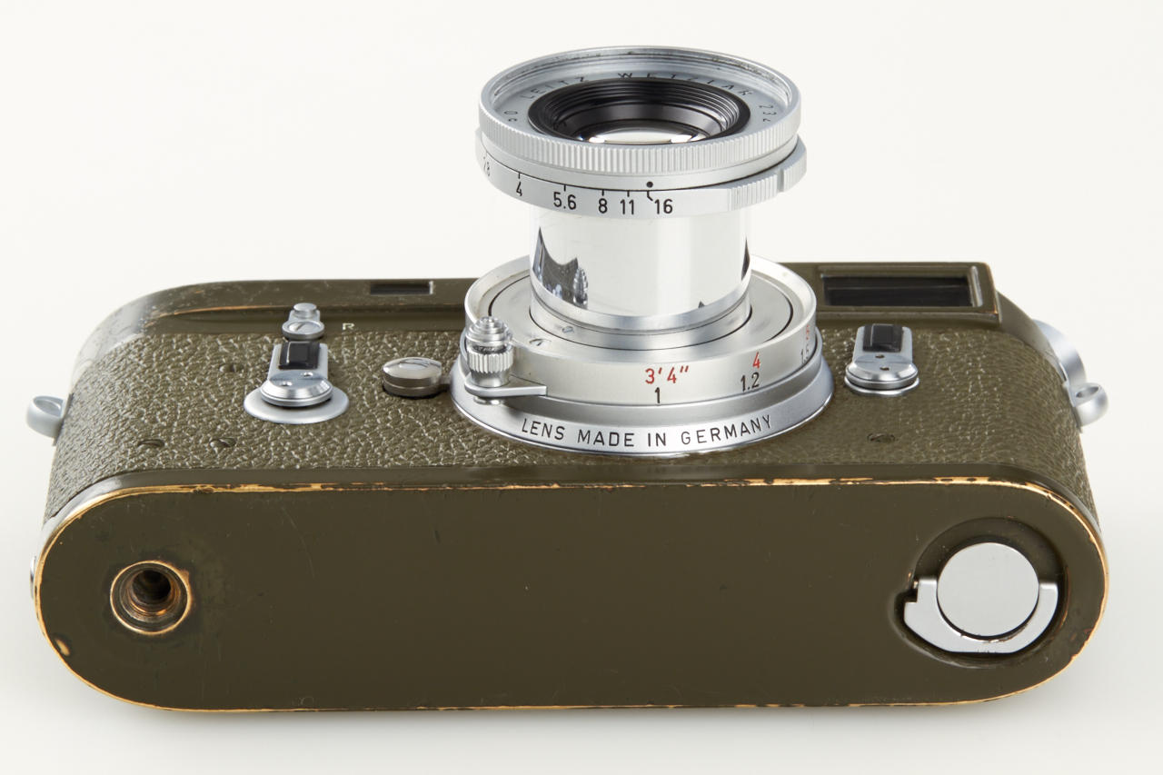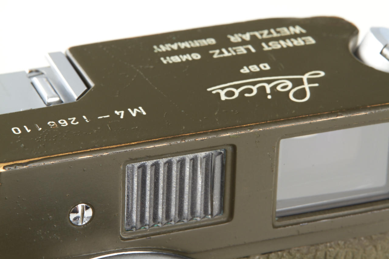 One of the rarest M cameras in authentic condition and working order! Only thirty M4 cameras were finished in olive green for the German Bundeswehr (numbers 1266101-126613199), engraved 'BUNDESWEHR' on rear of top plate, inclusive chrome Elmar 2.8/50mm no.2326464. The outer parts of the camera were recently carefully cleaned and non original repaint removed, some vulcanite damages were perfectly fixed by Ottmar Michaely in Wetzlar.
