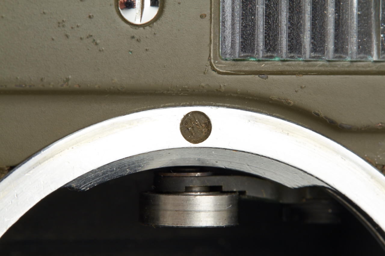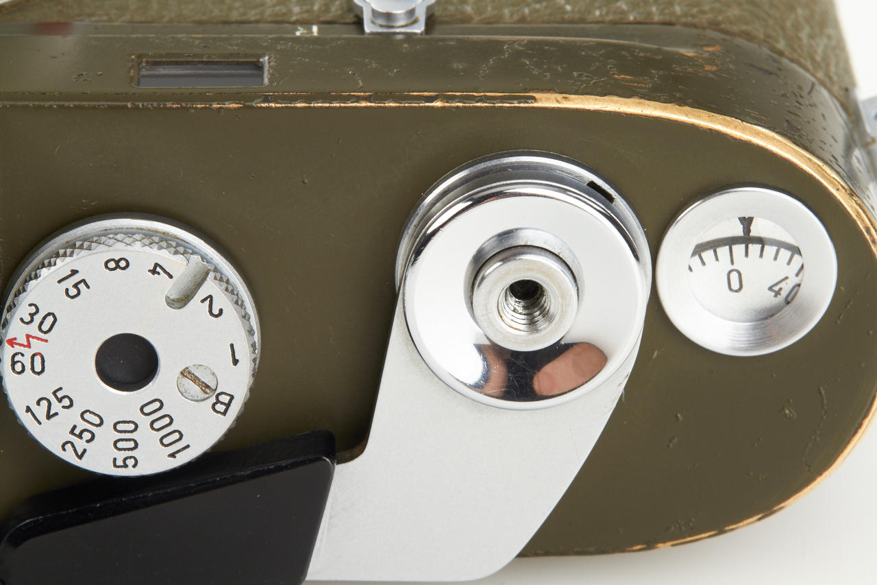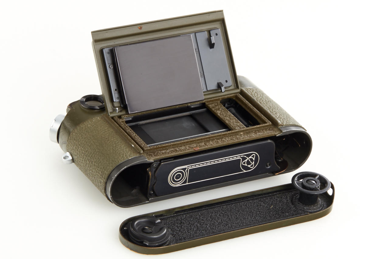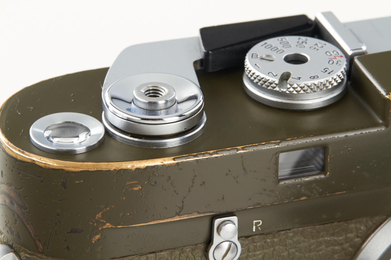One of the rarest M cameras in authentic condition and working order! Only thirty M4 cameras were finished in olive green for the German Bundeswehr (numbers 1266101-126613199), engraved 'BUNDESWEHR' on rear of top plate, inclusive chrome Elmar 2.8/50mm no.2326464. The outer parts of the camera were recently carefully cleaned and non original repaint removed, some vulcanite damages were perfectly fixed by Ottmar Michaely in Wetzlar.