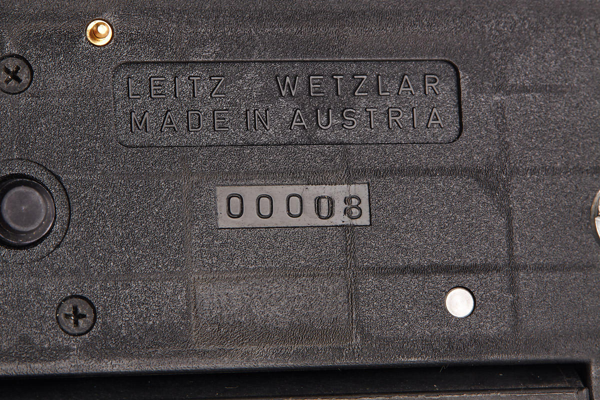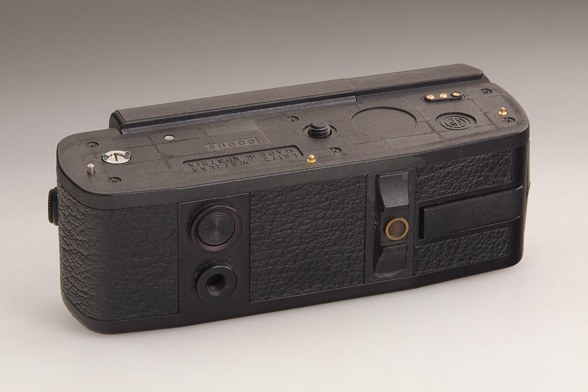 Rare Leica M6 “electronic“ prototype with typical serial number 1234567 in nice condition with functional shutter (/100), complete with prototype motor drive no. 00008 and extremely rare Leica prototype lens Elmarit - M 28mm f/2.8 with built-in sunshade, of which only two examples are known to exist. Lens with clean optics and prototype number 5001632. By end of the 1970s it was one of the most important challenges for the Leitz designers, to integrate a TTL metering into the Leica M camera. Leitz designer Peter Loseries had the idea of using the Leica R4 with its Seiko shutter as a basis. Mirror box and pentaprism were taken off and instead a rangefinder was added on top. The result was a Leica M with TTL metering, optional automatic exposure and a large camera rear door opening horizontally. The R4 data back, as well as winder and drive were compatible. What sounds so simple, in fact was almost an entirely new design. For various reasons this camera never went into commercial production. Only a few complete sample units do exist.