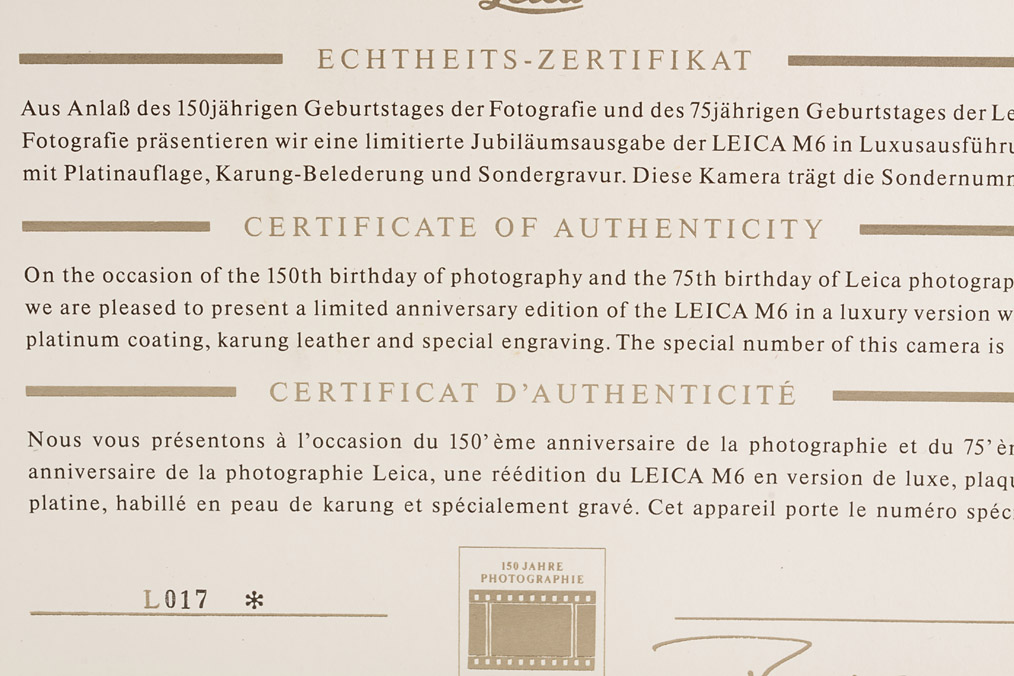 brand new platinum M6 with Summilux-M 1.4/50mm no.3482048, complete with all papers and maker's box, special number L017