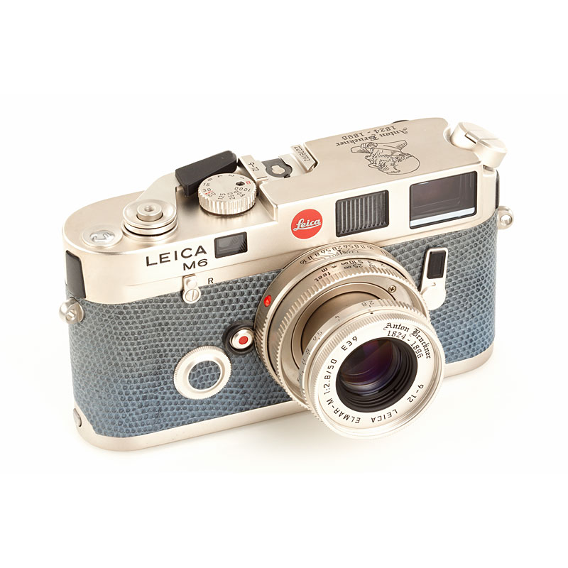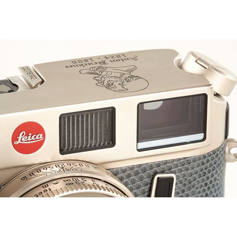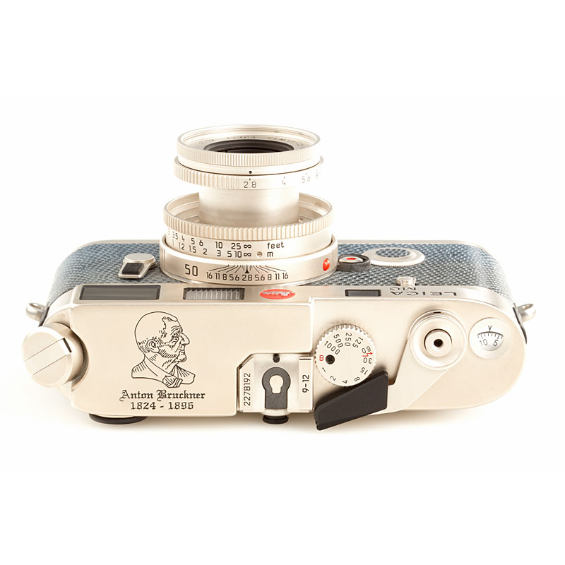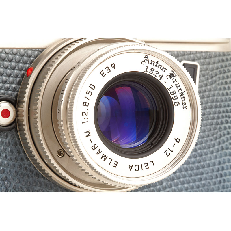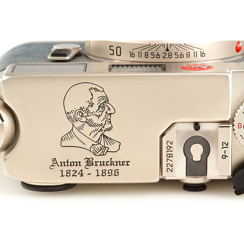 new edition of 200 cameras for the Austrian composer Anton Bruckner, platinum finish with special Elmar 2.8/50mm, both with special number 9-12, with hood, cap, wooden box, papers and outer maker's box