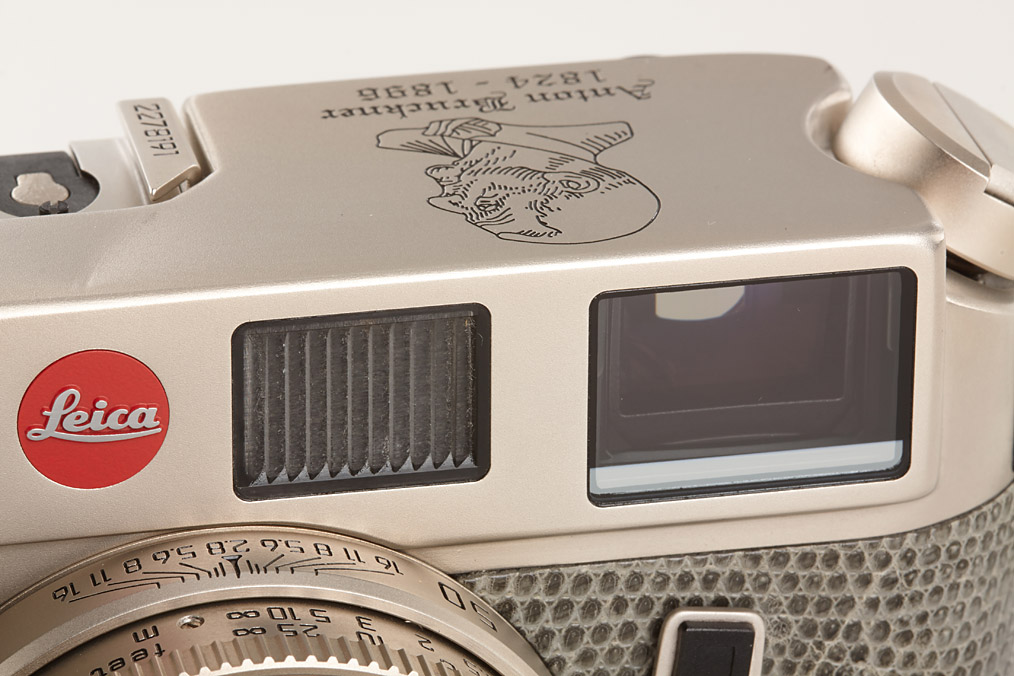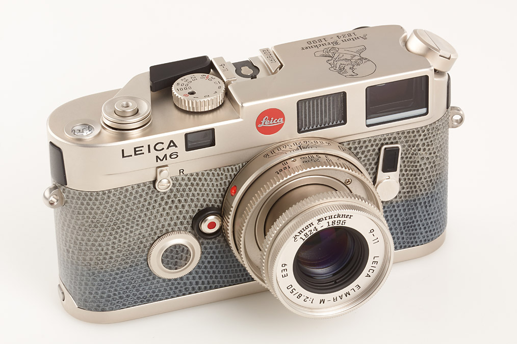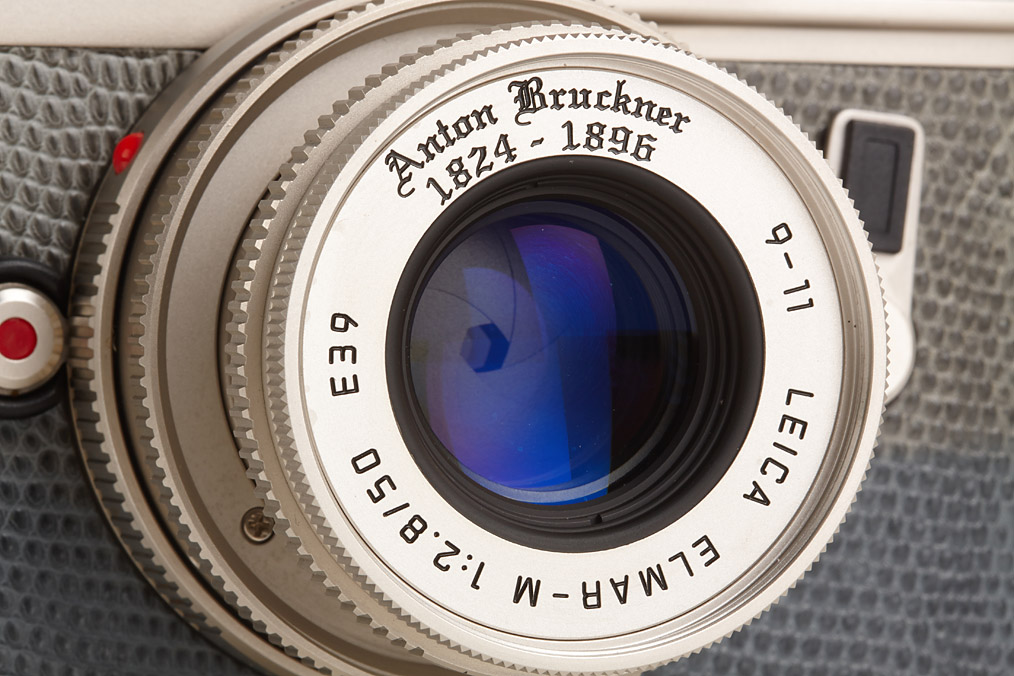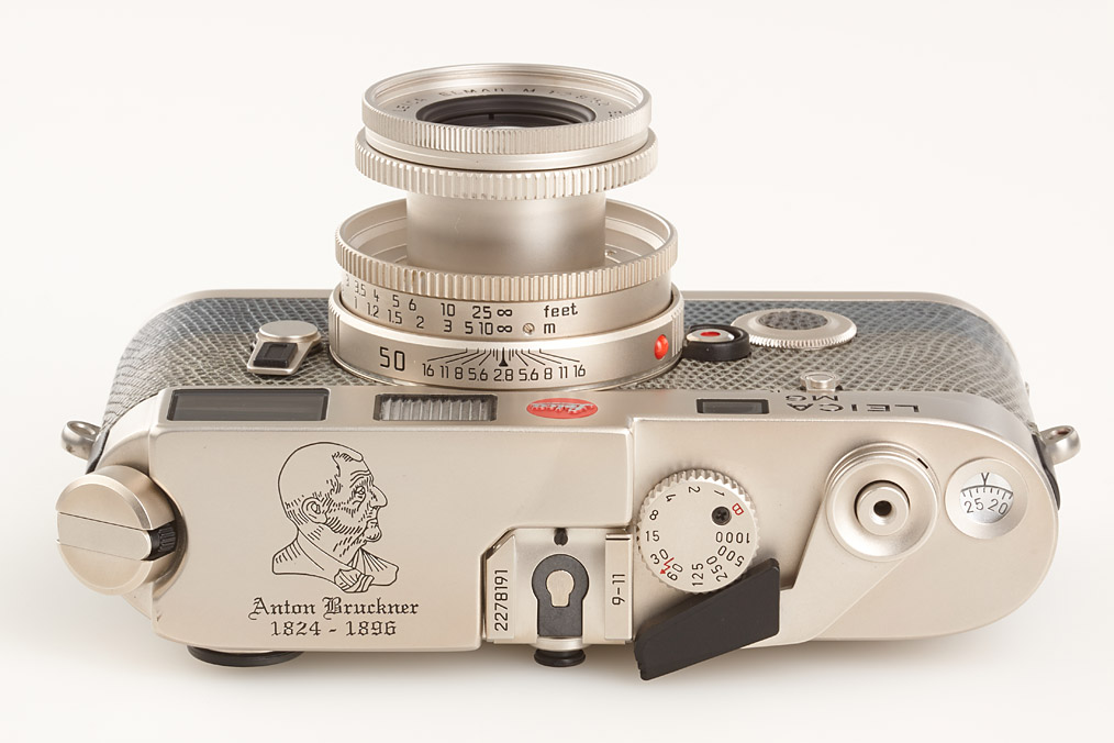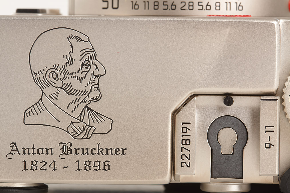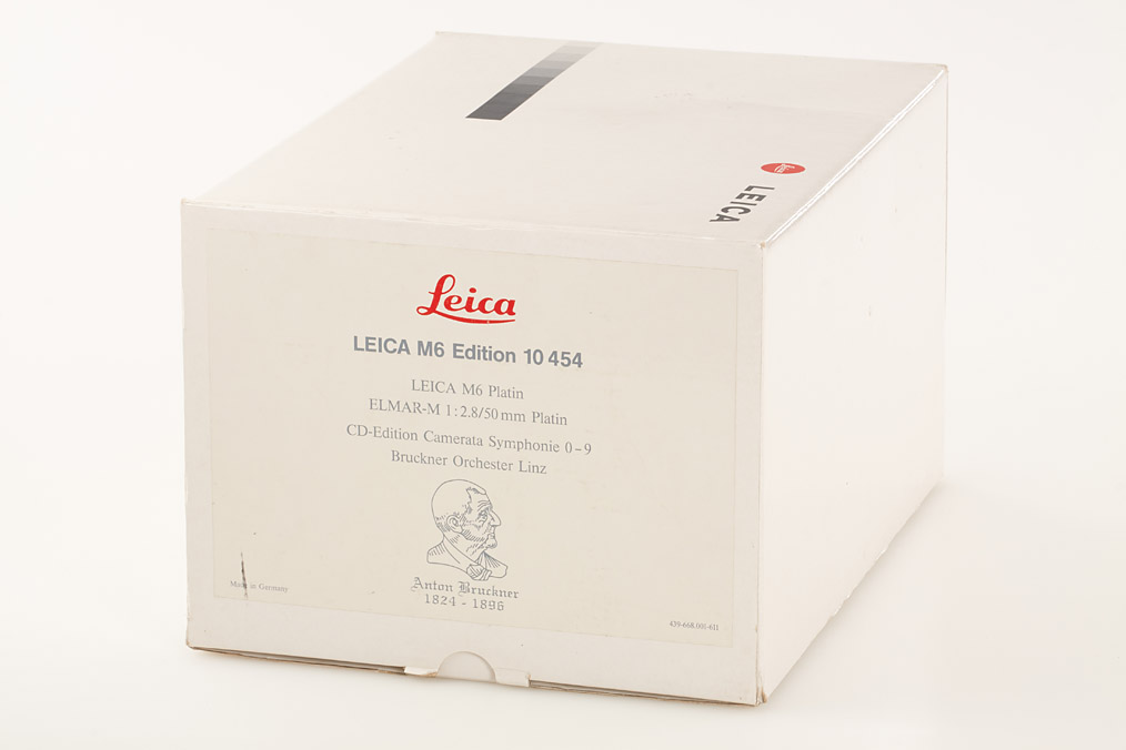edition of 200 cameras for the Austrian composer Anton Bruckner, platinum finish with special Elmar 2.8/50mm, both with special number 9-11, except a small dent on top plate in mint condition, complete with CD's, wooden box, papers and outer maker's box