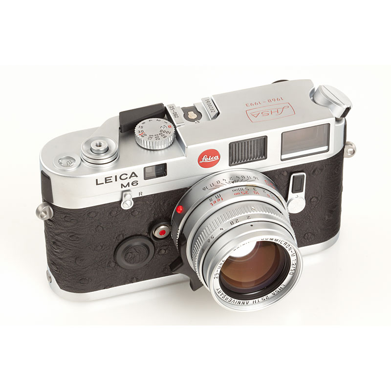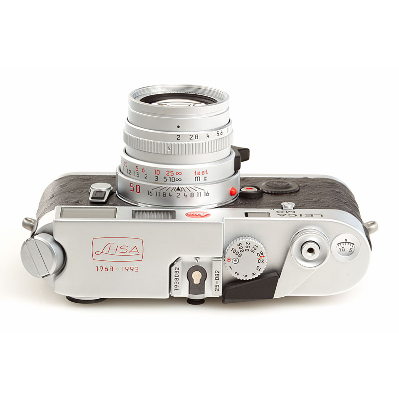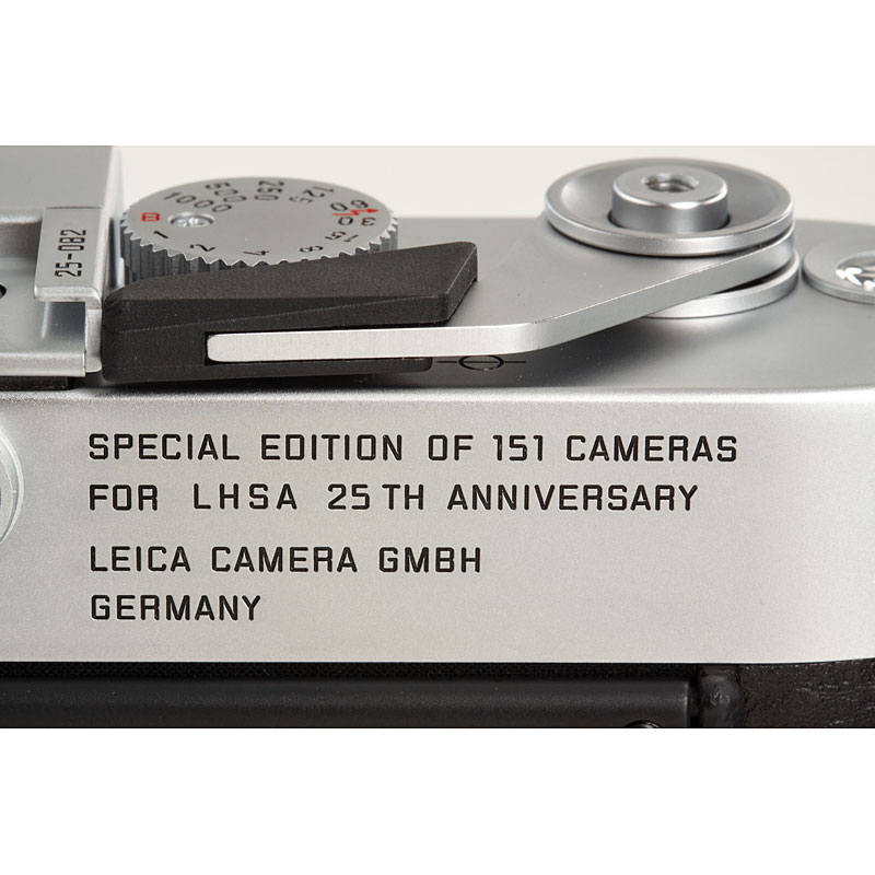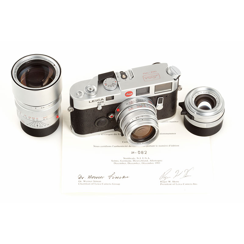 new and very rare edition (special number 25-082) of 151 cameras for the 25th anniversary of Leica Historical Society of America including chrome M6 body engraved 'LHSA 1968-1993' and three matching chrome edition lenses (Summicron-M 2/35mm, Summicron 2/50mm, Summicron 2/90mm) - all with maker's boxes, wooden display box