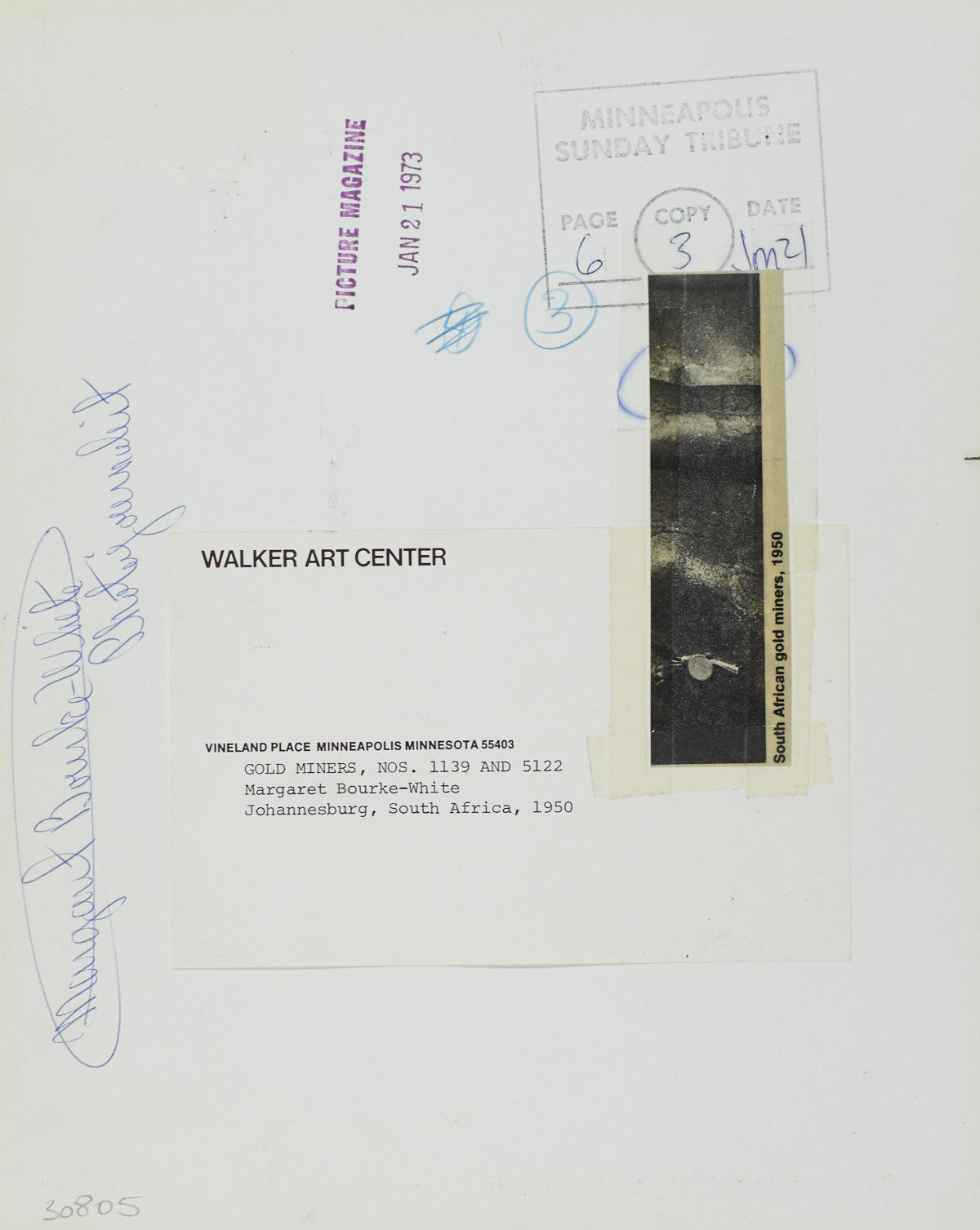 Gelatin silver print, printed in 1973 24,1 x 18,2 cm “Minneapolis Sunday Tribune” newspaper stamp, date stamp (print date) and label from the “Walker Art Center” on the reverse, annotations in an unidentified hand including photographer's credit on the reverse LITERATURE Sean Callahan (ed.), The Photographs of Margaret Bourke-White, 1972, cover; Theodor M. Brown (ed.), Margaret Bourke-White. Photojournalist, New York 1972, p. 92; Photographie des 20. Jahrhunderts. Museum Ludwig Köln, Cologne 2007, p. 73; Die großen Life Photographen des 20. Jahrhunderts, Munich 2004, p. 31.