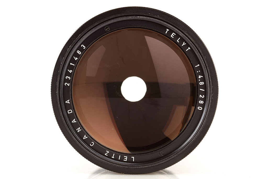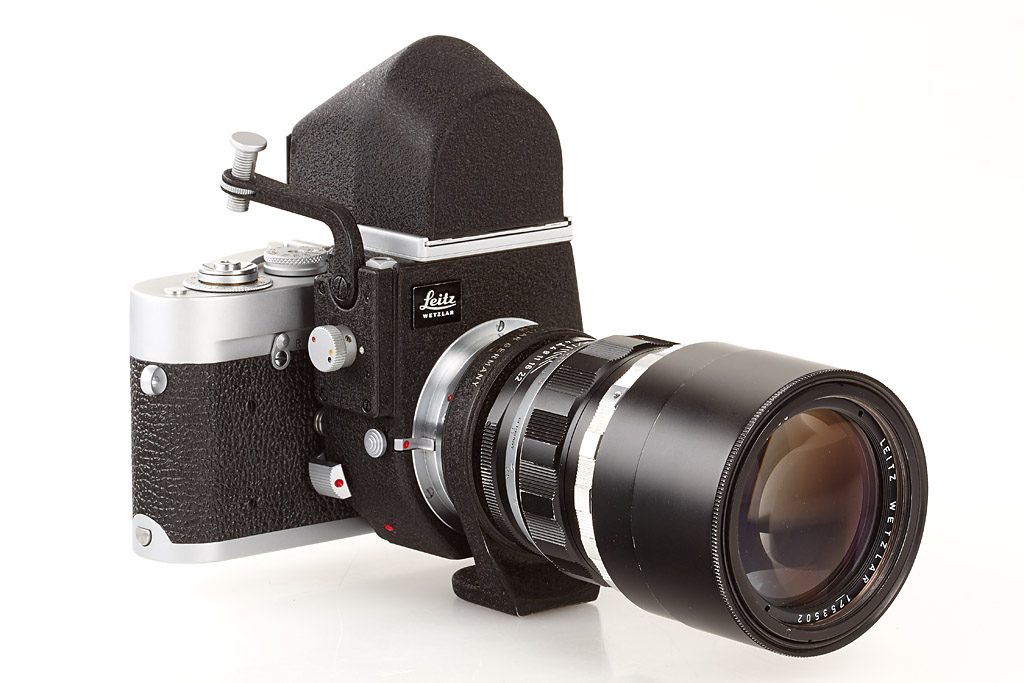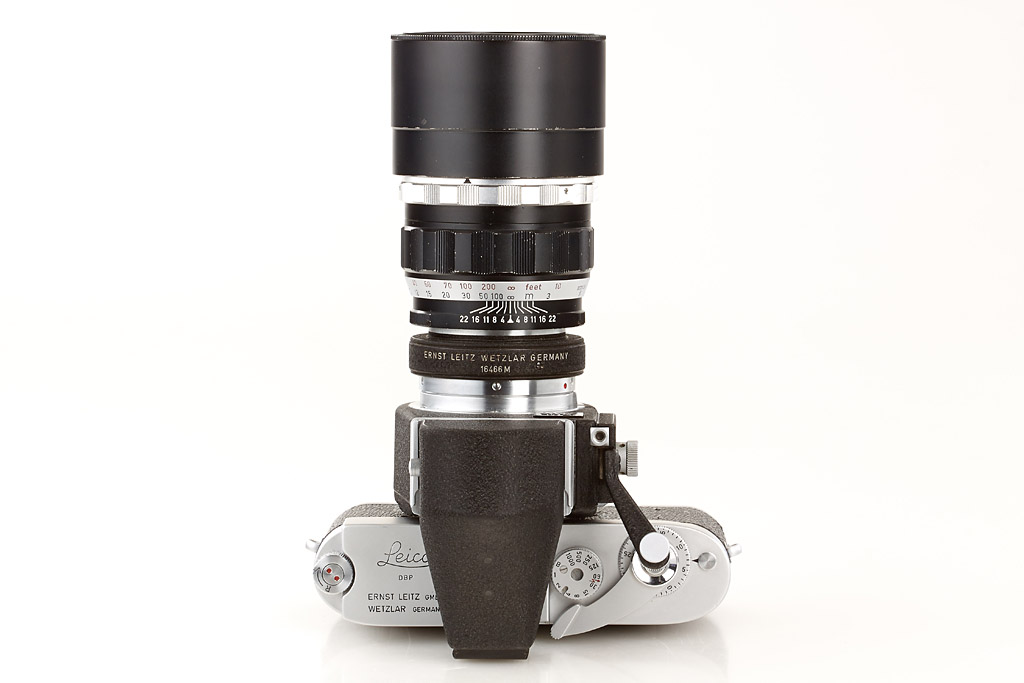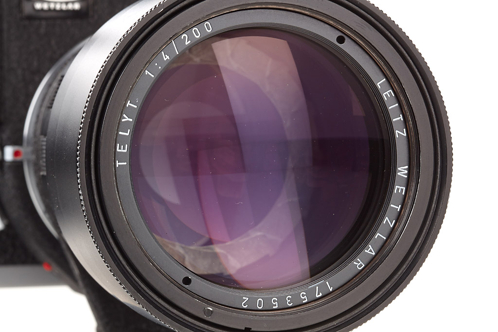 body in good working order with Visoflex III with black logo, 16499 prism, -2.5 dioptre, OUBIO 16466M adapter, Telyt 4/200mm no.1753502 (good lenses, cap), black Elmar 3.5/65mm lens head no.2379049 (clean lenses, cap), late M-mount Telyt 4.8/280mm no.2341483 (caps, maker's box)