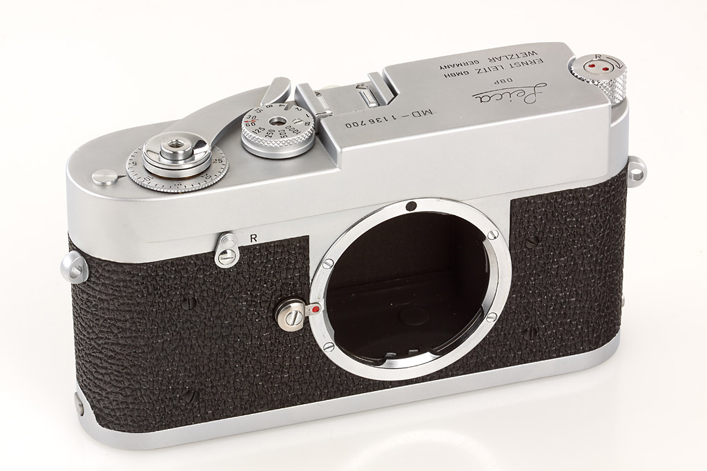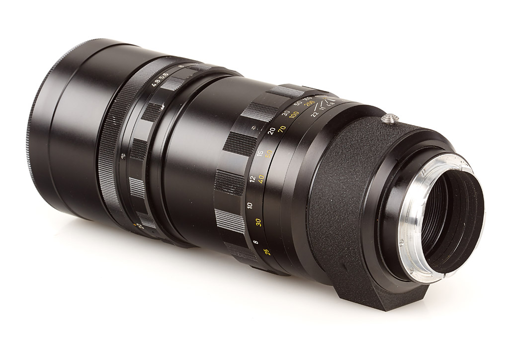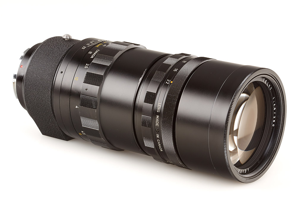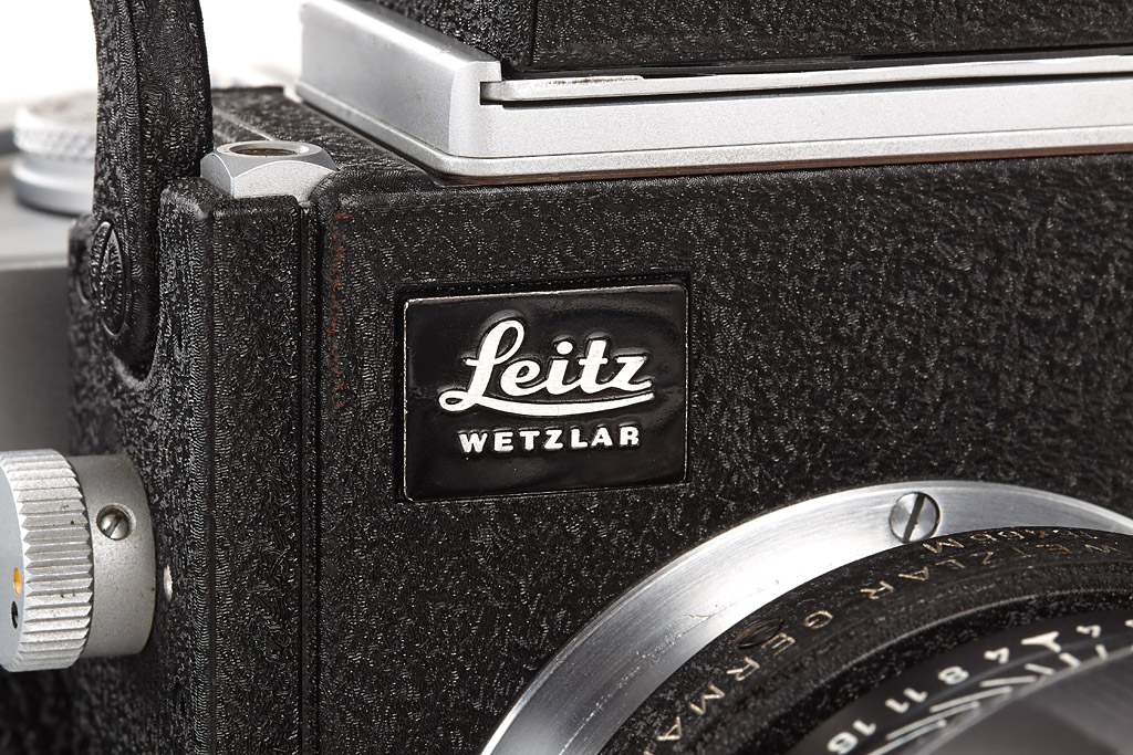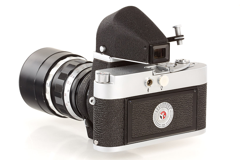 body in good working order with Visoflex III with black logo, 16499 prism, -2.5 dioptre, OUBIO 16466M adapter, Telyt 4/200mm no.1753502 (good lenses, cap), black Elmar 3.5/65mm lens head no.2379049 (clean lenses, cap), late M-mount Telyt 4.8/280mm no.2341483 (caps, maker's box)