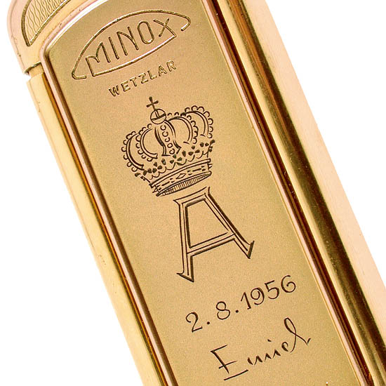 9.5mm, gold type finish plated brass body engraved with crown emblem and letter A below, dated 2.8.1956, indistinctly marked Emiel, in crocodile skin case with gold finish chain