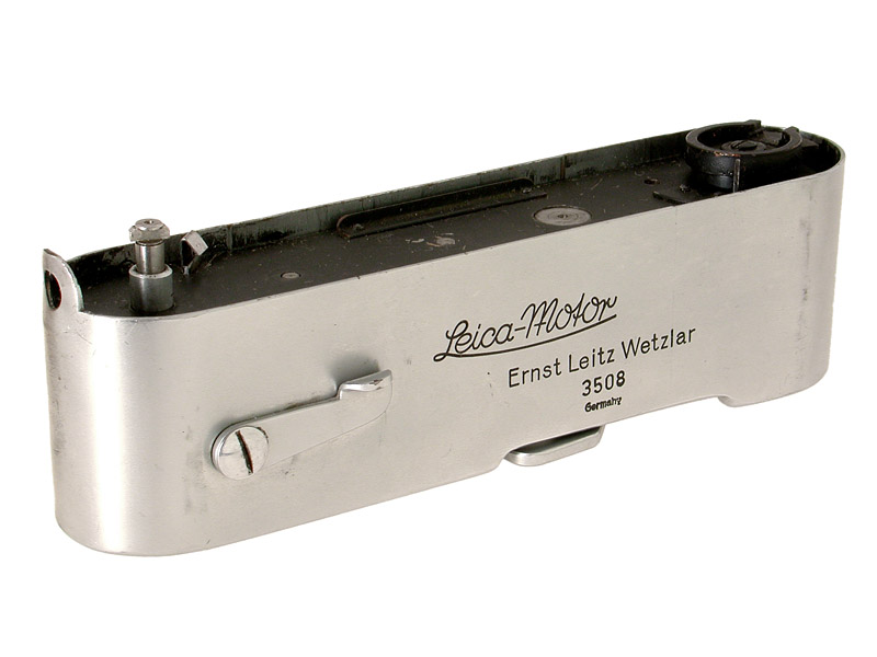Spring wound motordrive MOOLY-C in chrome, prototype of the long base MOOLY, with longer chassis and internal coupling for Leica models IIIc and IIId, the regular MOOLY-C series starts with serial no.5001, whereas this one is from a small pre-series of 30 units (serial no. 3501 to 3530) which were made 1940 and are marked in the Leitz Wetzlar shipping records MOOLY für Gusskamera (Guss meaning the die-cast body of the Leica IIIc and IIId)