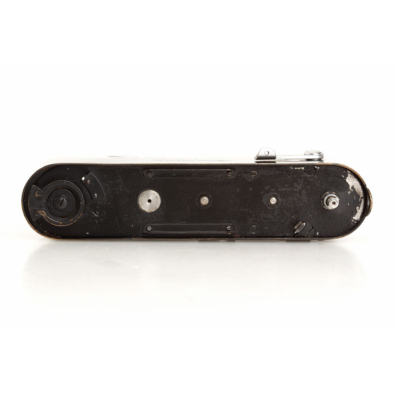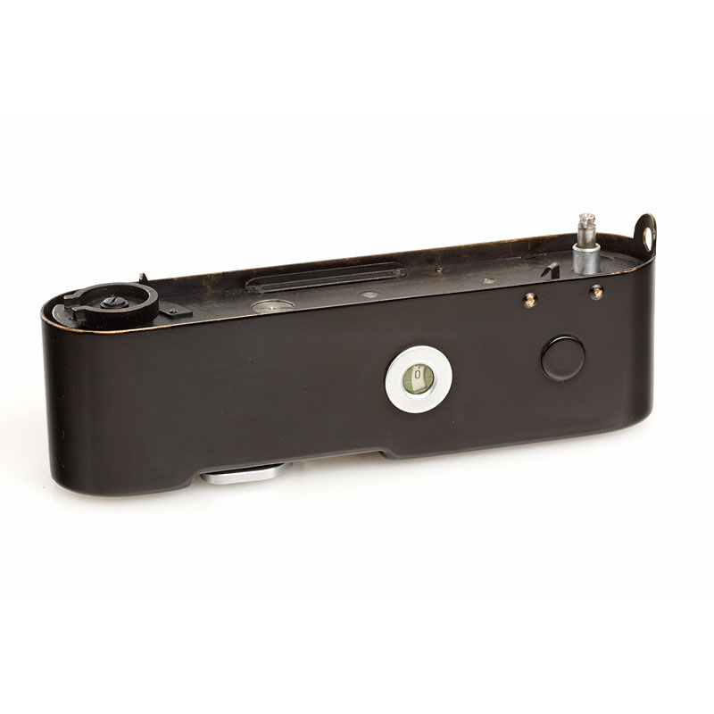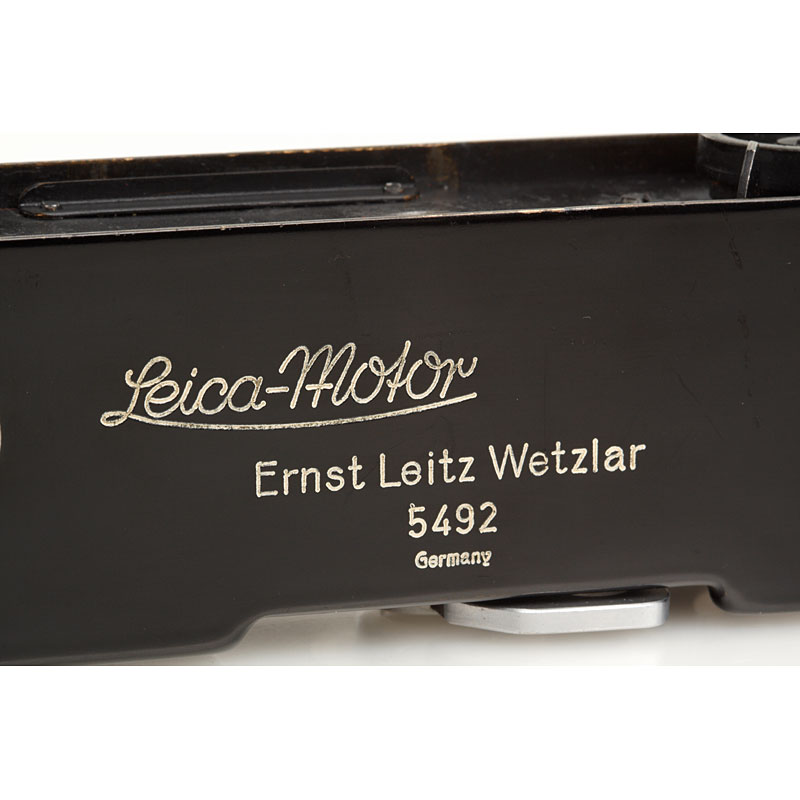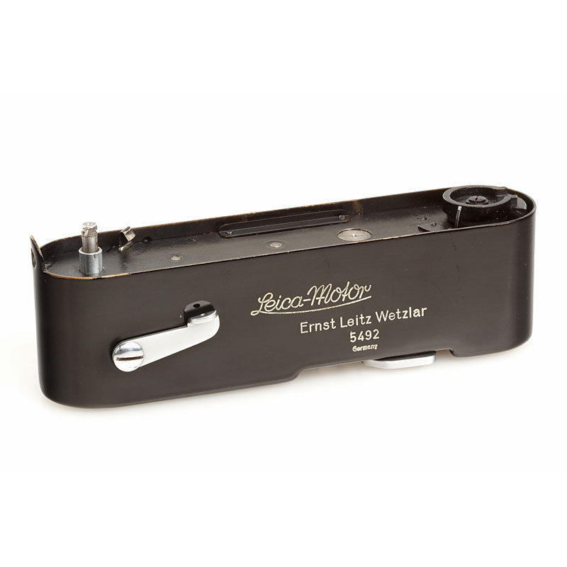 war-time spring motor drive Mooly-C in black paint with internal coupling for Leica models IIIc and IIId, in perfect working order and original condition, engraved 'Germany', red maker's box
