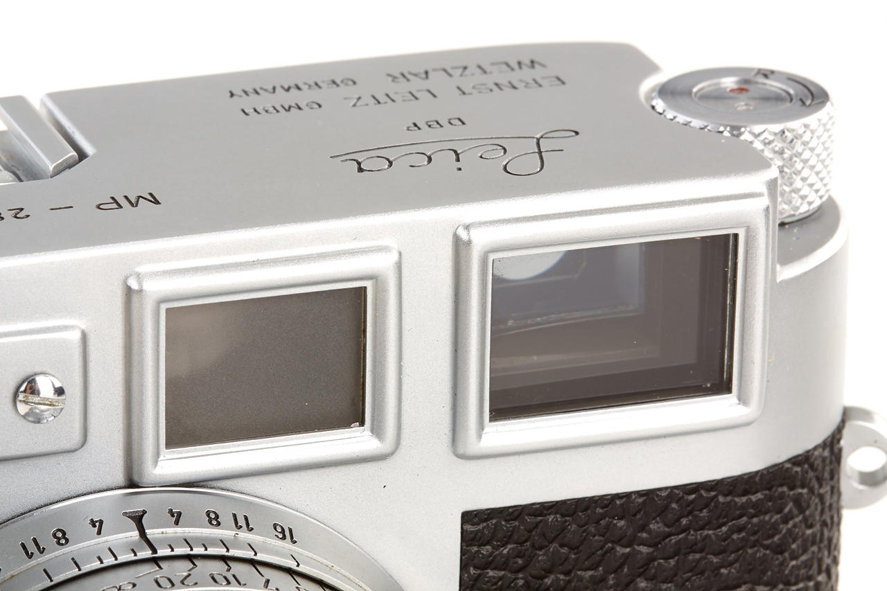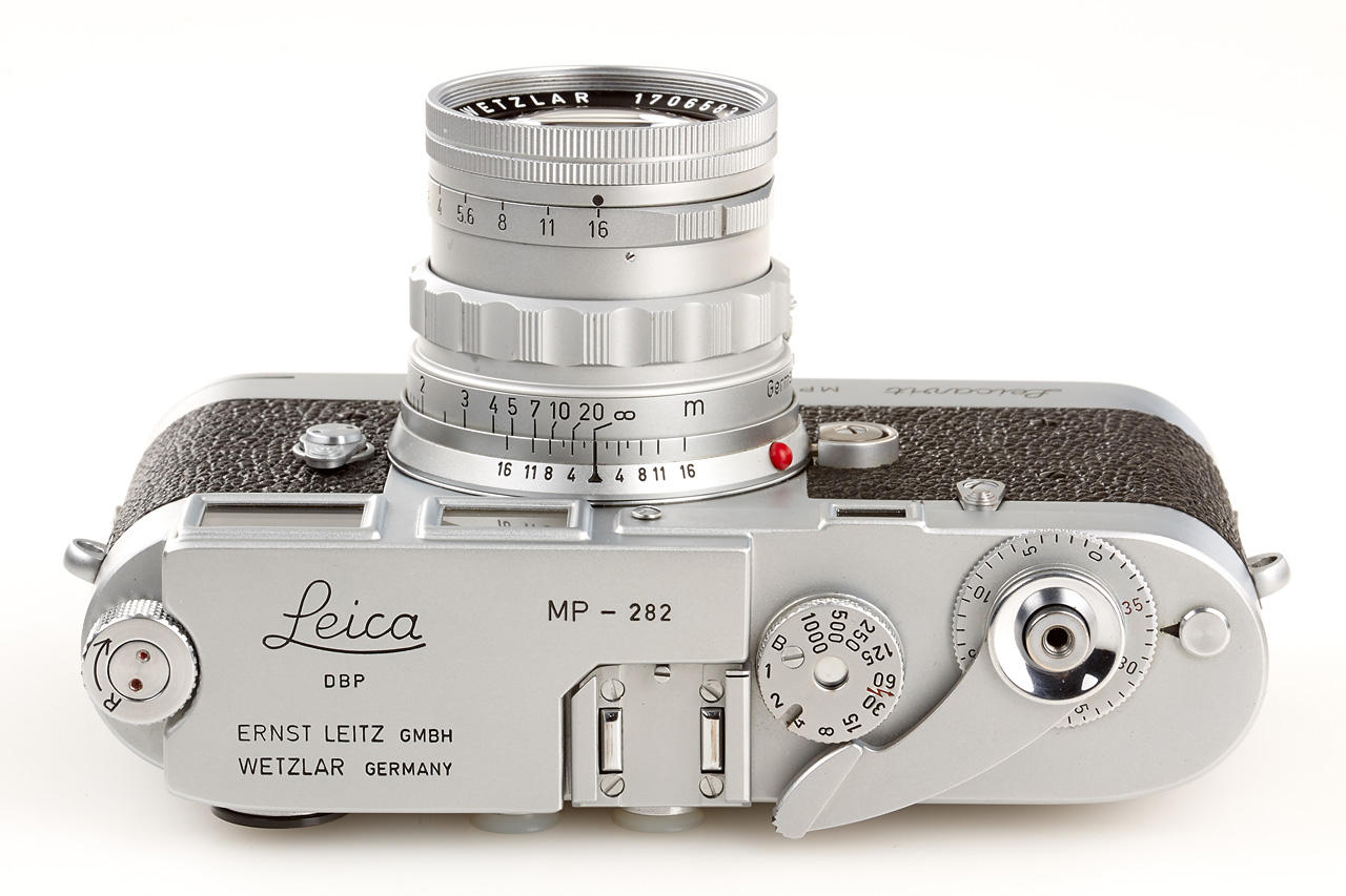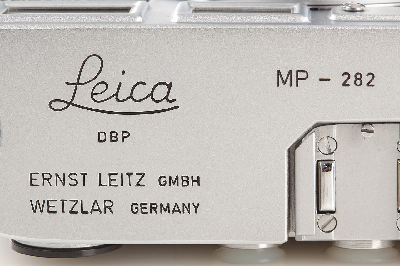 original Leica MP (top plate and body shell restored by Leitz in the 70th), fully original chassis engraved with matching number P-282, in perfect working condition, with chrome Leicavit MP in original (B+) condition, rigid Summicron 2/50mm no.1706583 (cap), only around 260 chrome MP's were made, because of professional usage, many were upgraded with later parts during factory repairs - approved by Ottmar Michaely