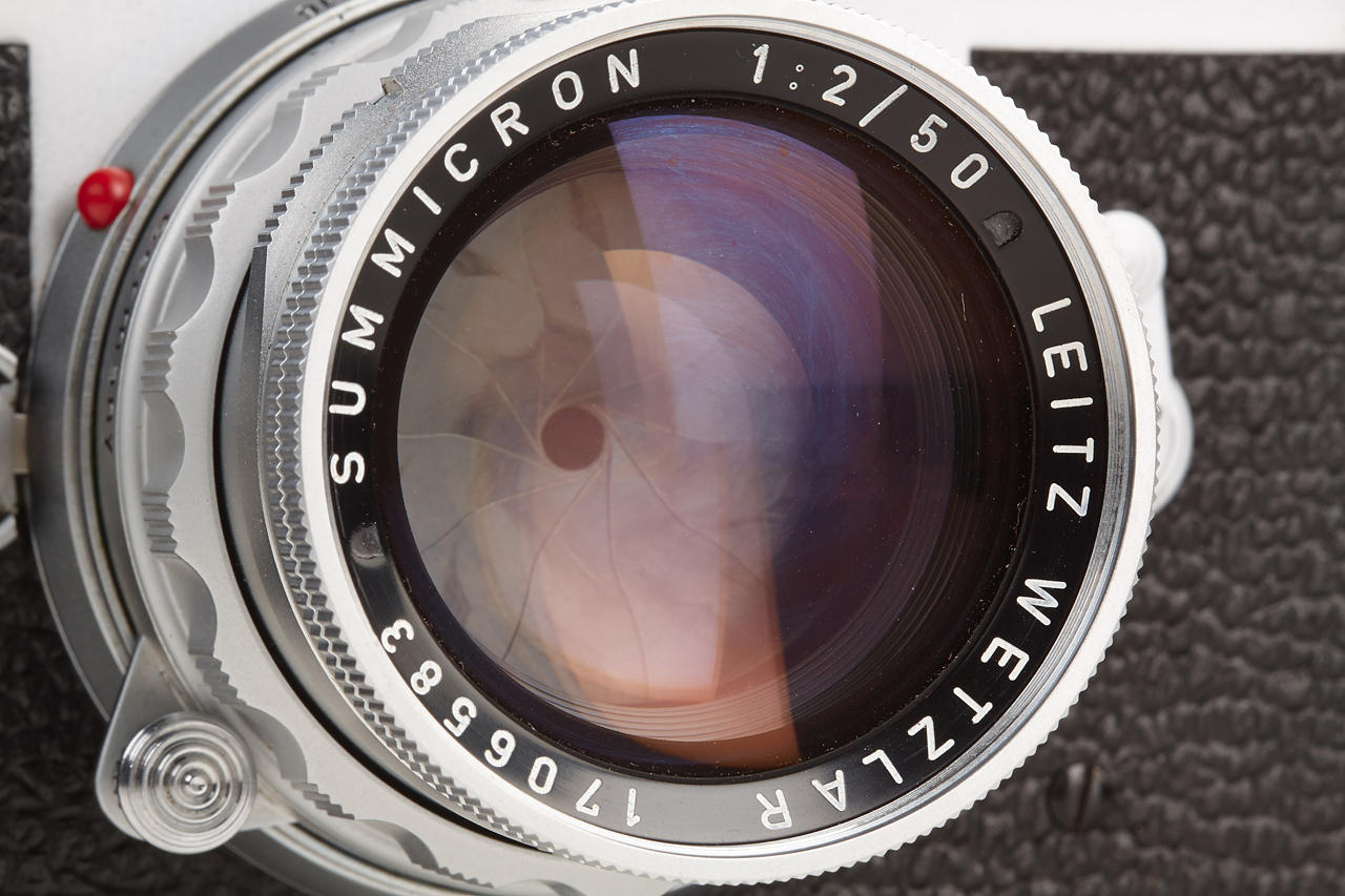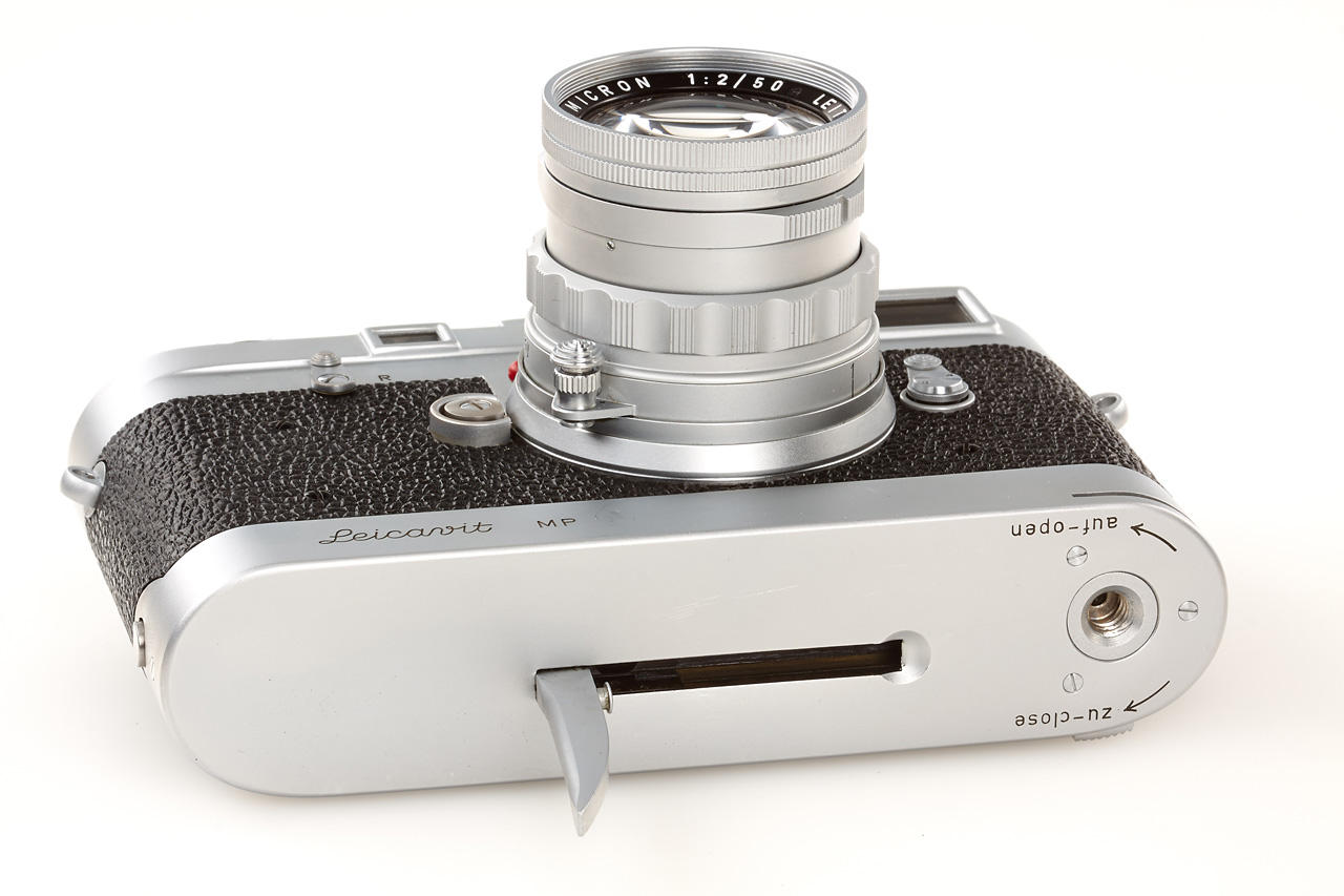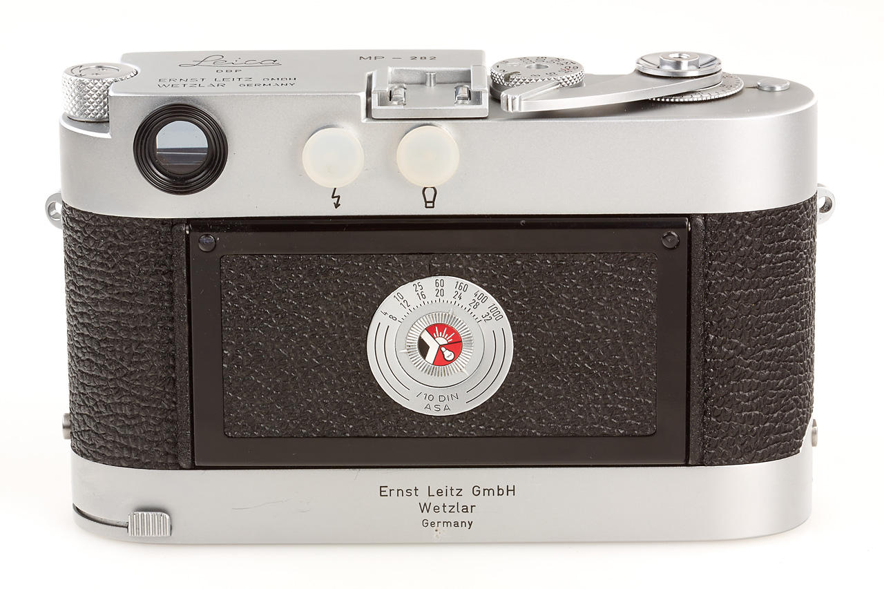 original Leica MP (top plate and body shell restored by Leitz in the 70th), fully original chassis engraved with matching number P-282, in perfect working condition, with chrome Leicavit MP in original (B+) condition, rigid Summicron 2/50mm no.1706583 (cap), only around 260 chrome MP's were made, because of professional usage, many were upgraded with later parts during factory repairs - approved by Ottmar Michaely