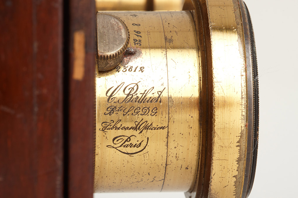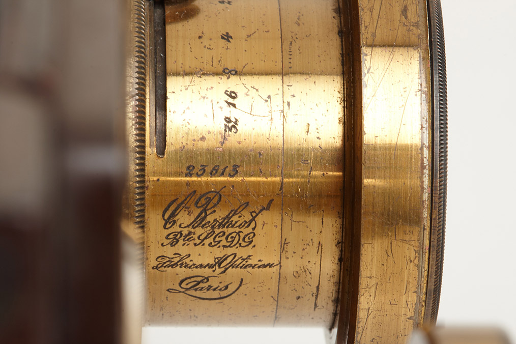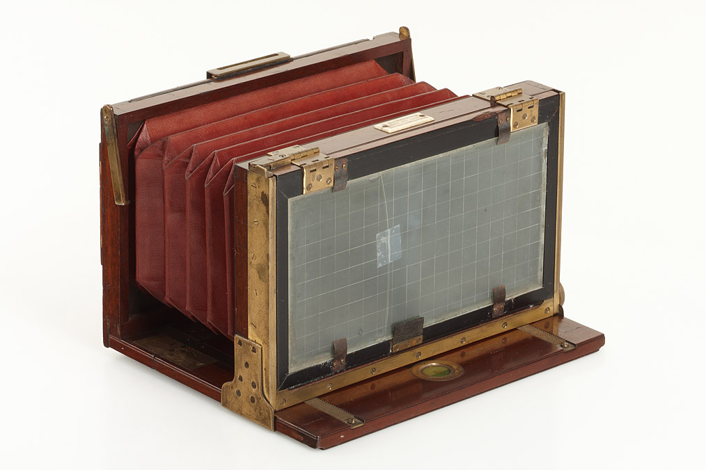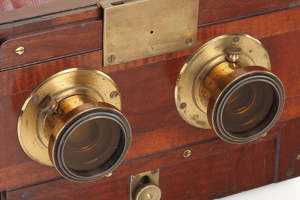 mahogany stereo camera for 9x18cm exposures, red leather bellows, with Som Berthiot lenses No.1 f/7, focusing screen broken, maker's plaque: H.MACKENSTEIN Const. BTE. SGDG 15 R des Carmes Paris, very decorative