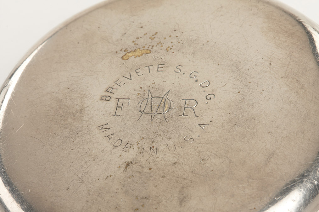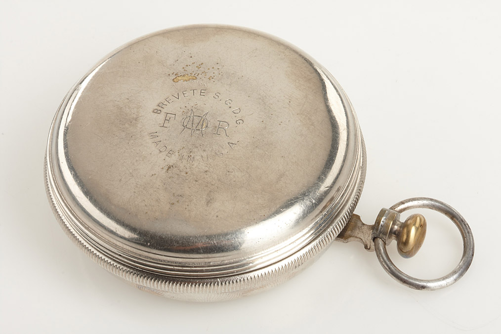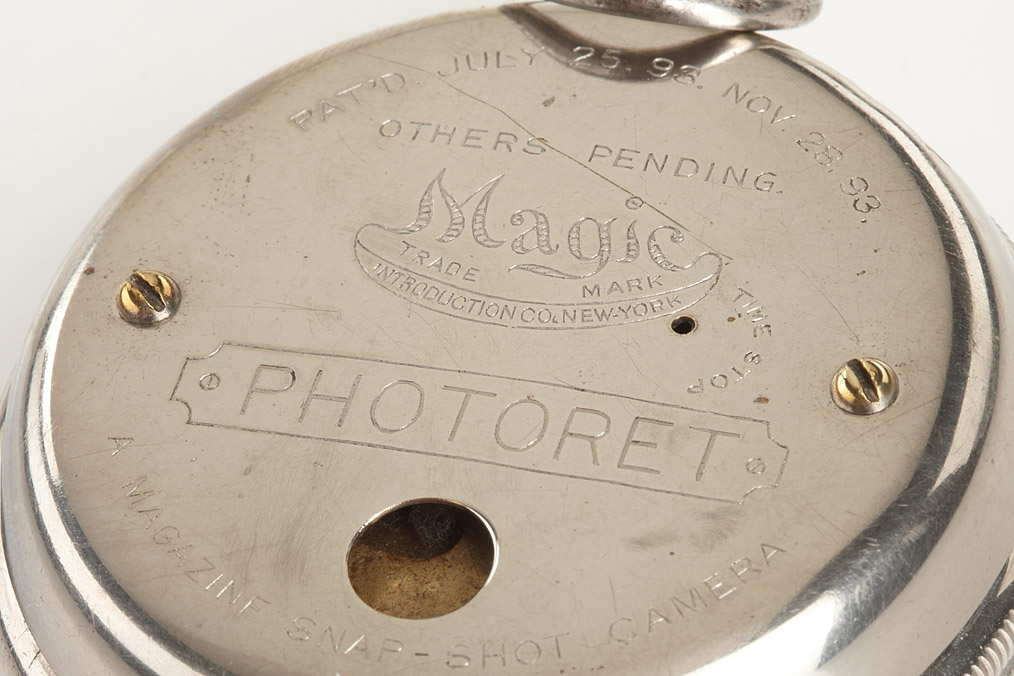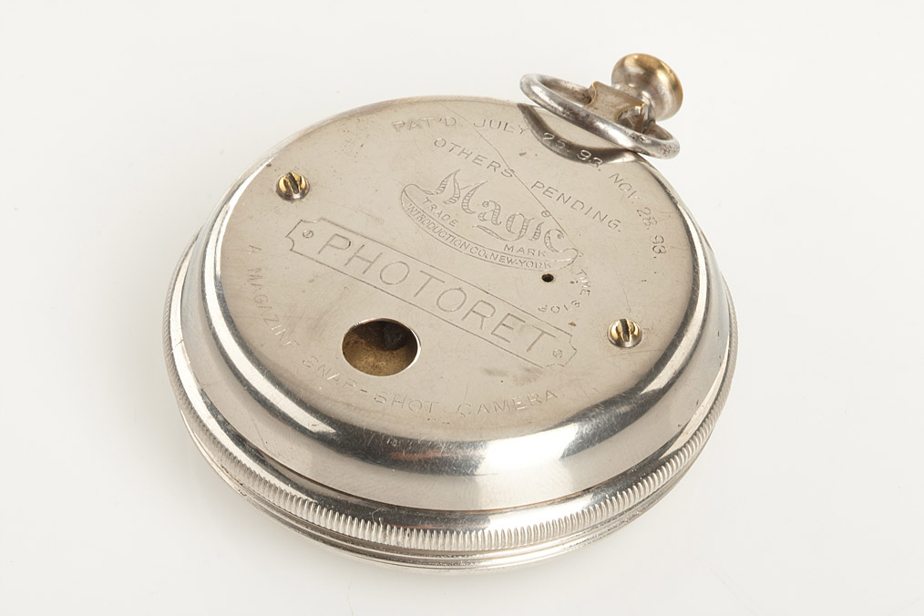 pocket-watch camera for 6 exposures 12x12mm on round sheet film, in good condition, 3x original round negatives each with 6 exposures in original metal box