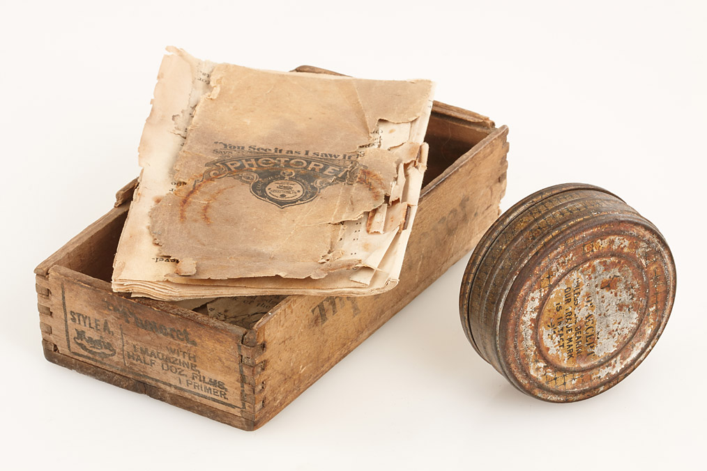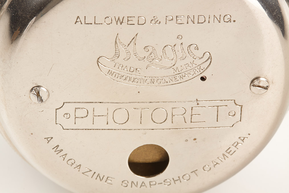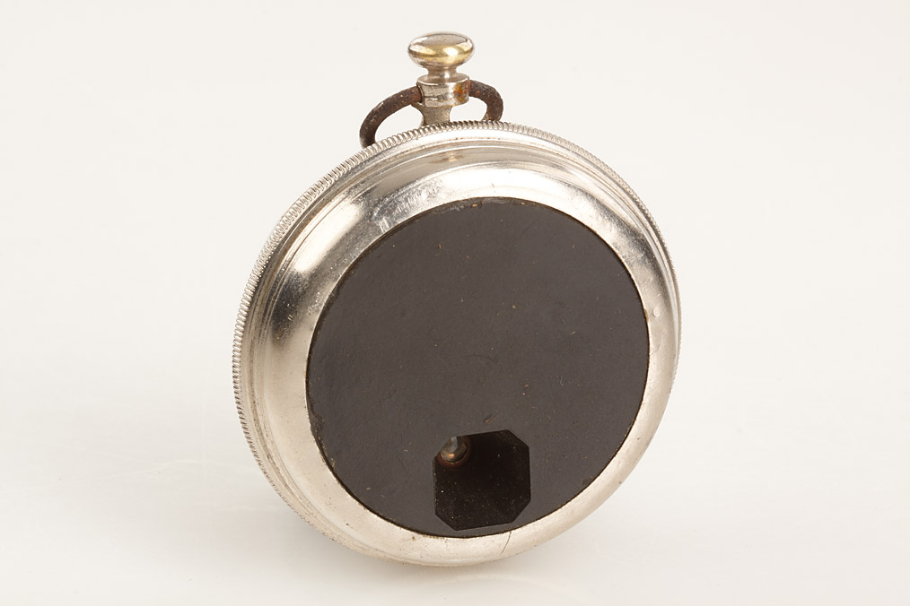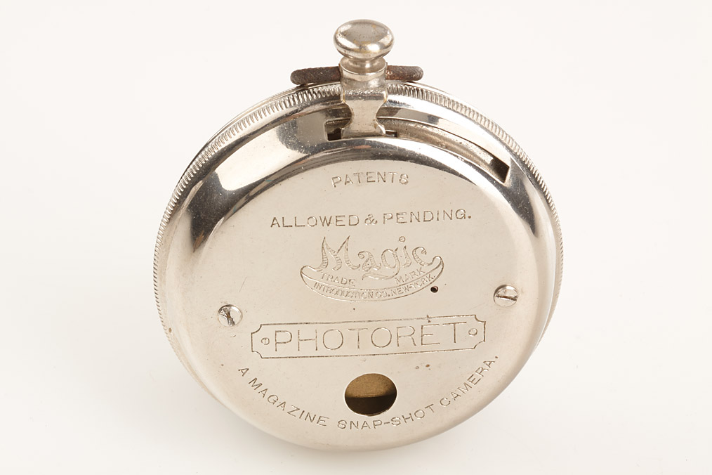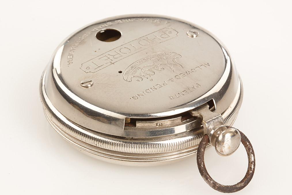 pocket-watch camera for 6 exposures 12x12mm on round sheet film, in good condition, with original instruction book, part of wooden maker's box and metal film container