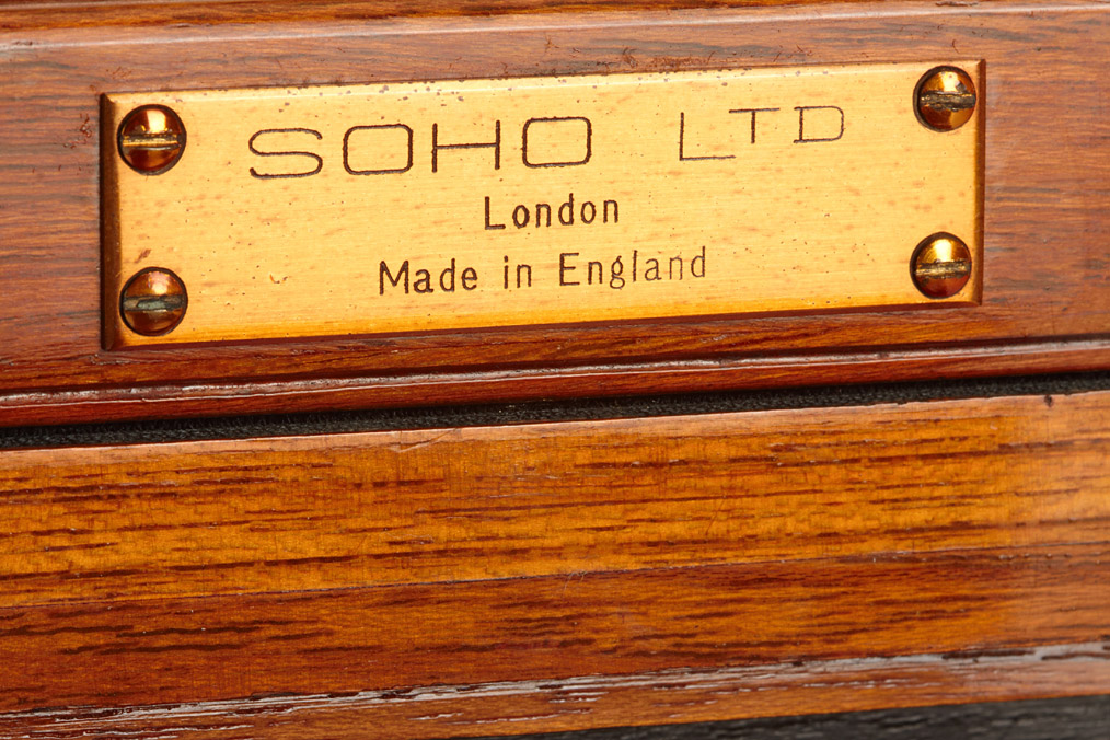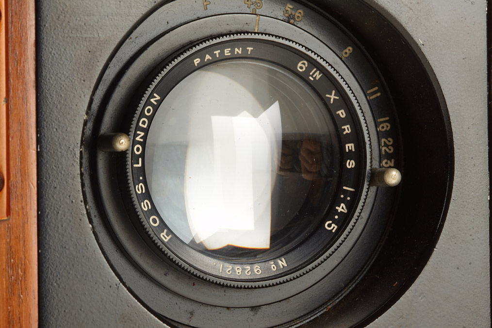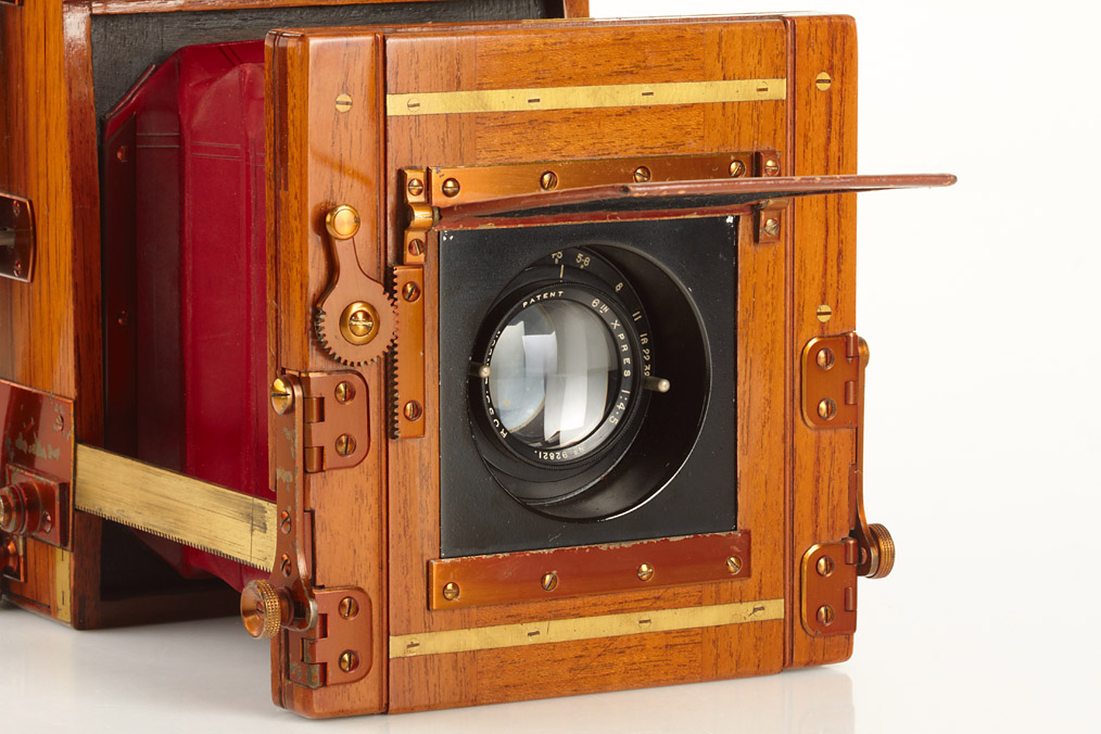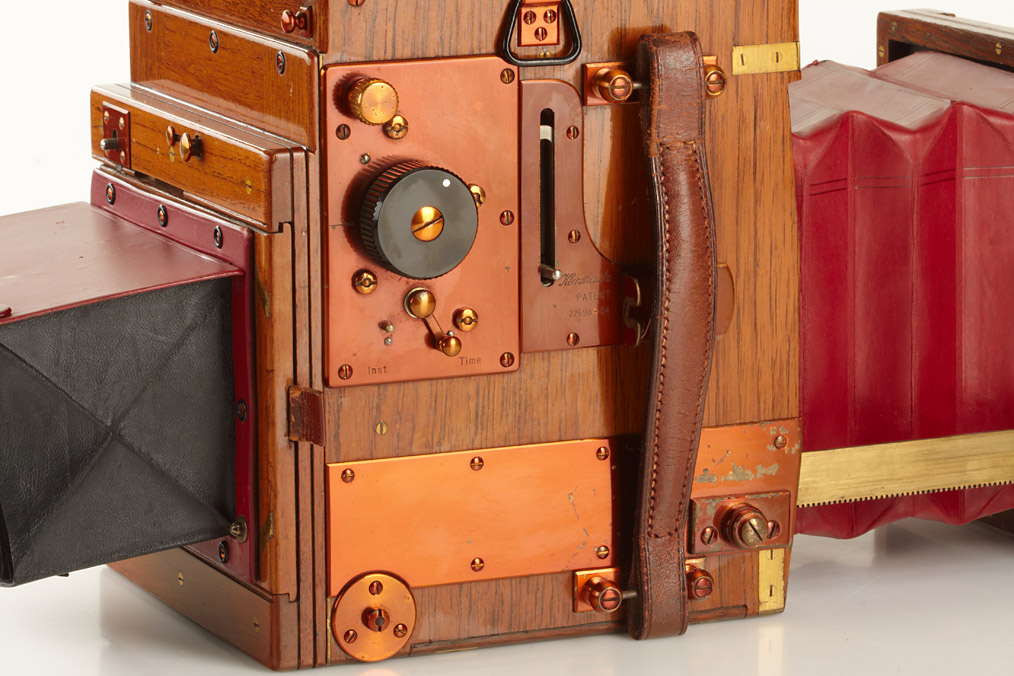 2 1/2 x 3 1/2" tropical reflex camera in very good original condition with Ross Xpres 4.5/6" no.92821, polished teak with brass, red leather bellows, focal-plane shutter (needs service), with original focusing screen adapter, 3 film holders, film pack holder, cable release, case - a very fine and rare outfit