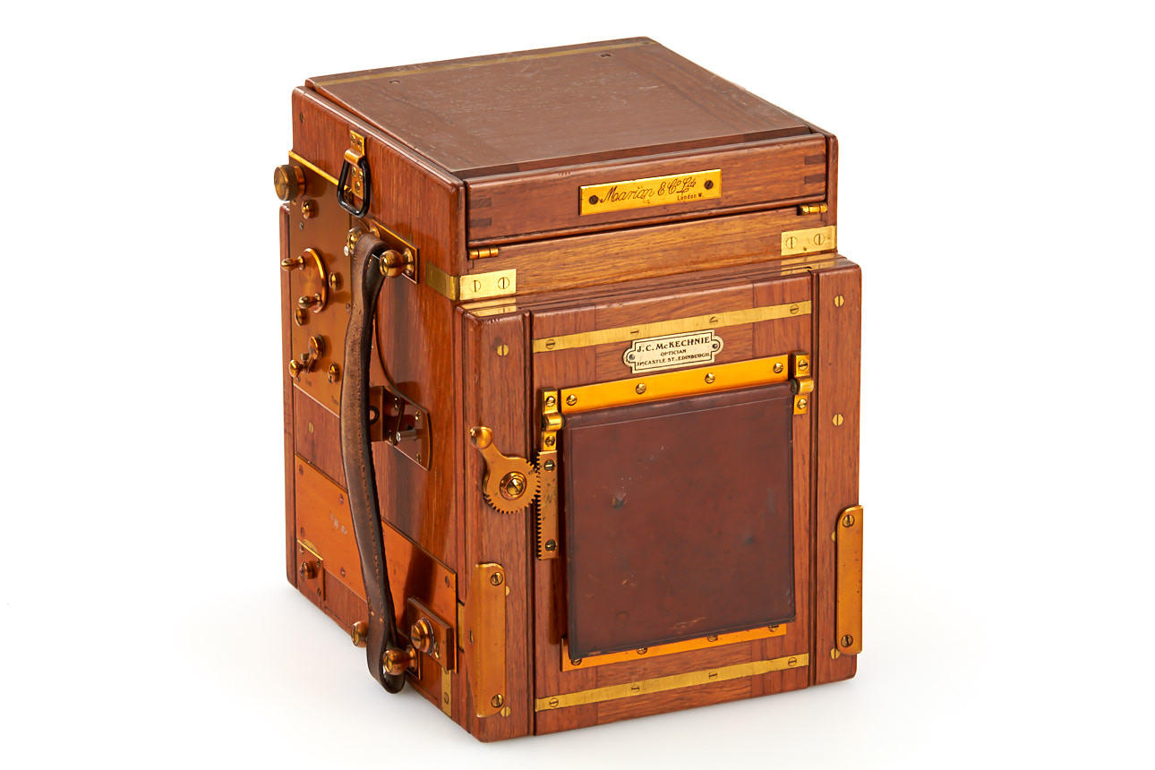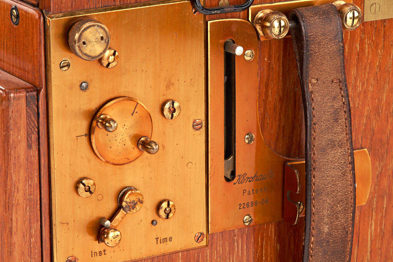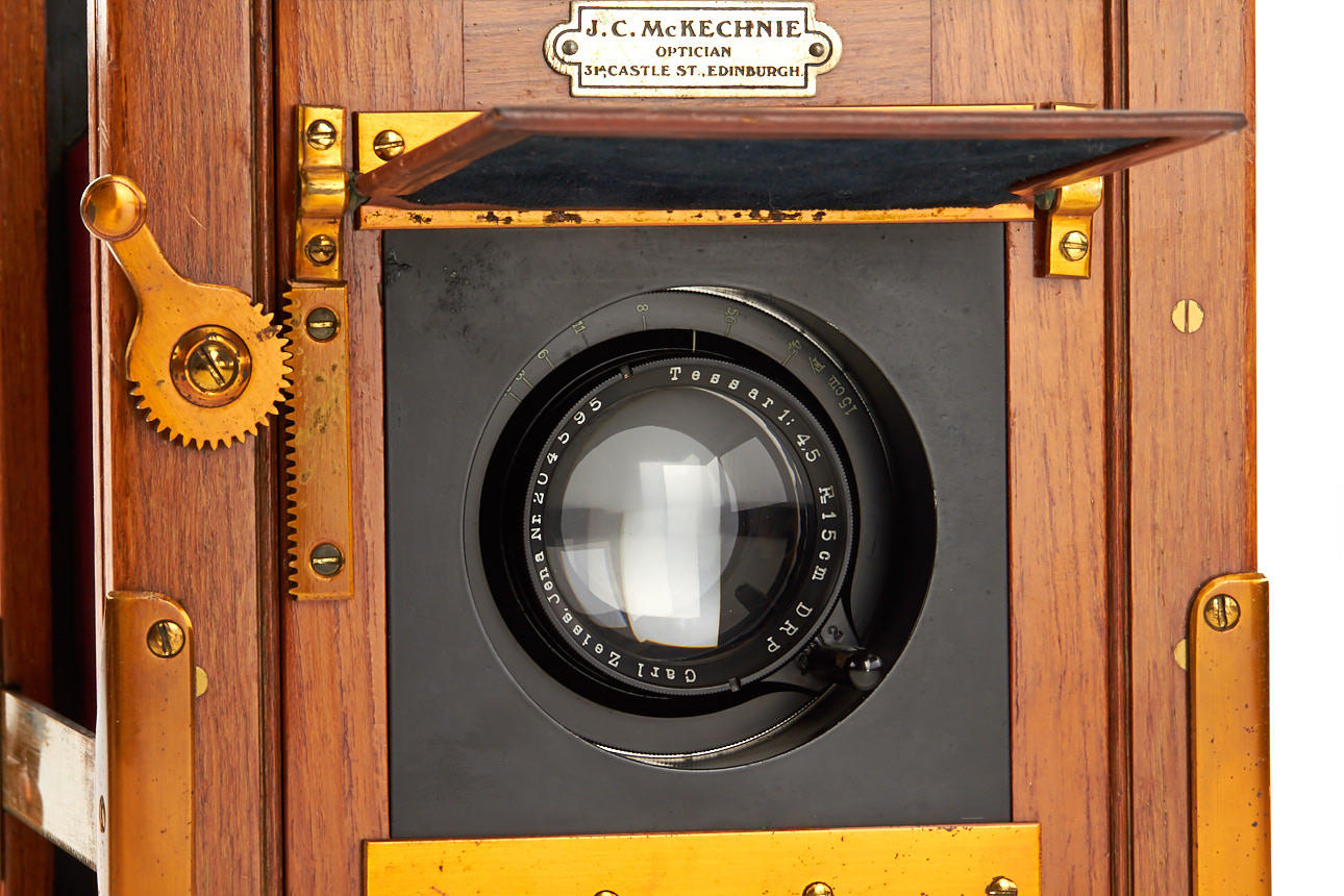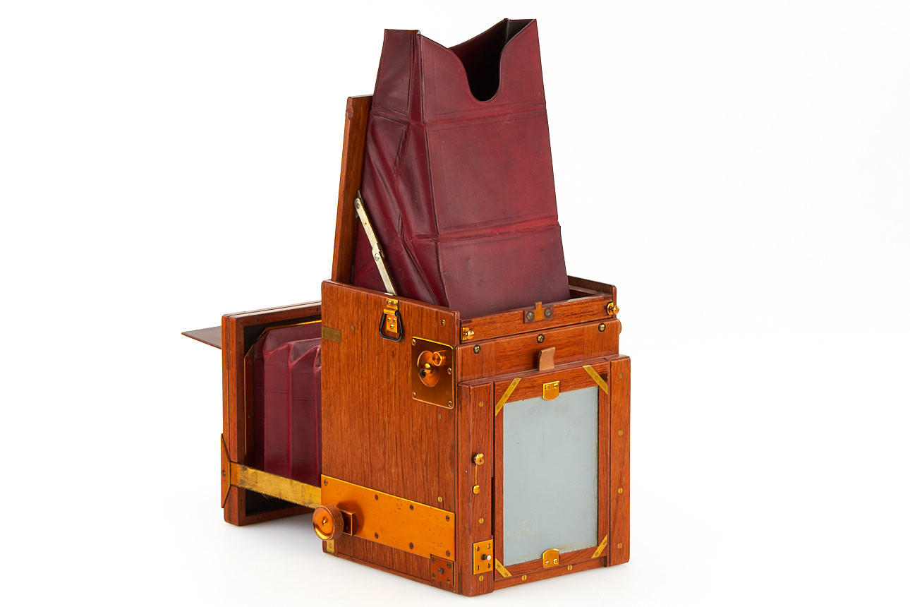 9x12cm tropical reflex camera in beautiful condition, with Tessar 4.5/15cm no.204595, polished teak with brass fittings, brown leather bellows, focal-plane shutter (not operable), one of the best examples we have seen
