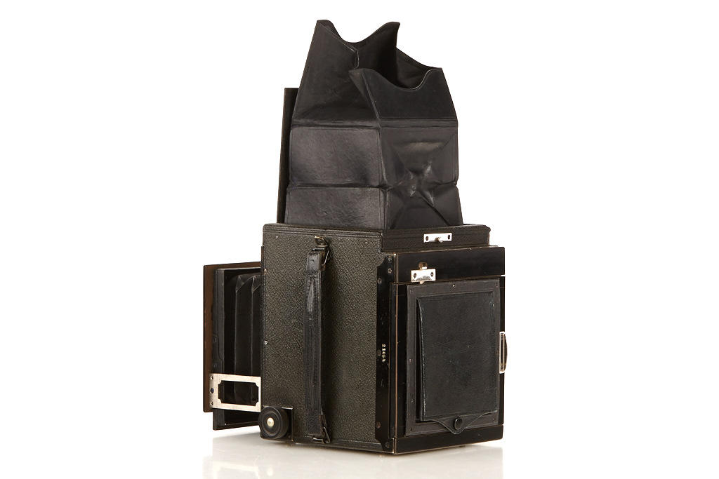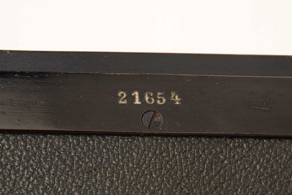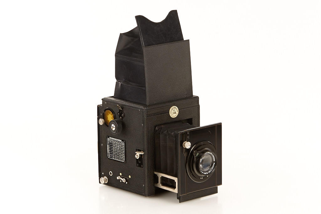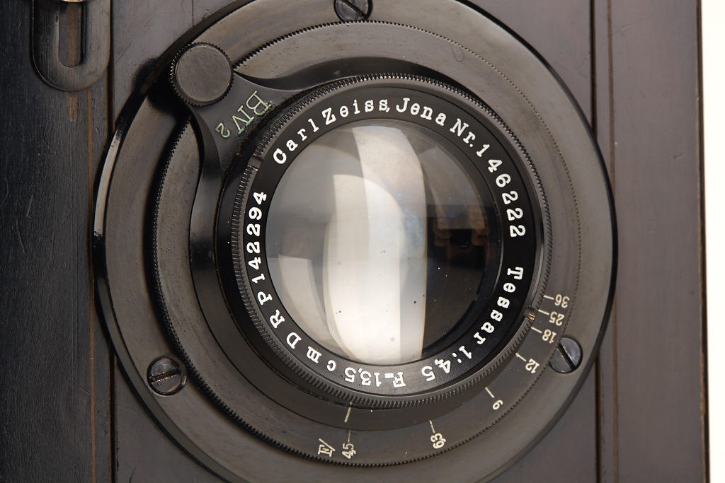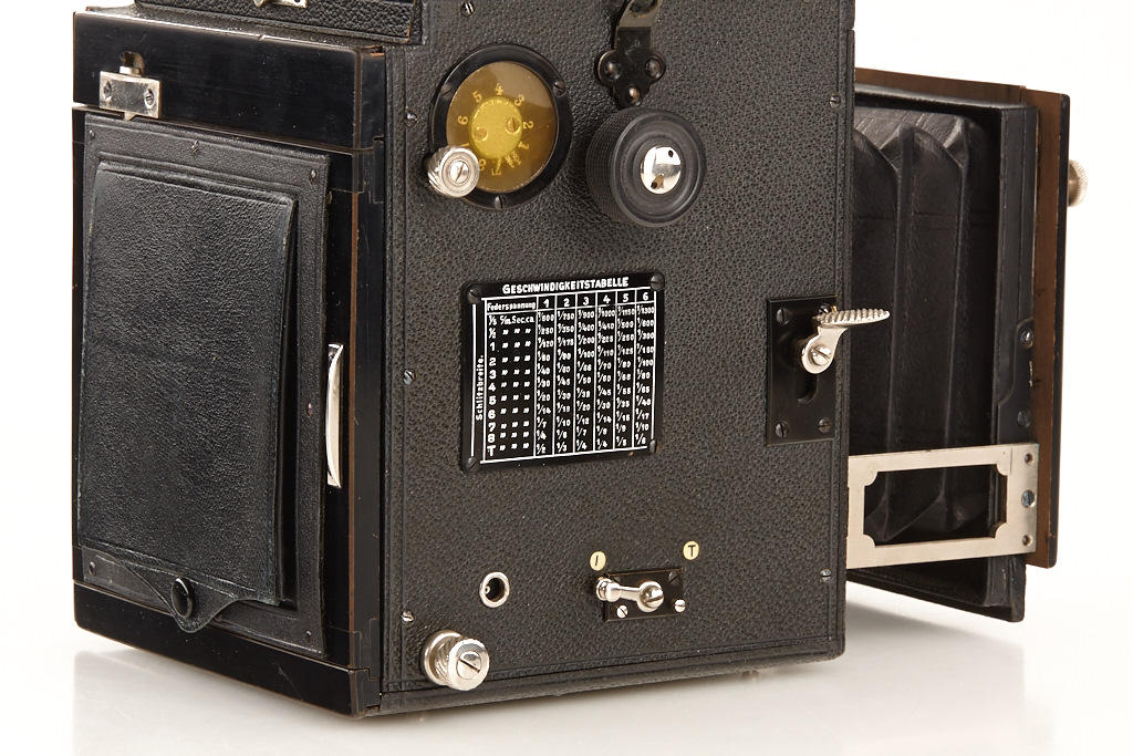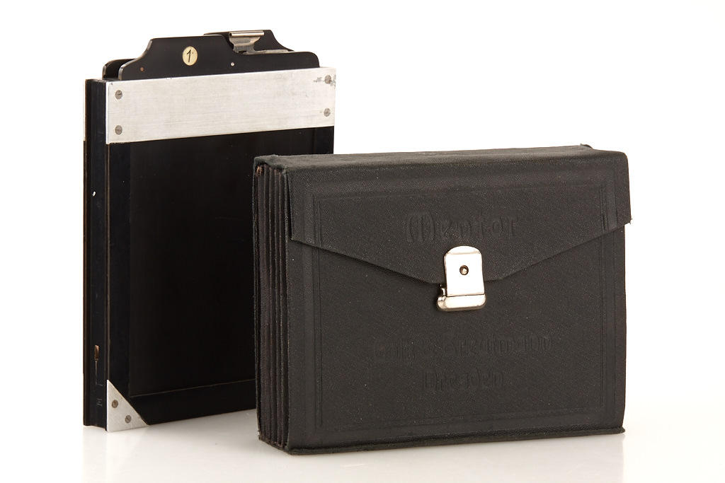 9x9cm, in near mint original condition, focal plane shutter (working but not accurate and dry) for speeds up to 1/1300, Tessar 4.5/13.5cm no.146222 in helicoid focusing mount (cap), 6 original film cassettes in case, double plate film holder