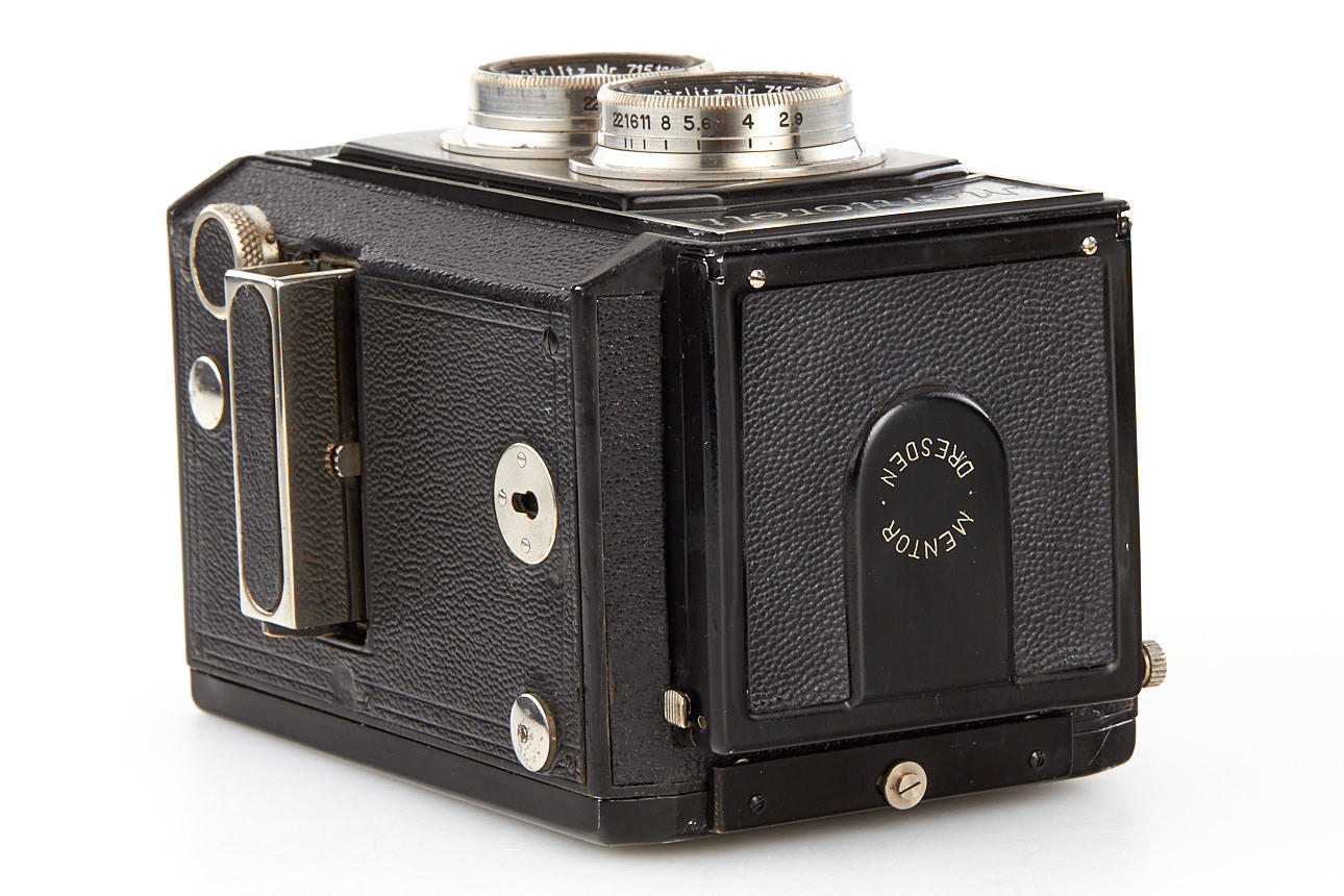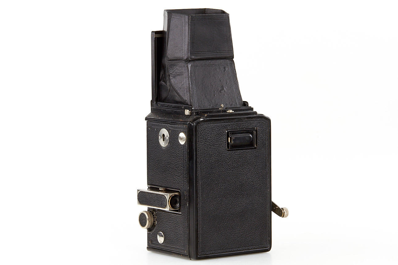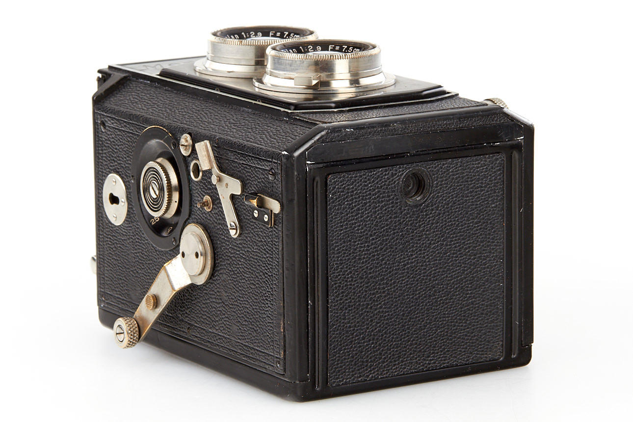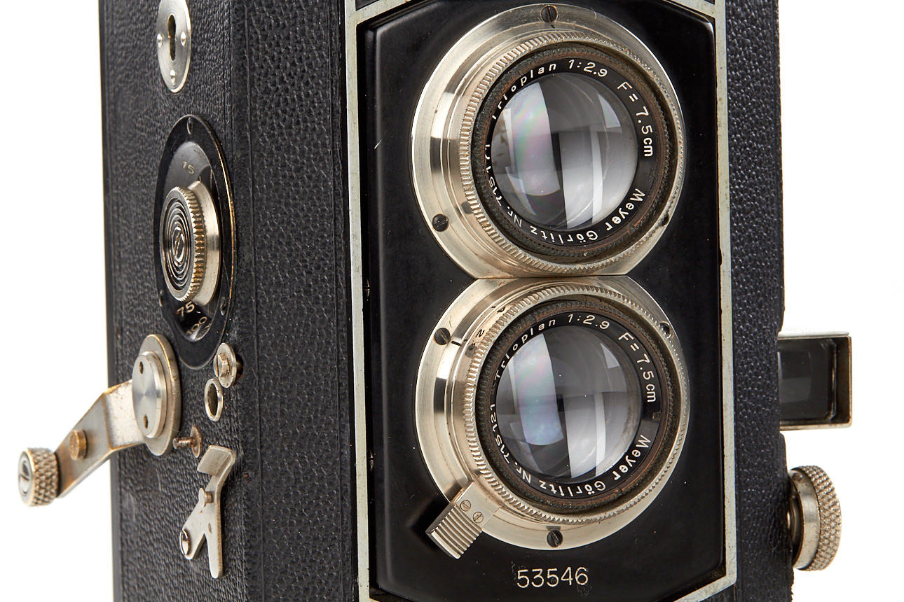 advanced TLR camera for 6x6cm exposures on 120 film, focal plane shutter, iris diaphragm in both taking and viewing lens for DOF preview, additional viewfinder on the camera left side, with dual Trioplan 2.9/7.5cm no.715171 and 715121, leather case, in excellent condition