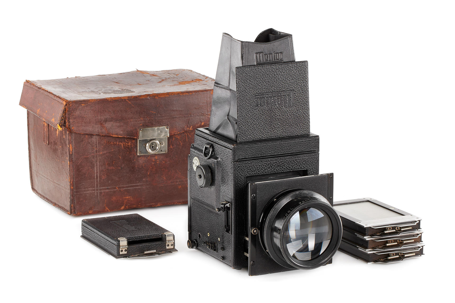 very rare SLR camera for 6.5x9cm, in beautiful, near-mint condition, with ultra-fact Rietzschel Prolinear 1.9/13.5cm no.162390 (very good optics), lens cap, three film cassettes and worn leather case