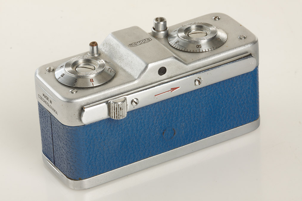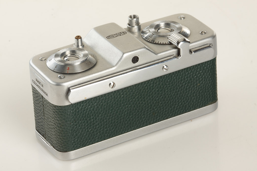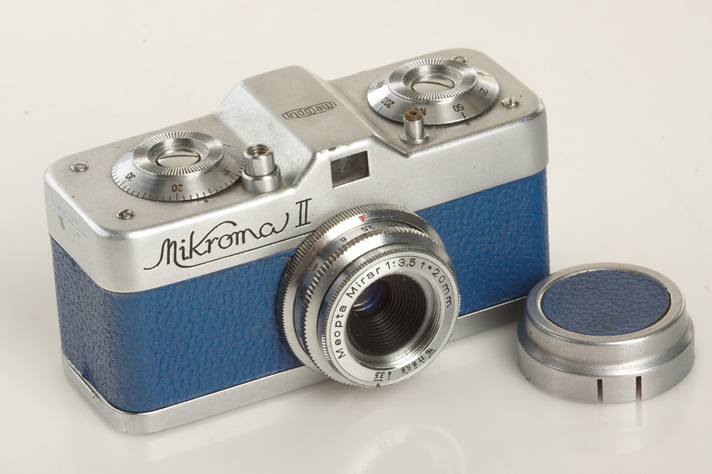 3 cameras in different colours (green, red, blue) with standard lenses, cases, spools, repro stand with lenses in maker's box, instructions book