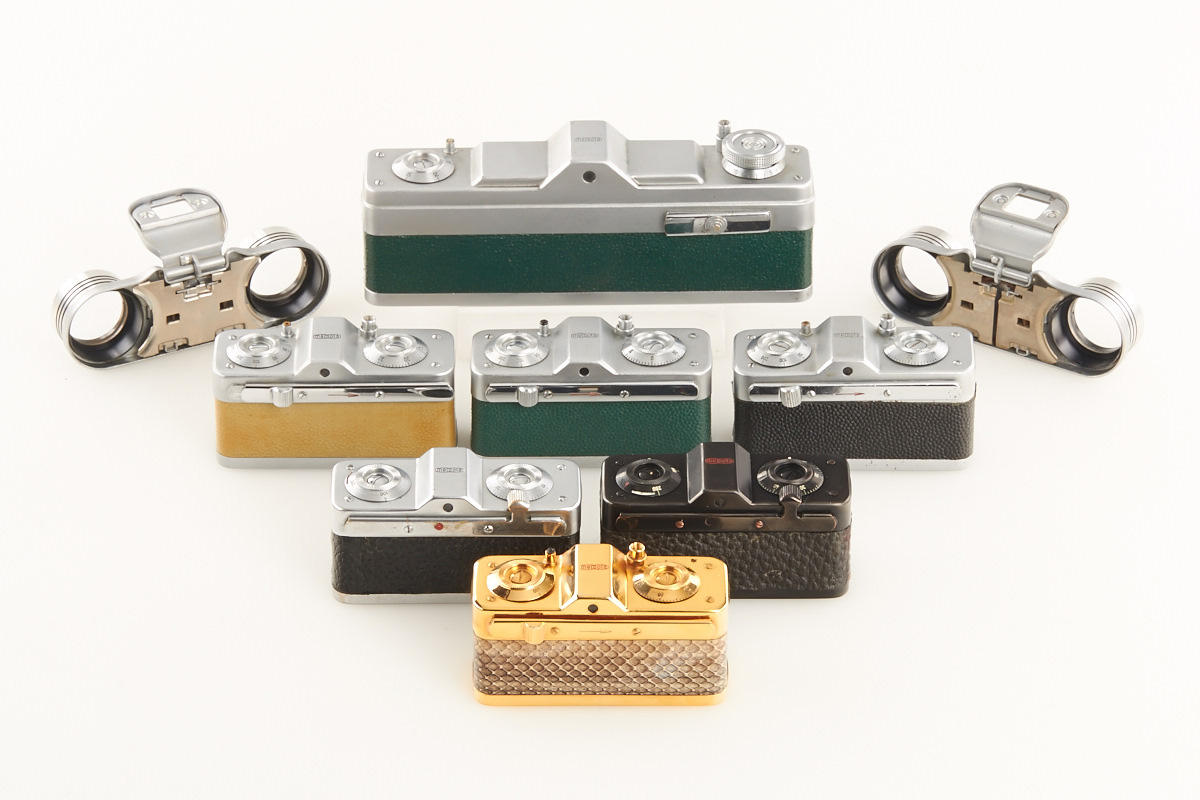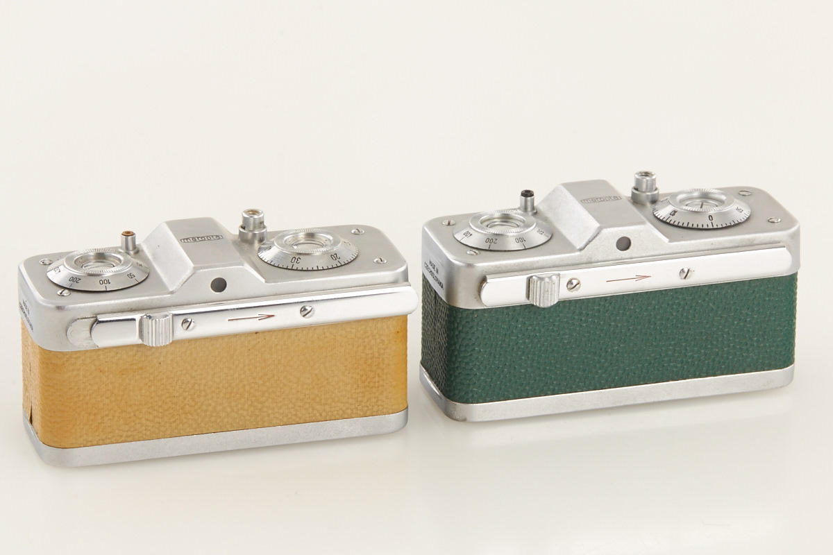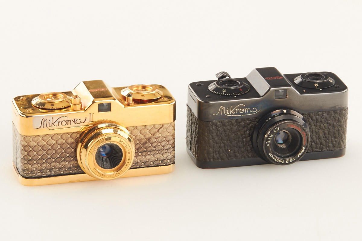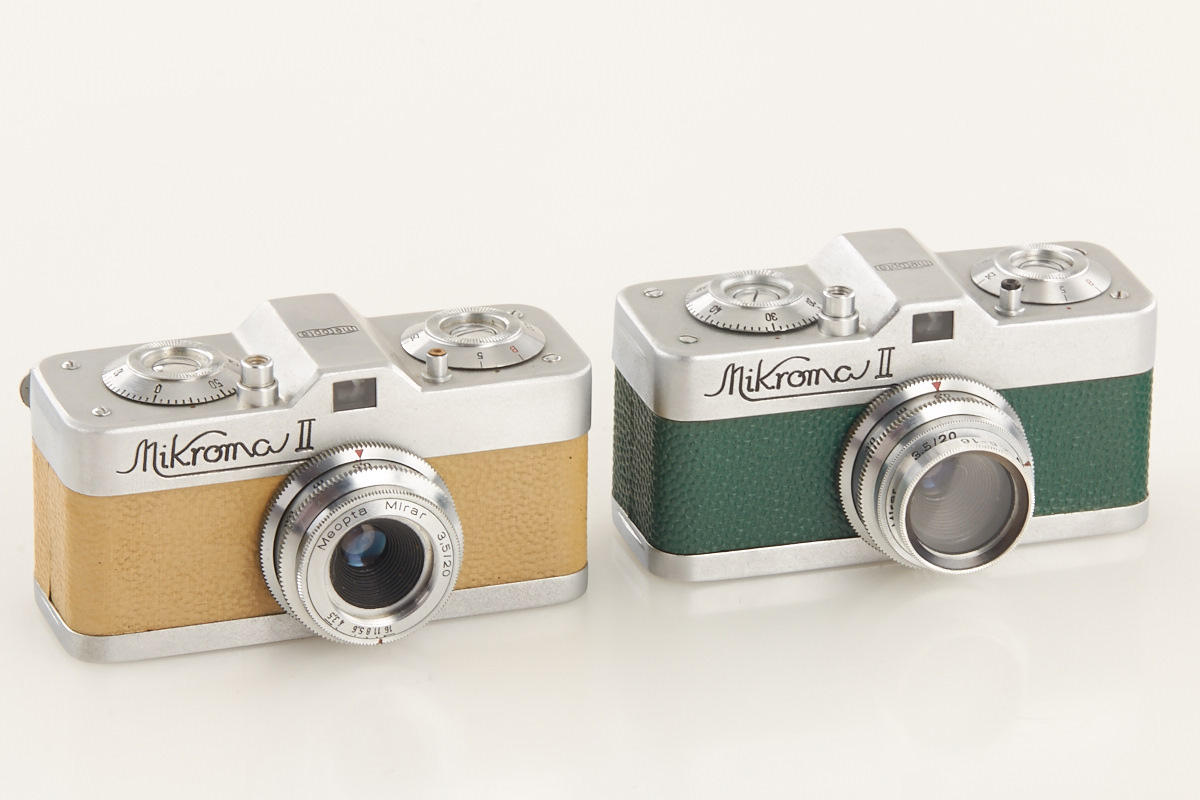 lot of seven various Mikroma cameras: (1) very rare Mikroma I black no.432228 made for Czechoslovakian police, (2) Mikroma I 4312056 with black leather covering, (3) Mikroma II gold no.10110413 with snake skin covering, (4) Mikroma II no.27608 with green leather covering, (5) Mikroma II no.26563 with yellow leather covering, (6) Mikroma II with black leather covering and very uncommon 'snapshot' lens with fixed focus and aperture, (7) Stereo-Mikroma with green leather covering and two close-up lenses, all cameras with leather cases, incl. mint close up device in maker's box