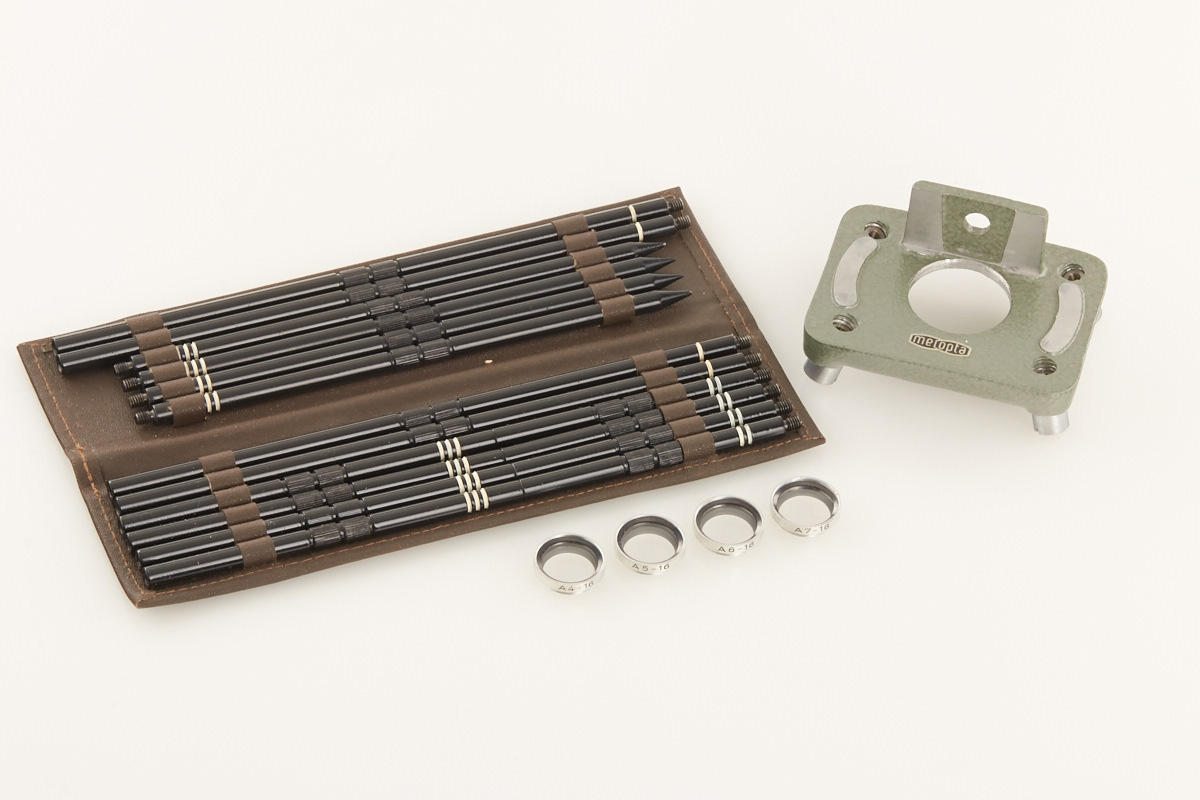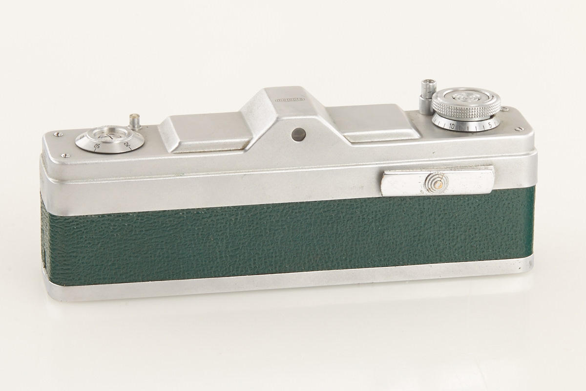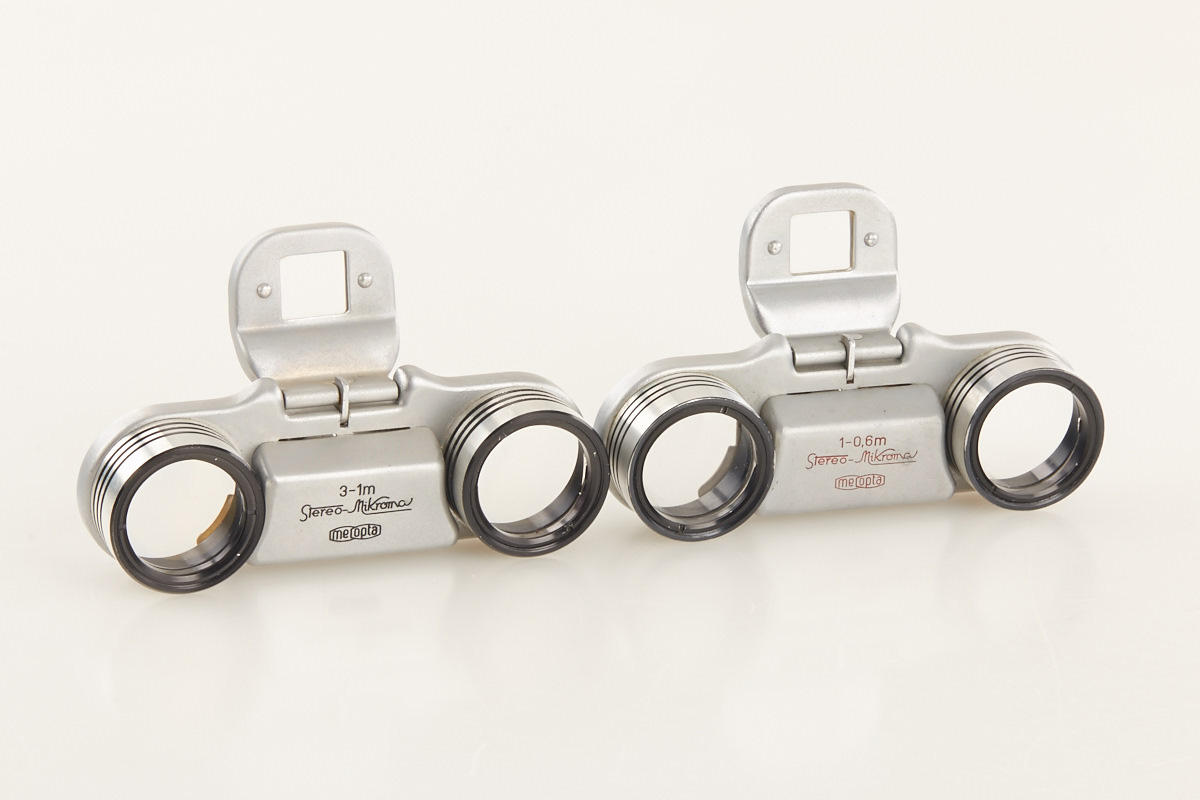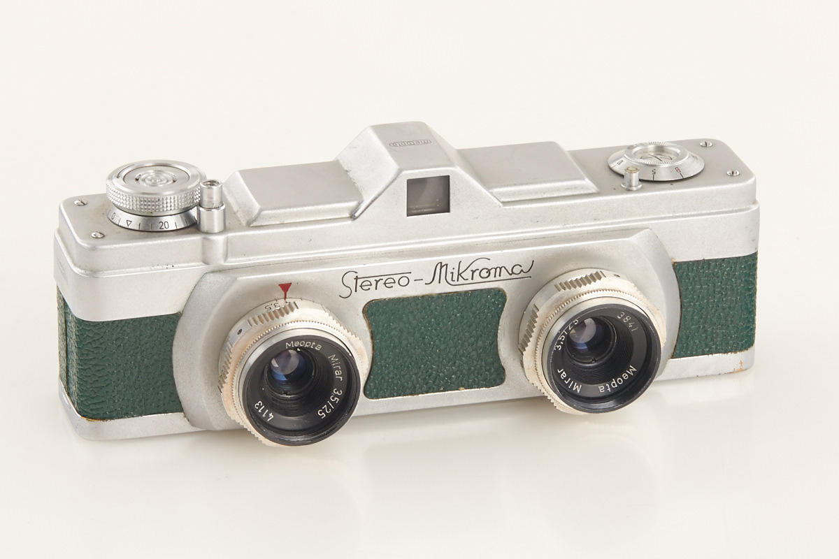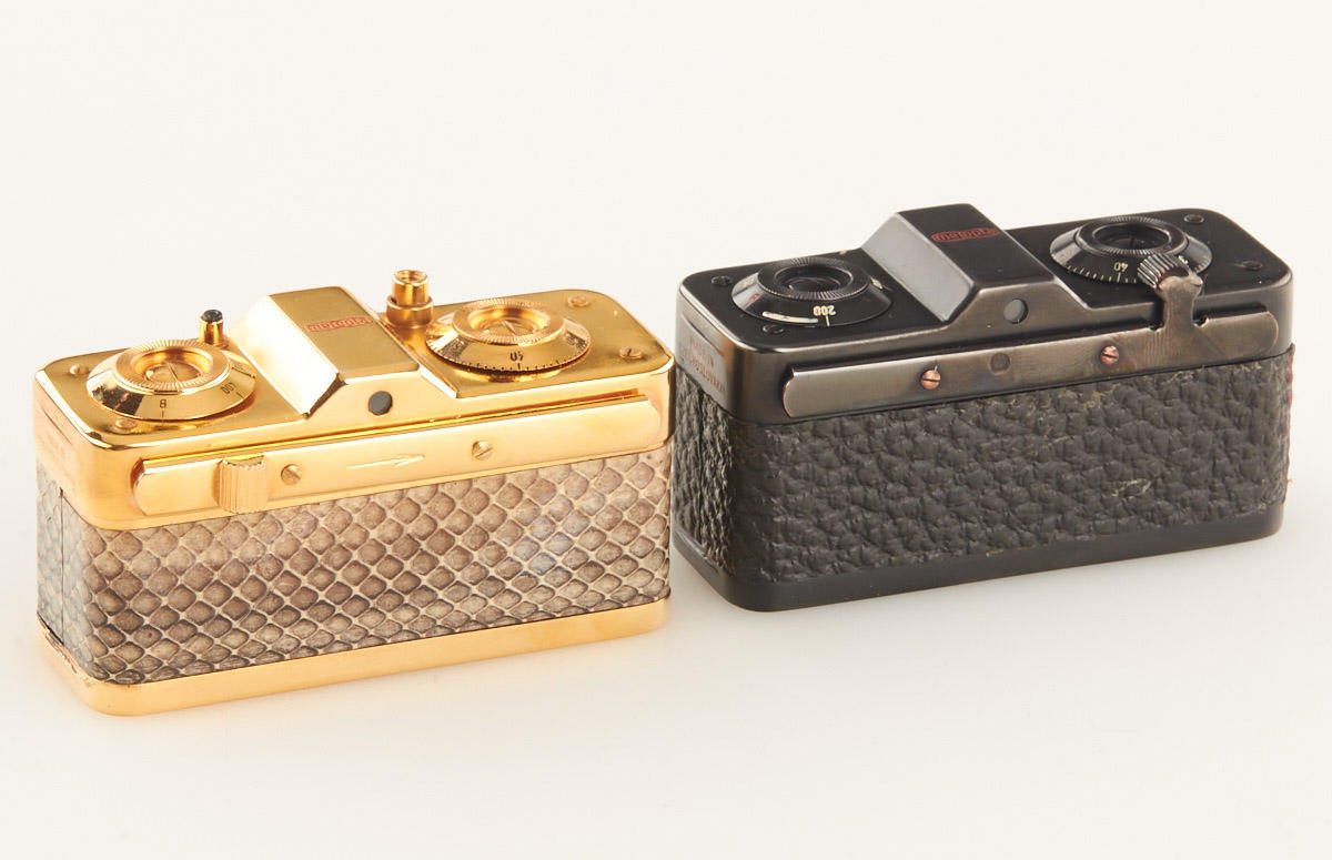 lot of seven various Mikroma cameras: (1) very rare Mikroma I black no.432228 made for Czechoslovakian police, (2) Mikroma I 4312056 with black leather covering, (3) Mikroma II gold no.10110413 with snake skin covering, (4) Mikroma II no.27608 with green leather covering, (5) Mikroma II no.26563 with yellow leather covering, (6) Mikroma II with black leather covering and very uncommon 'snapshot' lens with fixed focus and aperture, (7) Stereo-Mikroma with green leather covering and two close-up lenses, all cameras with leather cases, incl. mint close up device in maker's box
