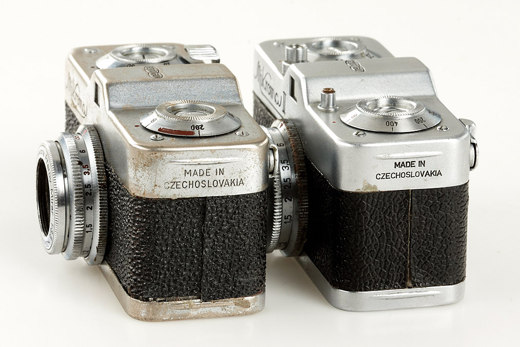 (1) Mikroma I with black covering in good working order with brown case, (2) Mikroma II with black covering in good working order with cap and green case (2)
