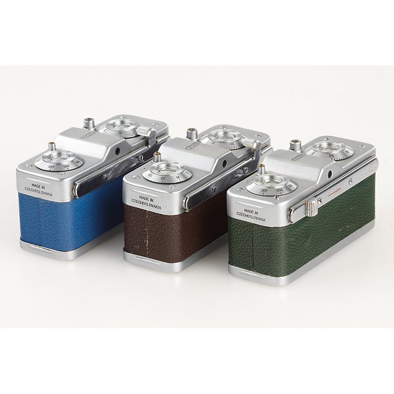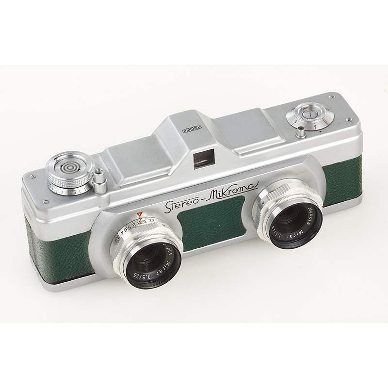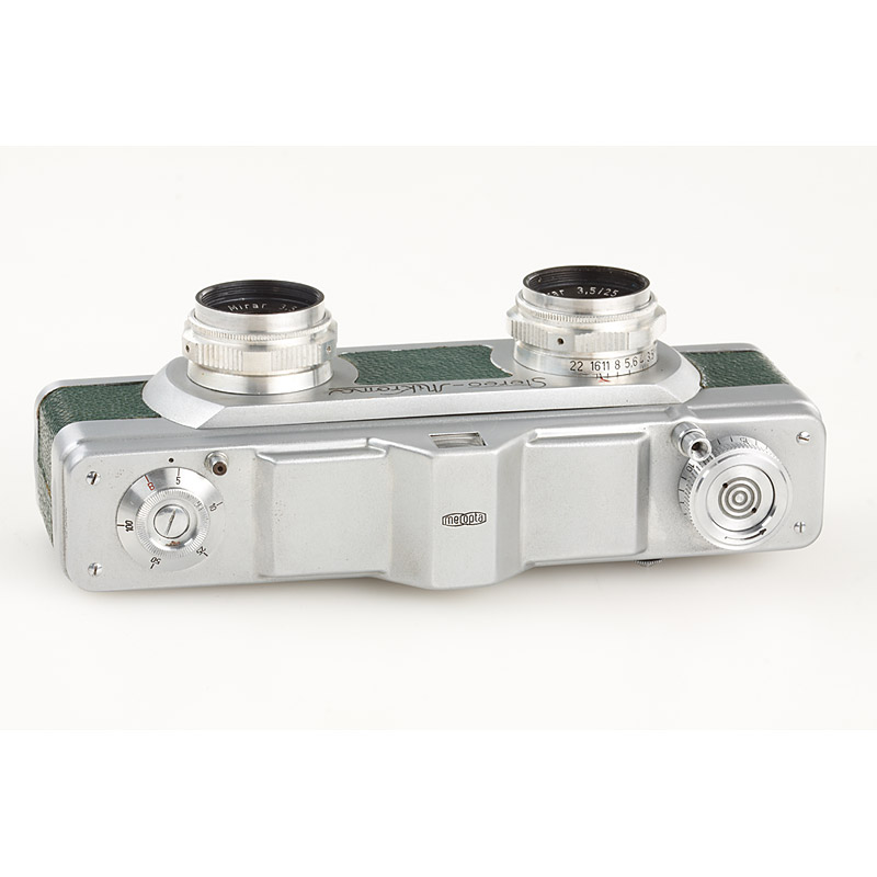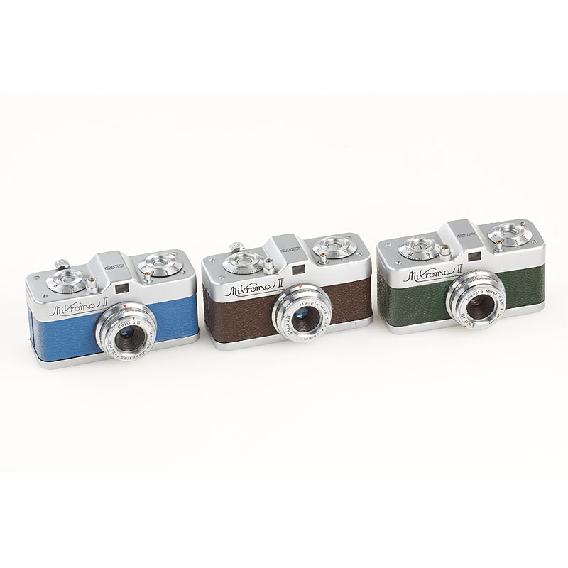 Three Mikroma II cameras with caps (red/brown, green, blue), two cases, one Stereo-Mikroma with green leather covering, caps, case, two stereo lens attachments in case, Meoskop stereo viewer in maker's box with spare reels, one instruction book (4)