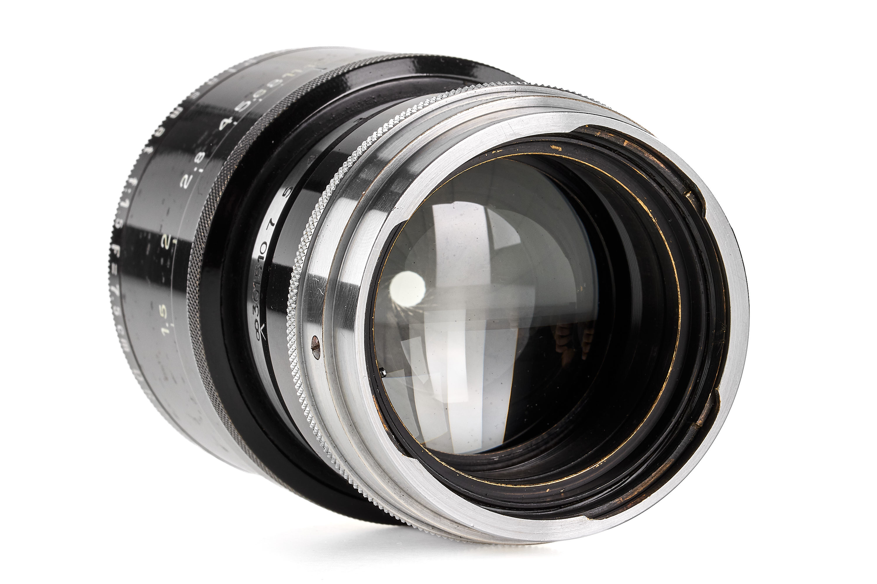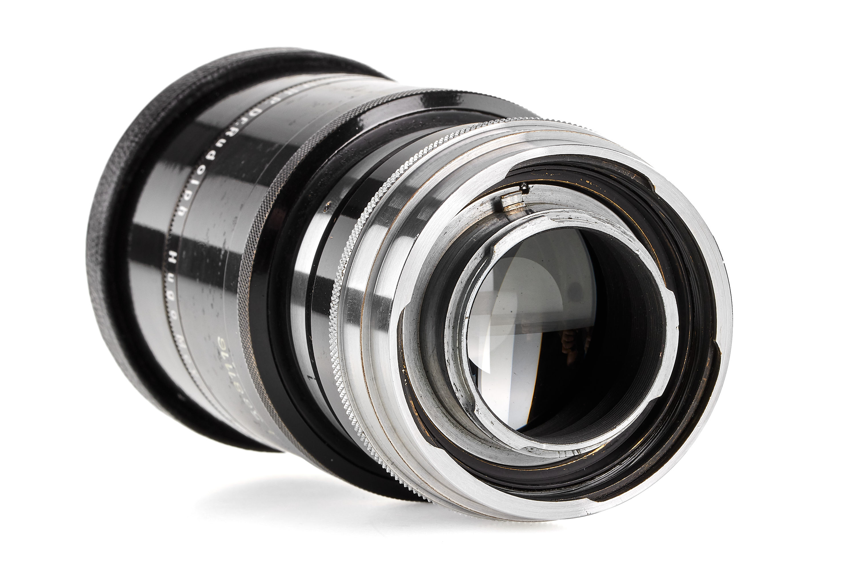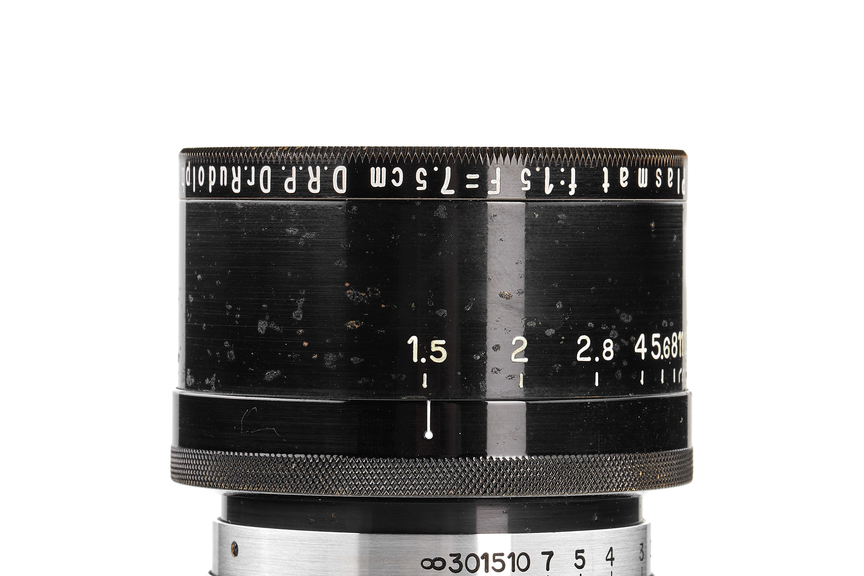 An extremely rare Kino Plasmat 7.5cm in original Contax mount, designed to be mounted on both inner and outer Contax mount simultaneously (!), the outer mount ensures an optimal stability of this heavy lens, the inner mount is responsible for the focus coupling. The lens is in beautiful condition, with very good optics, and comes with a hood and both caps. Only a few examples of this rare lens are known to exist - this may well be the best preserved one.