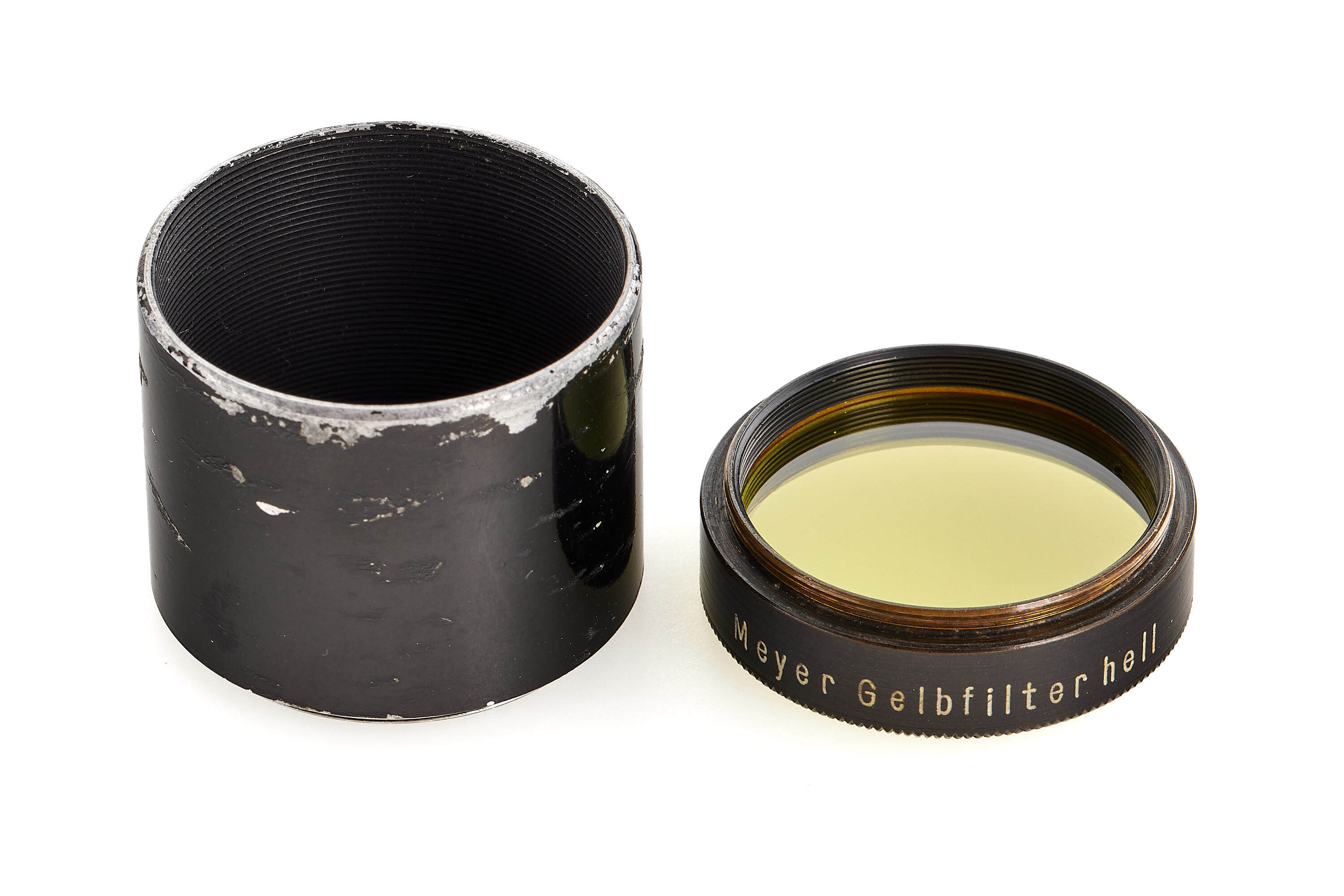 Black/nickel lens in original, rangefinder-coupled Leica M39 mount, in fine condition, very good optics, including original yellow filter and hood.