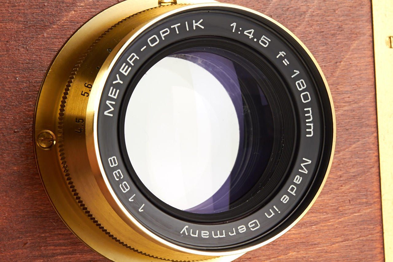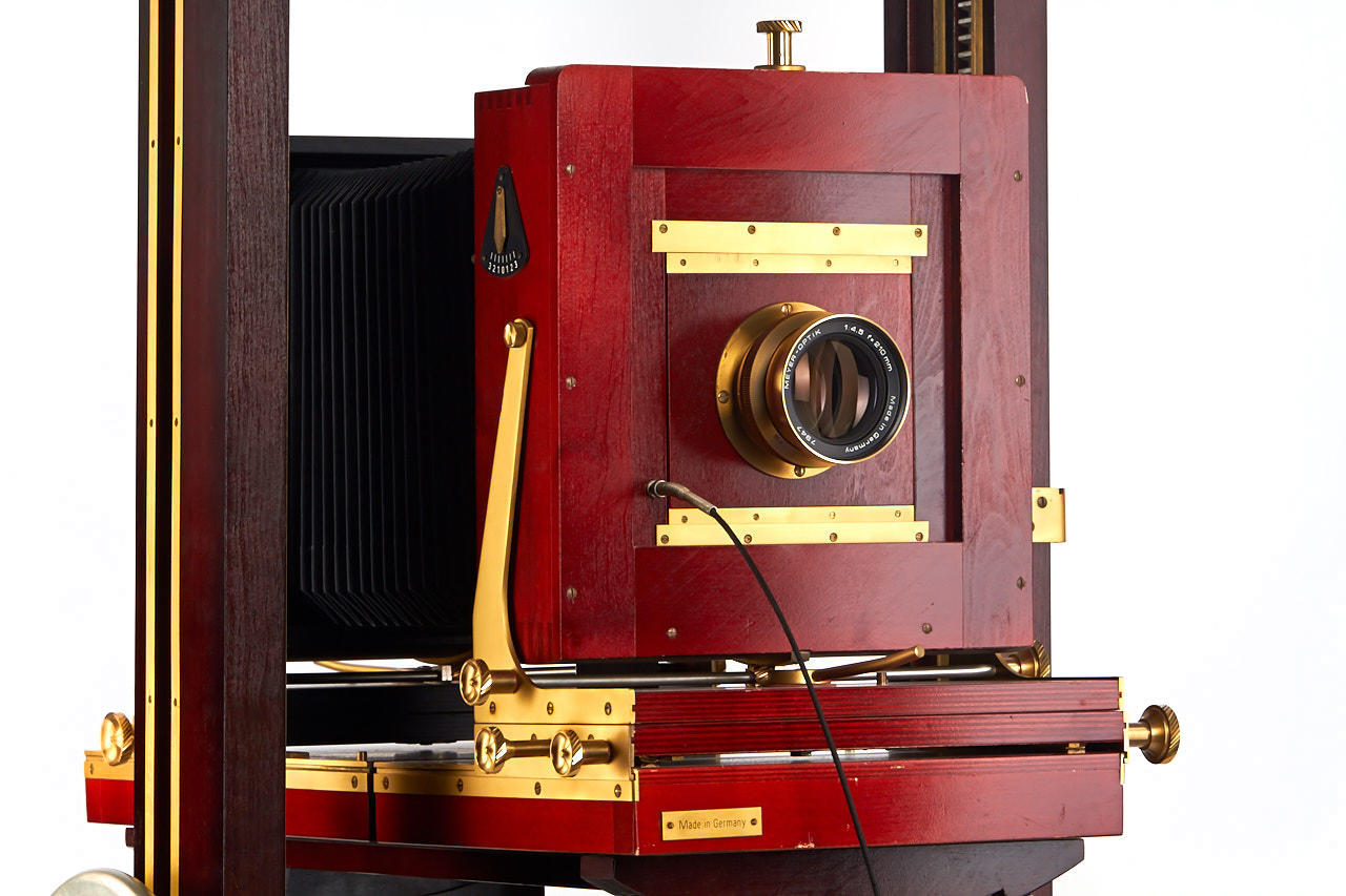 13x18cm luxury studio camera, mahogany body and stable fork-type stand, brass fittings, 4 matching brass Meyer-Optik lenses (4.5/180mm no.11638, 4.5/210mm no.7947, 4.5/250mm no.6654 and 4.5/300mm no.4084, all with front cap), two mahogany double plate holder, three lens boards, three lens extensions, cloth holder and copy of instructions, decorative and beautifully manufactured camera from a series of only 40 examples