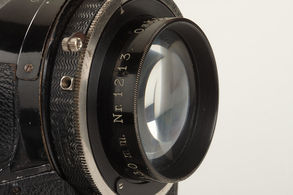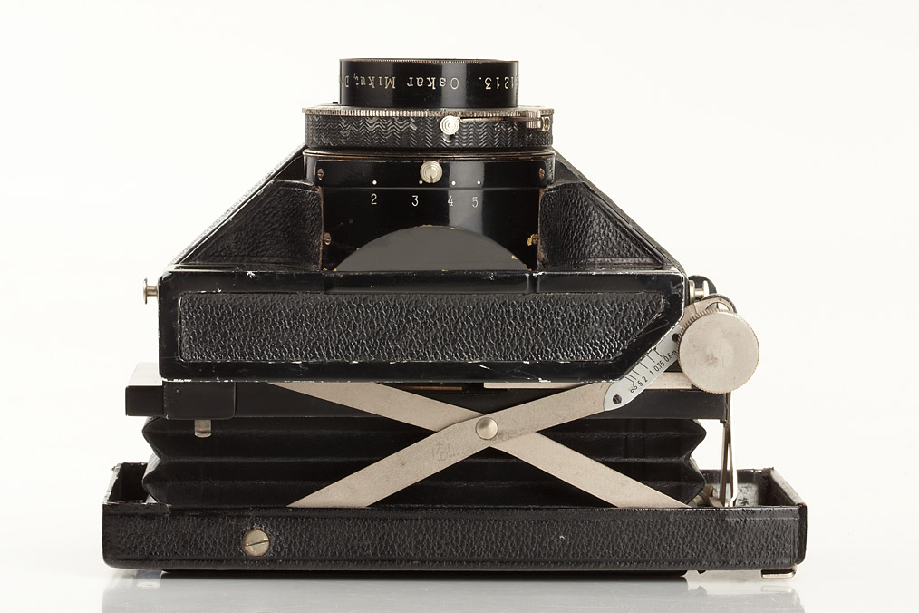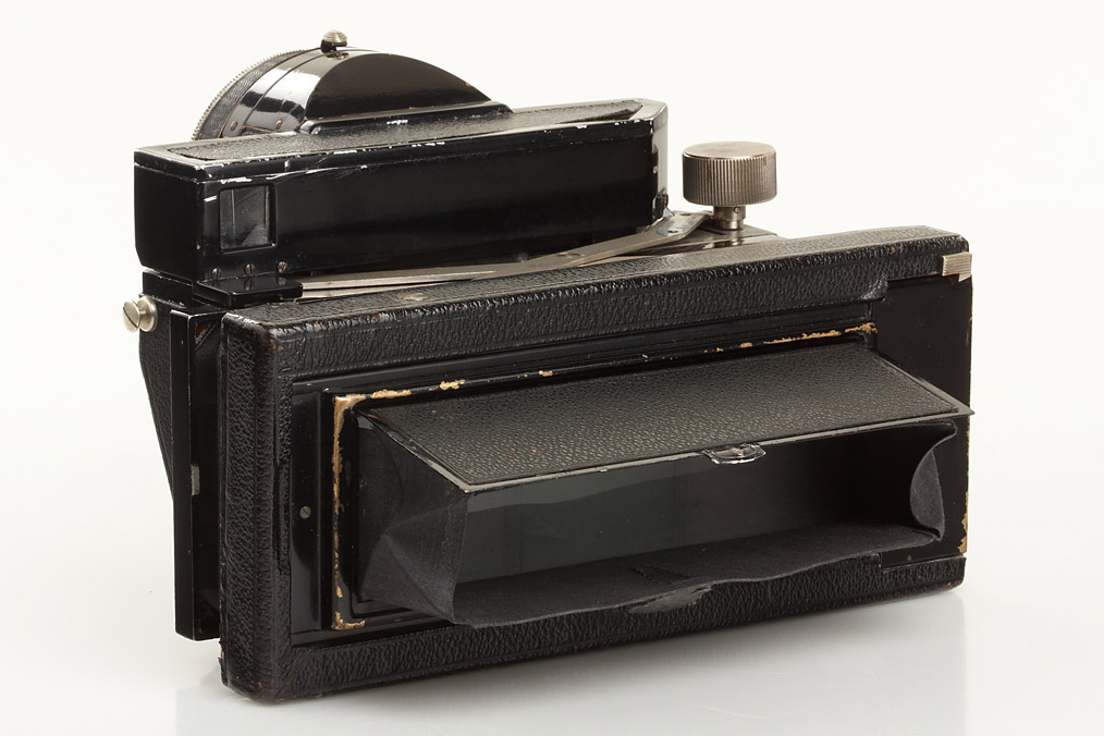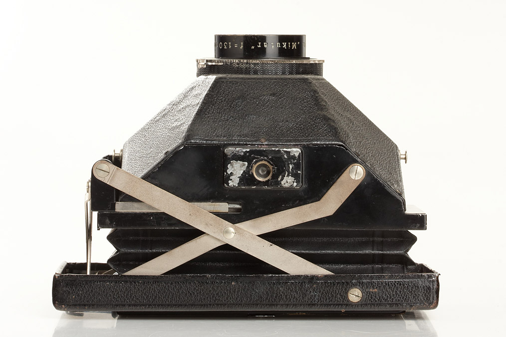 4.5x13cm format, producing 3 separate 4x4cm colour separated negatives, complete with colour-separation filter, Mikutar 3.5/130mm no.1213 in Compur shutter, in original condition. A very rare 3-colour camera and one of the few using such a small format. It was doomed to be obsolete within a short time with the advent of colour materials which did not require such complicated processes, original everready case