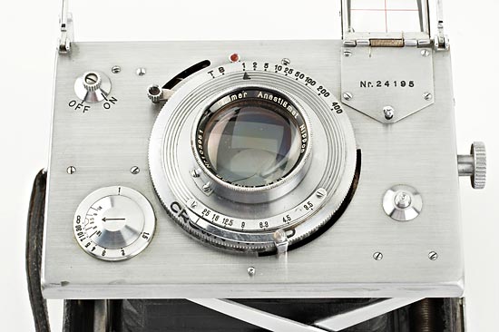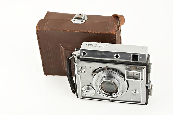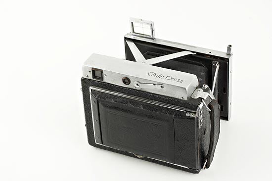 6.5x9cm, collapsible strut camera, a copy of the Plaubel Makina (shutter needs service), coupled rangefinder and automatic parallax adjustment, Nippon Promar 3.5/105mm no.103951, case, ex Spira Collection