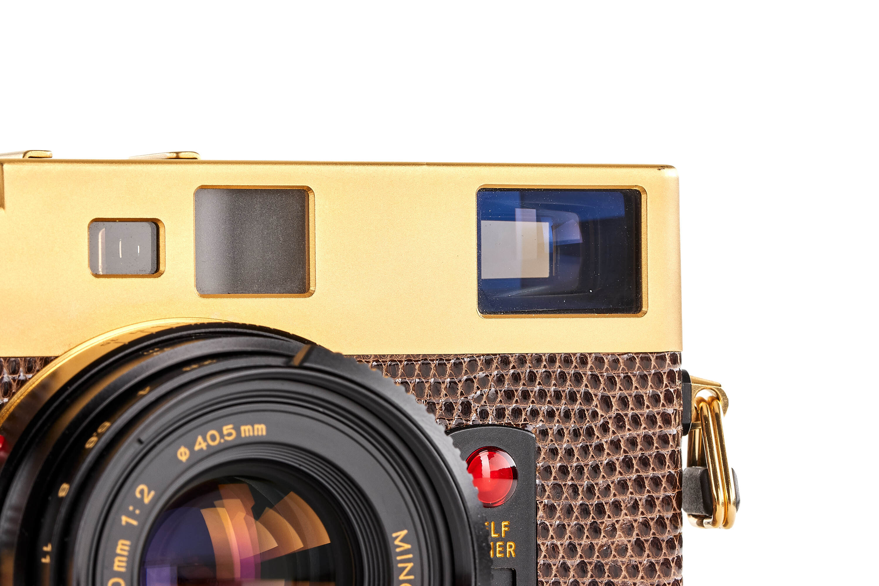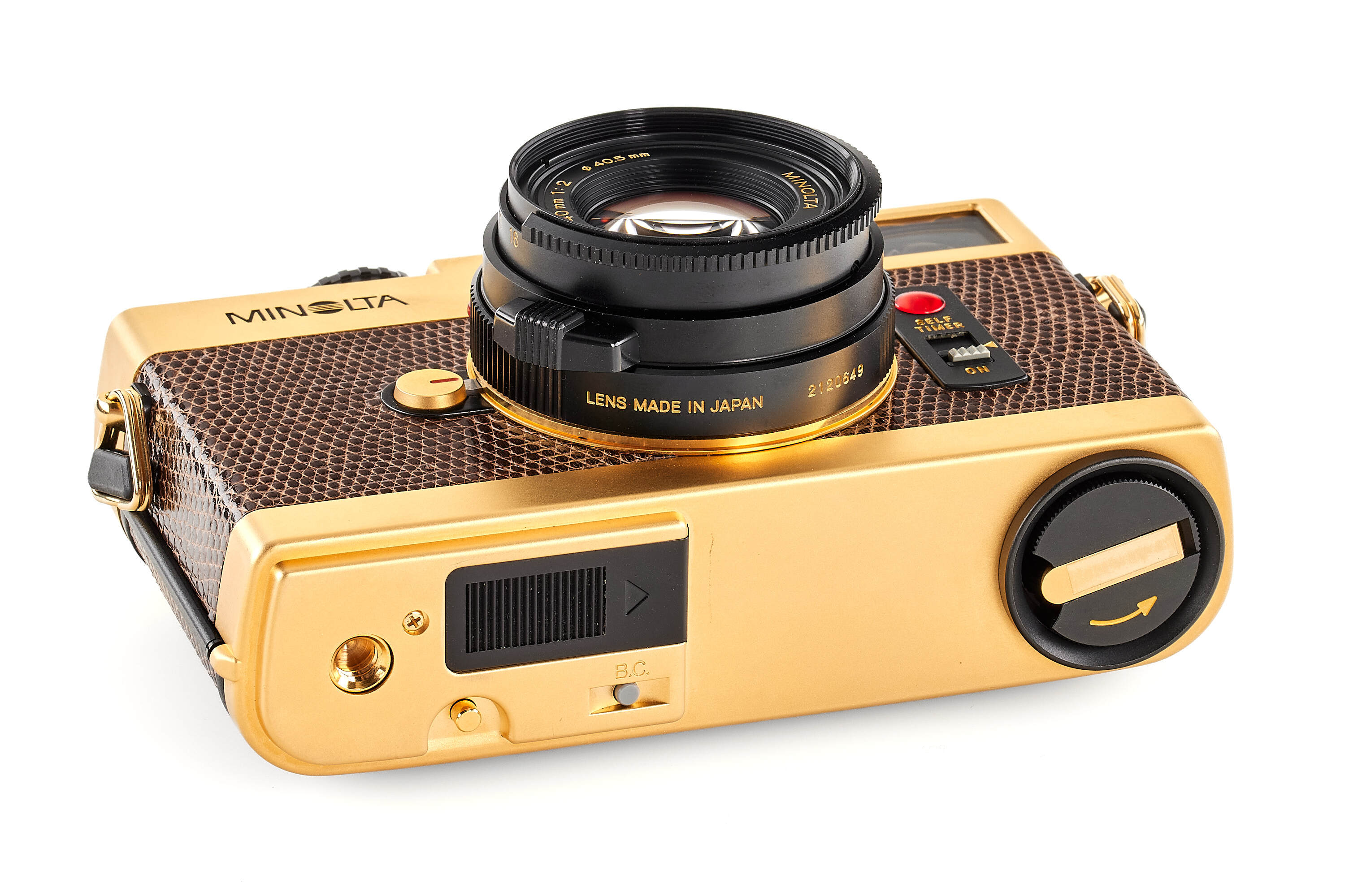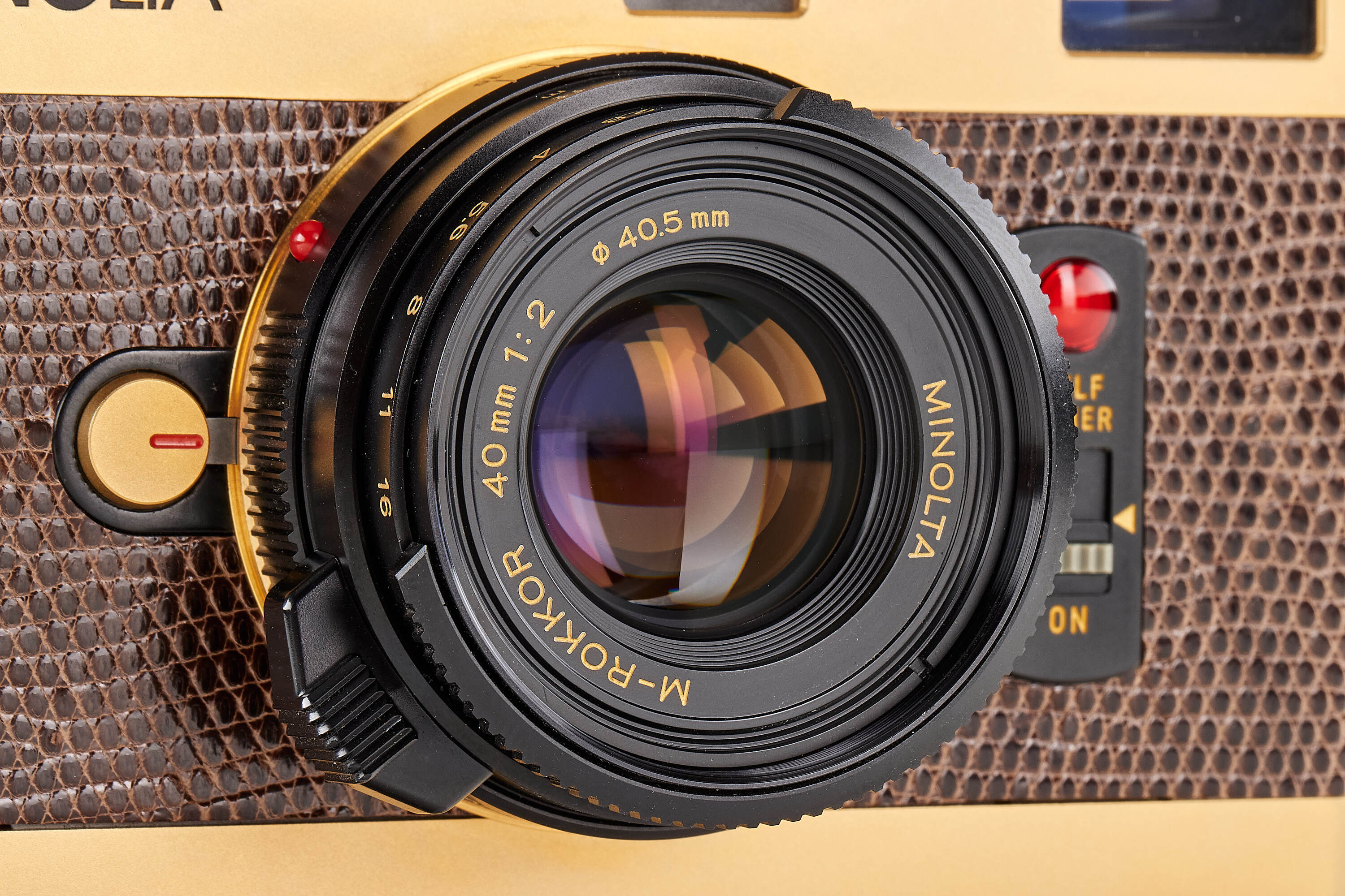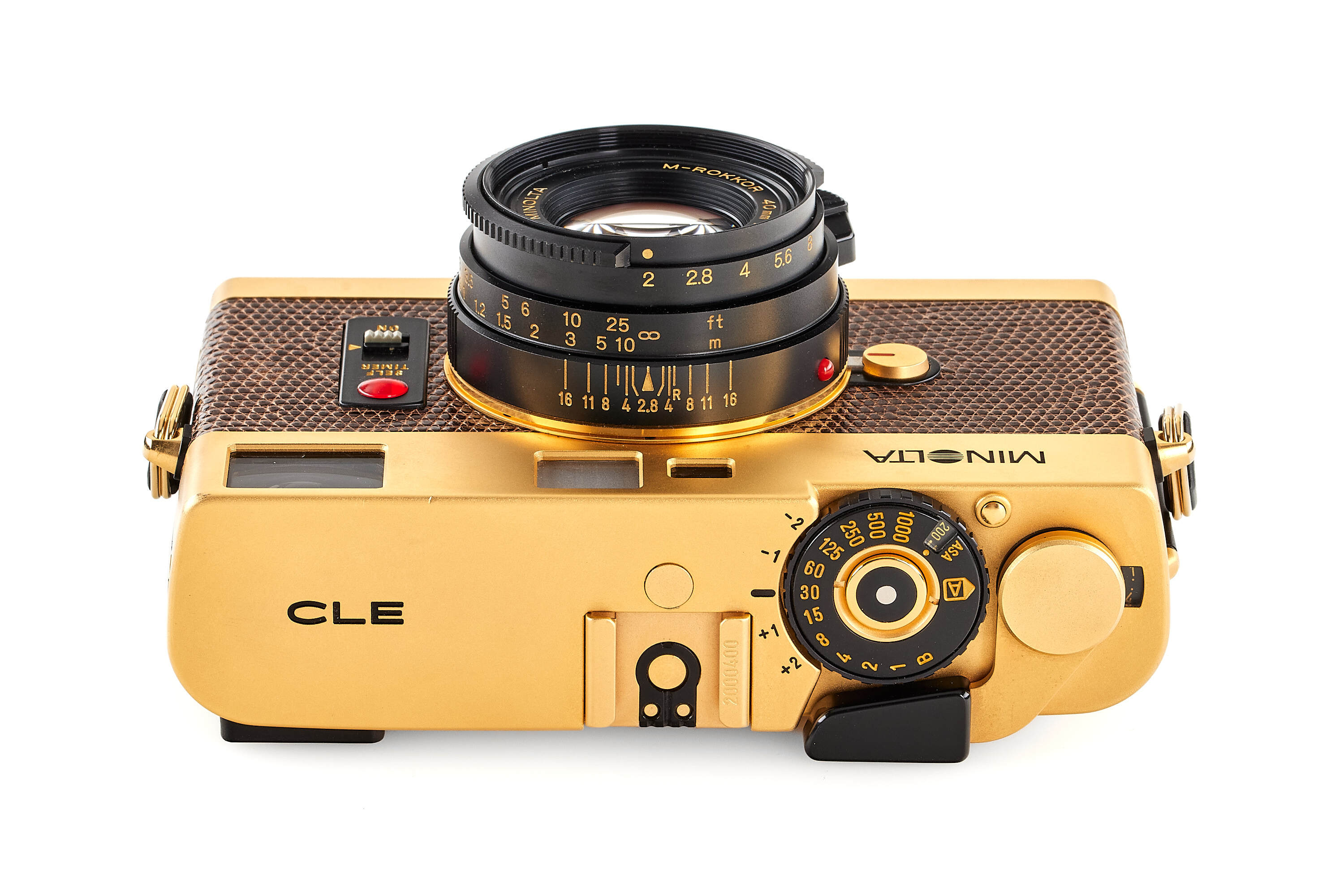 Very rare gold edition with brown lizard skin, produced for the Japanese market only, in mint condition and working order, with matching M-Rokkor 2/40mm no.2120649, clean and clear optics, with front lens cap.