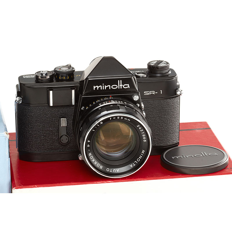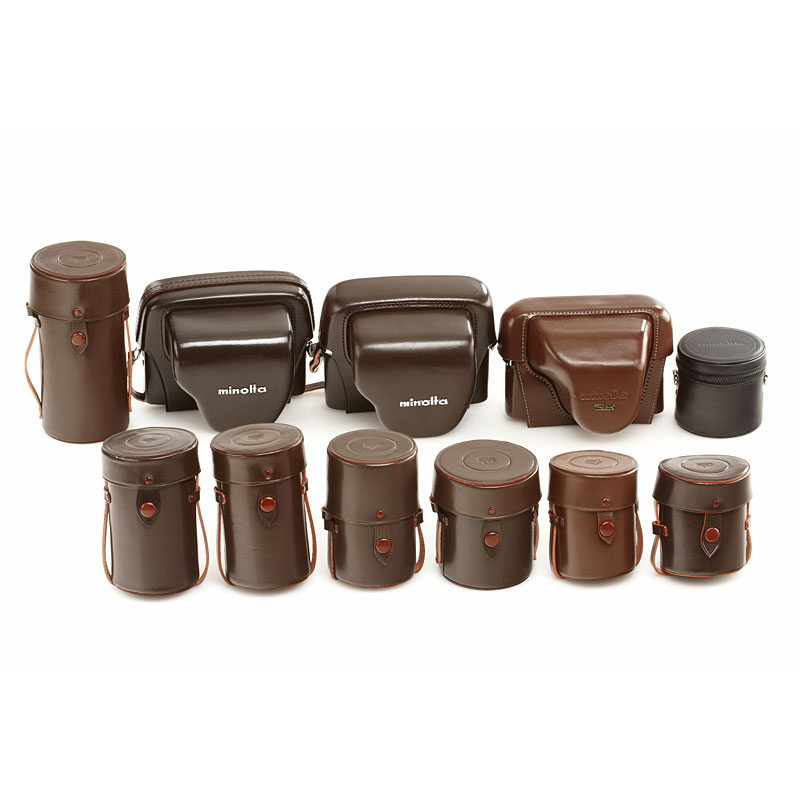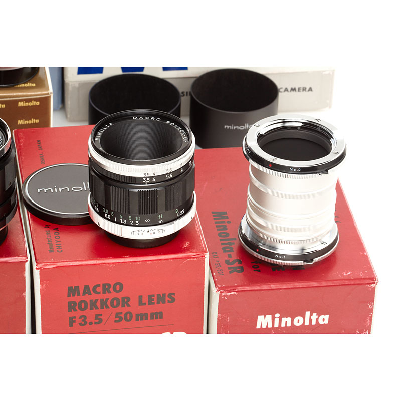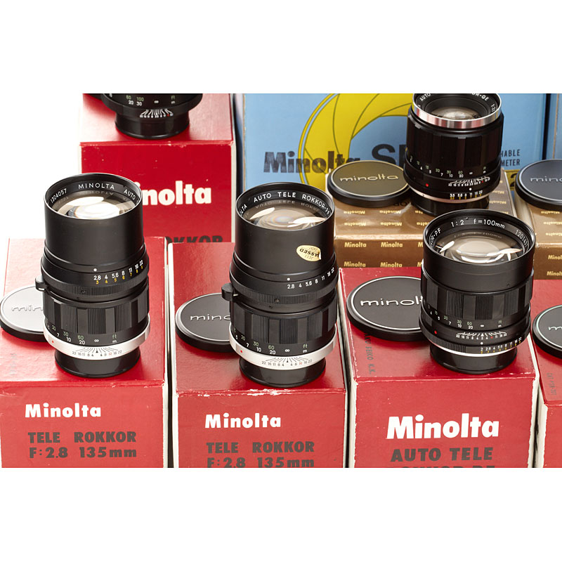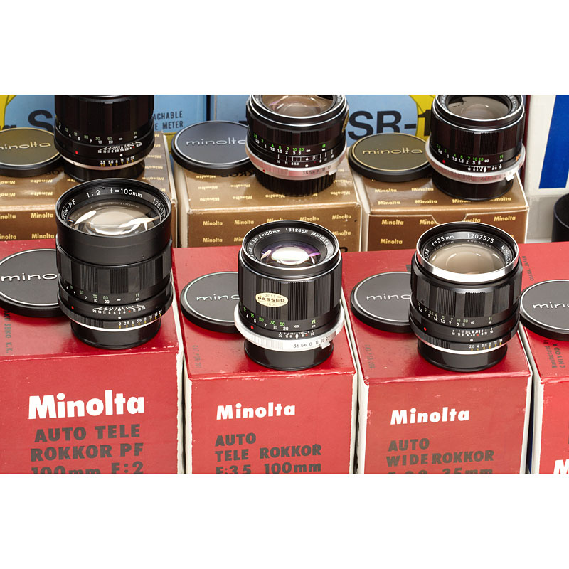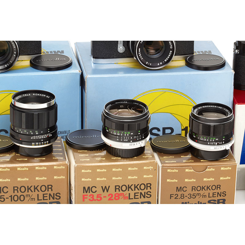 3 bodies with 13 lenses in like new condition: (1) black body no.1166175 with Auto Rokkor-PF 1.8/55mm no.2431946, (2) chrome body no.2202518 with Auto Rokkor-PF 1.8/55mm no.3468337, (3) chrome body no.2239107 with Auto Rokkor-PF 2/53mm no.1011775, (4) MC W-Rokkor-SG 3.5/28mm no.1105029, (5) W.Rokkor-HG 2.8/35mm no.1207575, (6) MC W.Rokkor-HG 2.8/35mm no.1467423, (7) Macro Rokkor-QF 3.5/50mm no.1100156 with reversal ring (8) Auto Tele Rokkor-PF 2/100mm no.1201437, (9) Auto Tele Rokkor-QE 3.5/100mm no.1203666, (10) MC Tele Rokkor-QE 3.5/100mm no.1312468, (11) Auto Tele Rokkor-PF 2.8/135mm no.1113827, (12) Auto Tele Rokkor-PG 2.8/135mm no.1304057, (13) Auto Tele Rokkor-QF 3.5/200mm no.1300863, (14) extension tube set - most cameras and lenses with cases, some with hoods, all like new in original maker's boxes