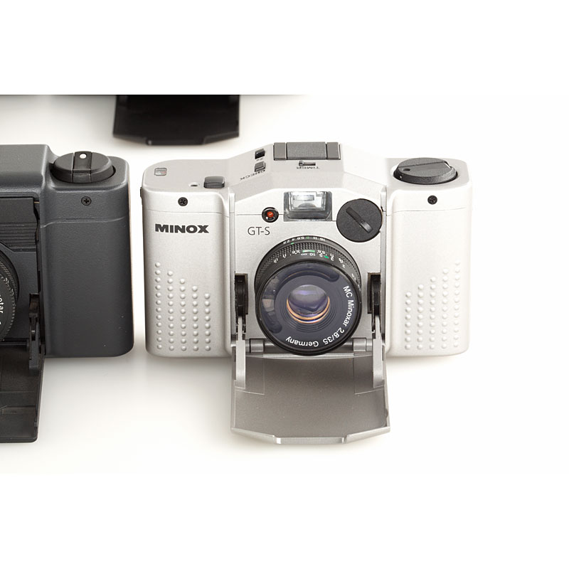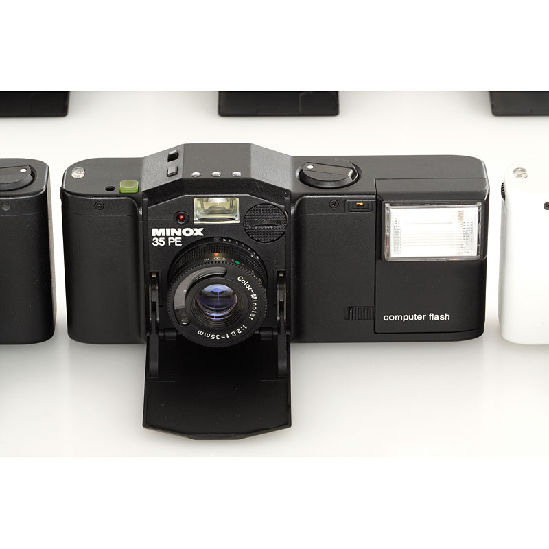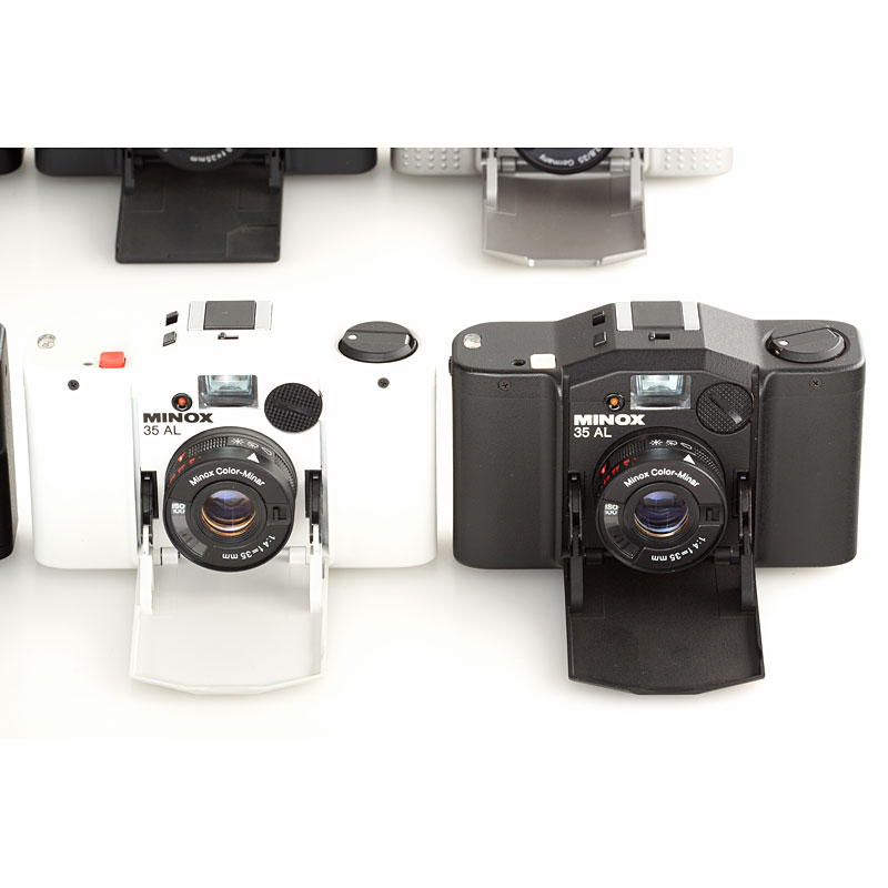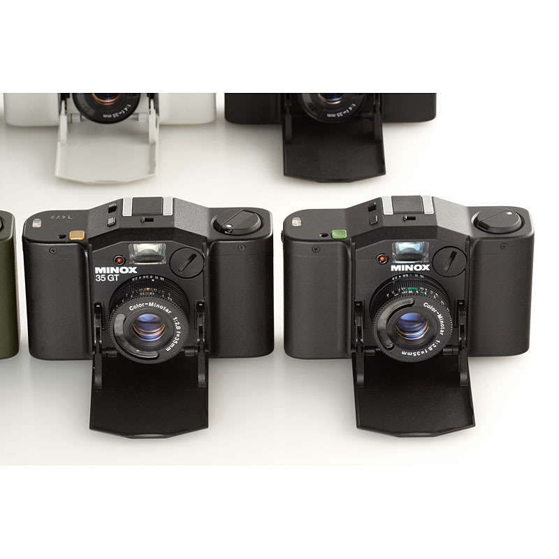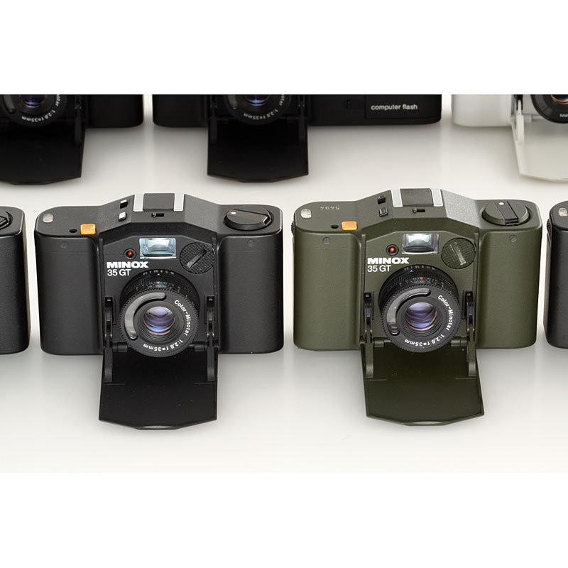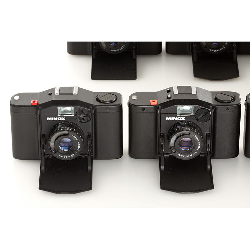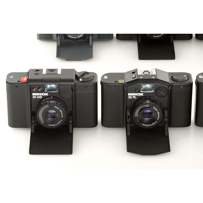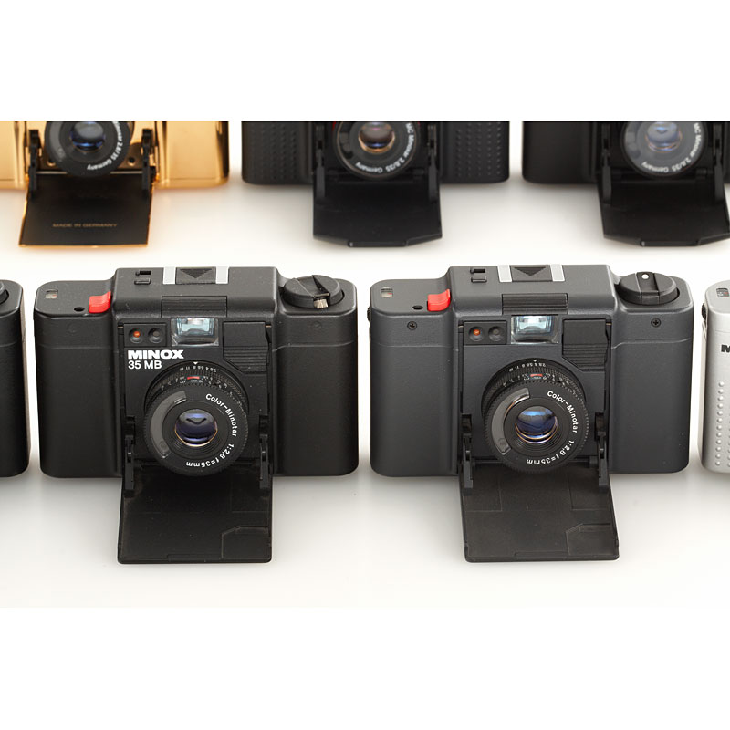 collection of 20 Minox 35 cameras, all in new condition: (1) Minox 35 EL, (2) Minox 35 GL, (3) Minox 35 GT (1981), (4) Minox 35 GT Golf (limited edition), (5) Minox 35 GT Decade Edition (limited edition of 1500 cameras), (6) Minox 35 GSE, (7) Minox 35 GT-E, (8) Minox 35 Goldknopf (shutter release made of 585 gold, data back D-35G, limited edition of 720 cameras), (9) Minox 35 GT-X, (10) Minox GT-S, (11) Minox 35 PL, (12) Minox 35 PE, (13) Minox 35 AL white, (14) Minox 35 AL black, (15) Minox 35 ML, (16) Minox 35 MB, (17) Minox 35 MB Service-Camera, (18) Minox 35 Touring (limited edition of 3333 cameras), (19) Minox 35 M.D.C, (20) Minox 35 M.D.C Gold (limited edition of 555 cameras), with very rare original close-up stand 35, FC35 flash, MF 35ST flash, MT 35 flash, FC-E flash, 5 different Minox cases, Minox family tree poster - all cameras new in black boxes, some with paper wrapping or outer maker's box (20)