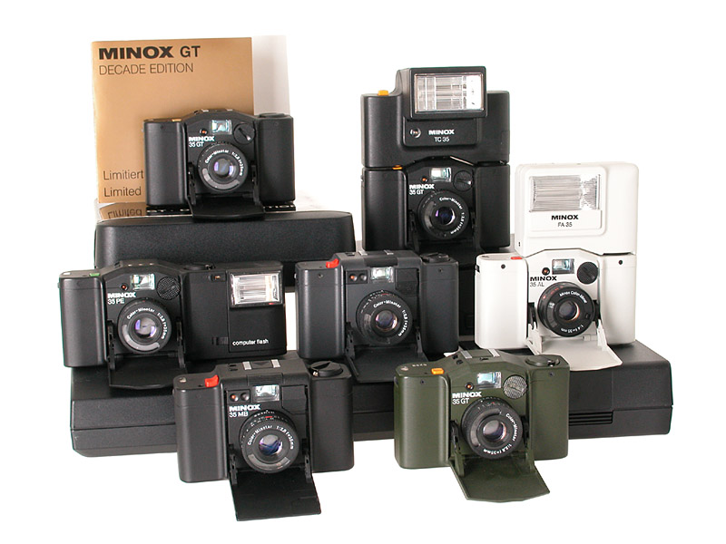Sammlung von 9 verschiedenen Minox 35 mit 35AL mit Blitz in orig.Schachtel, 35PE in Box, Grüne 35GT Golf; GT Edition in orig.Box; 35GT in orig.Box und TC 35 Blitz; 35 MB Service Kamera; Graue Minox Touring mit Tasche (9)