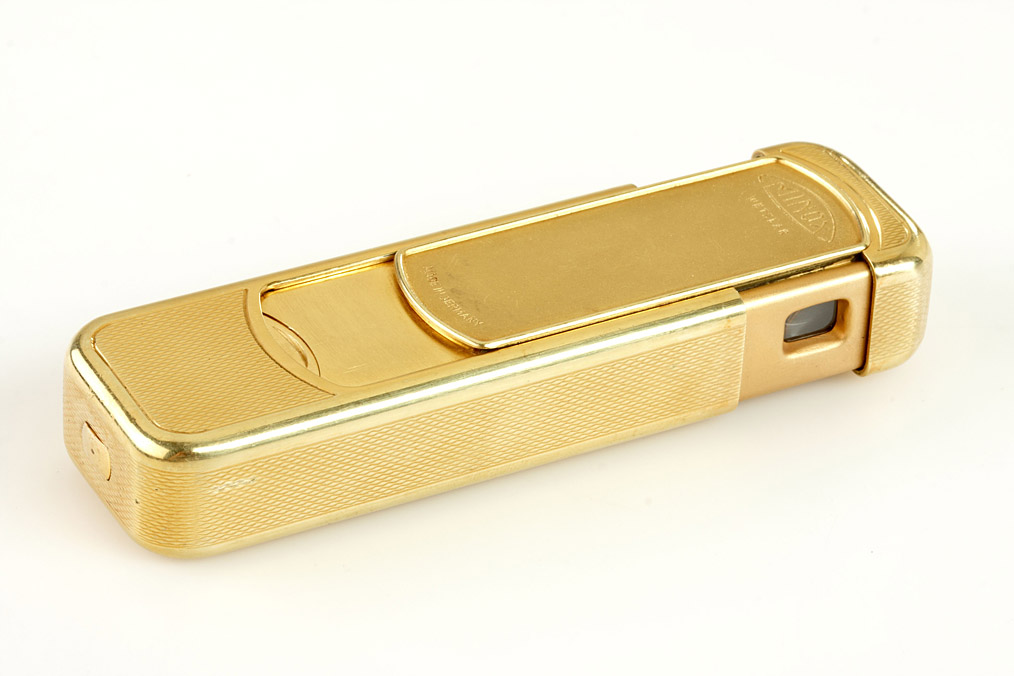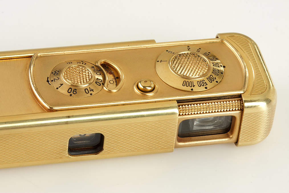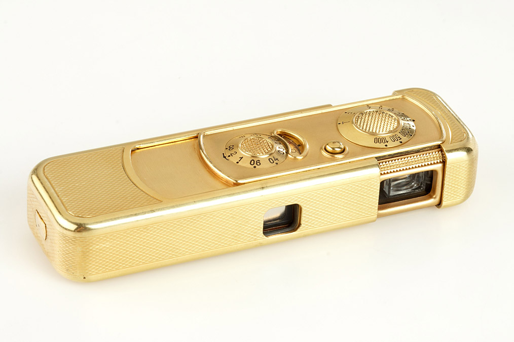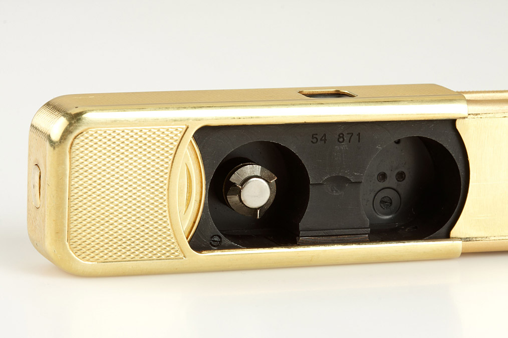 Minox A engraved Wetzlar, in meter, synchronised, gold-plated, brass body (only gold-plated cameras had the over 100g in weight brass body). Optically and technically exceptional. Early gold-plated Minox are extremely rare, this camera is particularly unusual because the body is not chased but smooth. With gold-plated chain and a beautiful crocodile slip case