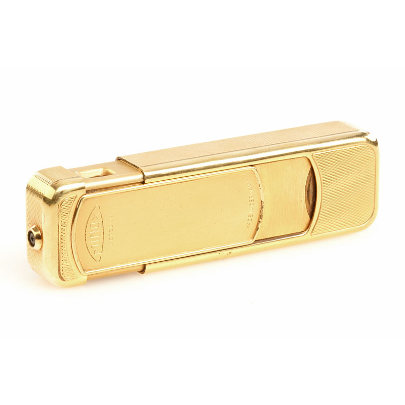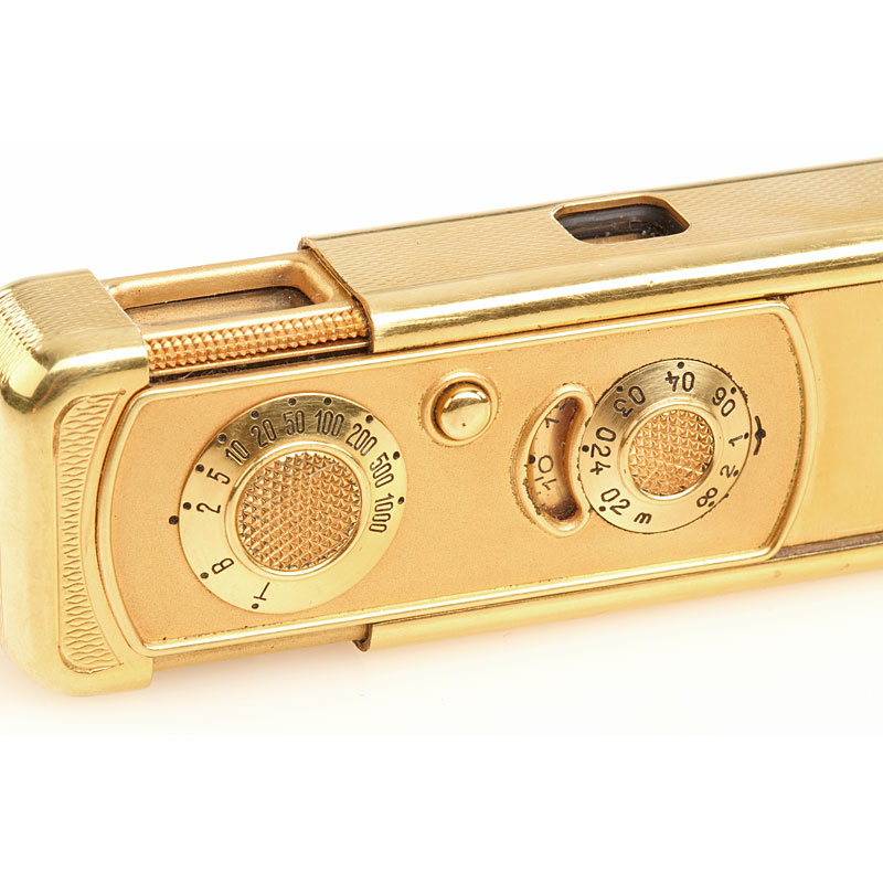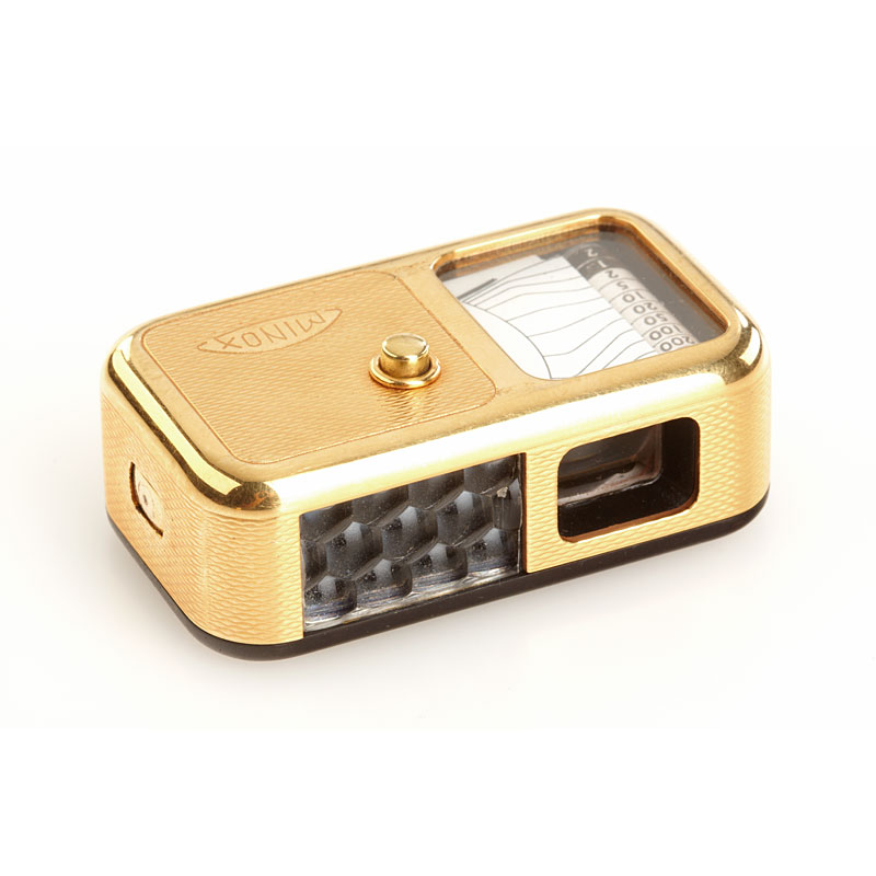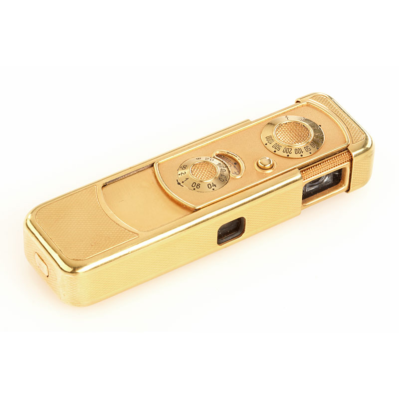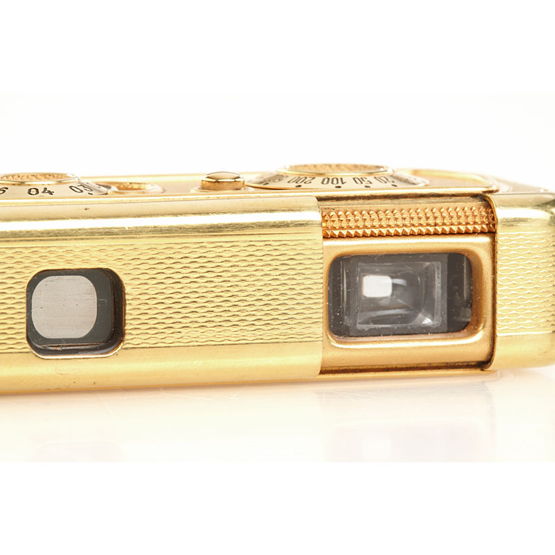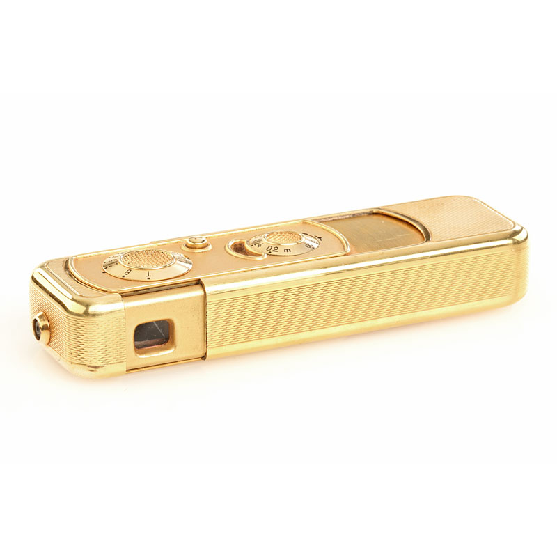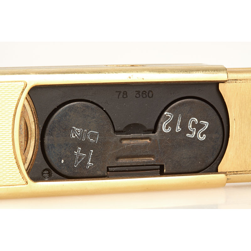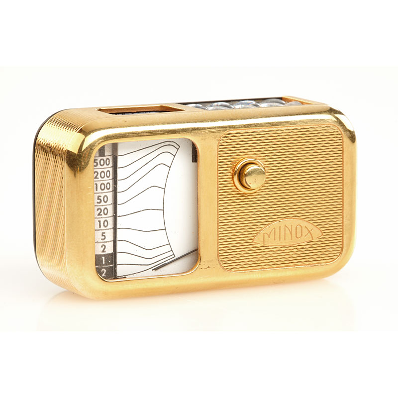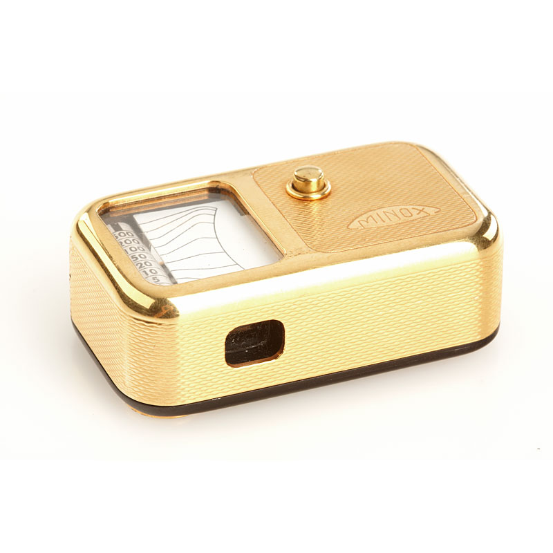 Minox A engraved Wetzlar (in meter, synchronised), diamond gold-plated brass body (only gold-plated cameras have the 122 gram body), in perfect working order with gold-plated chain and a crocodile leather slip case, matching golden Minox exposure meter (working) in a crocodile leather slip case. Early gold-plated Minox are extremely rare and were only made by special order mostly for personalities. From the estate of the German actor (Jedermann, 1970) Ernst Schröder.