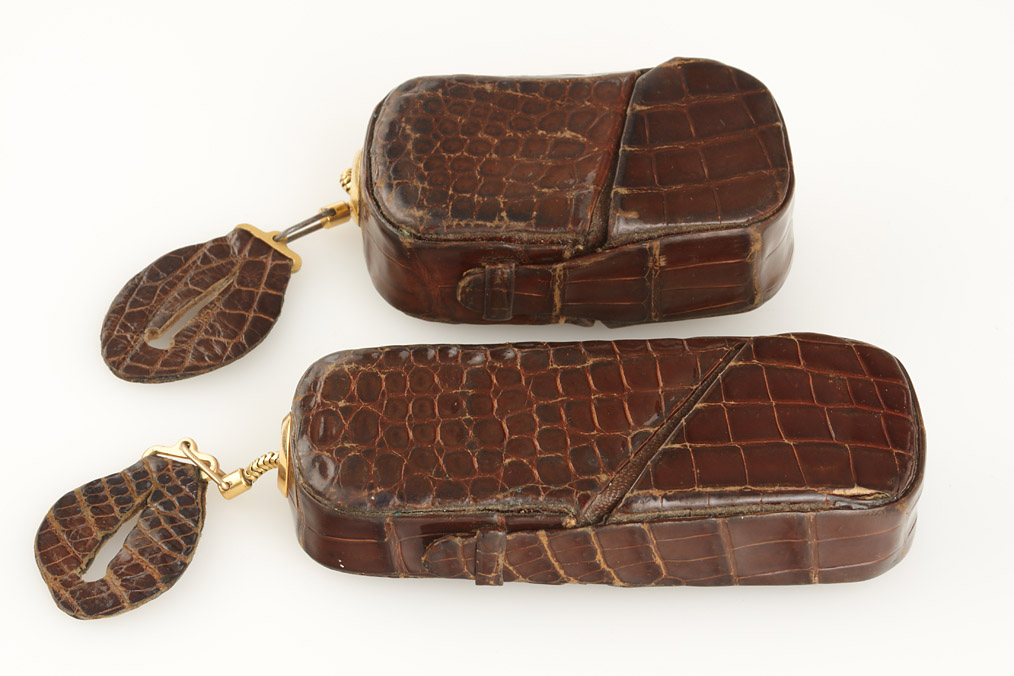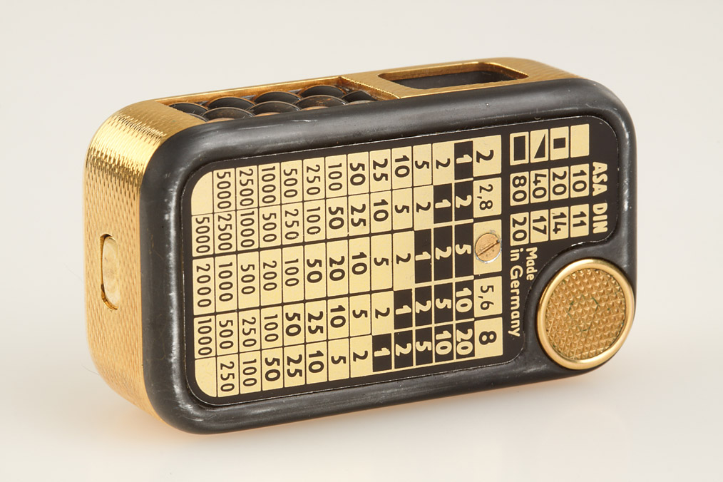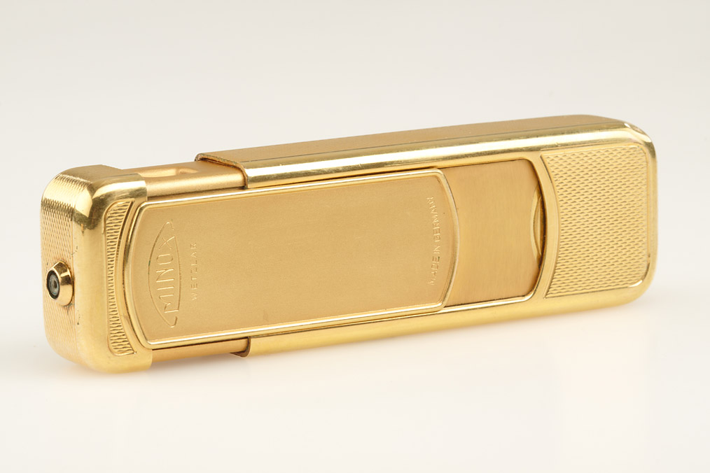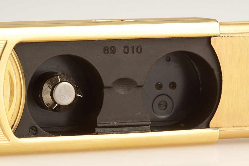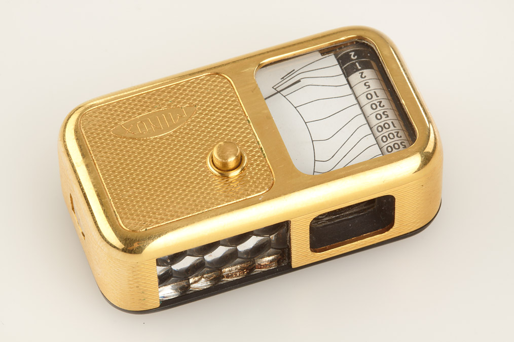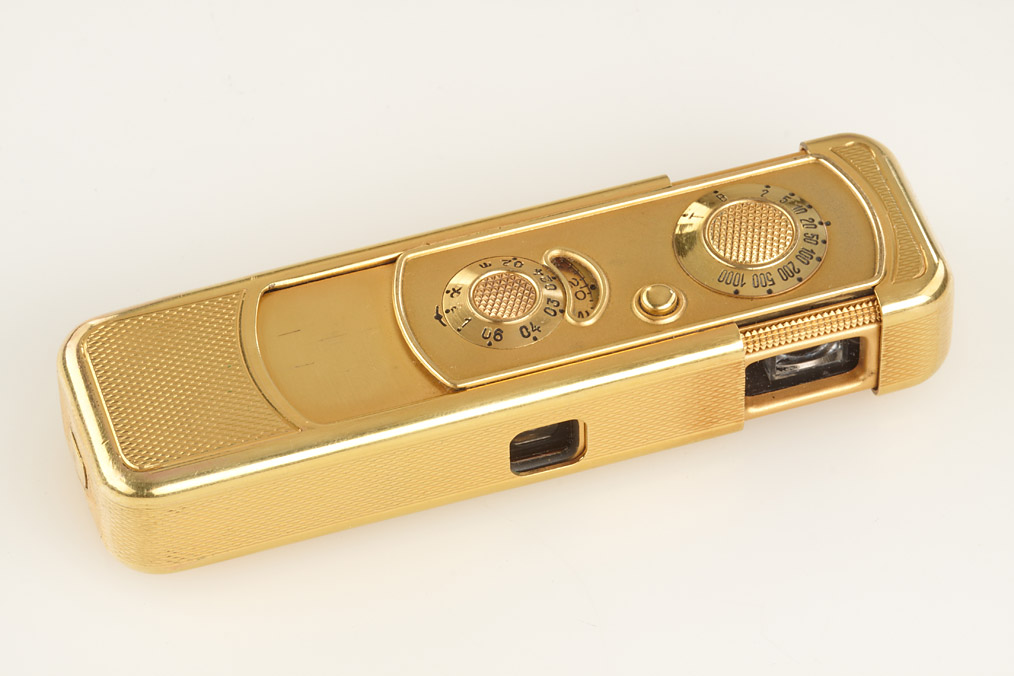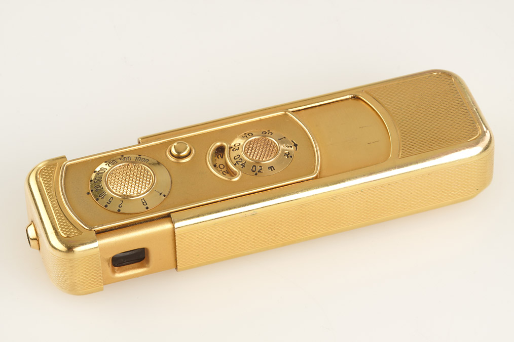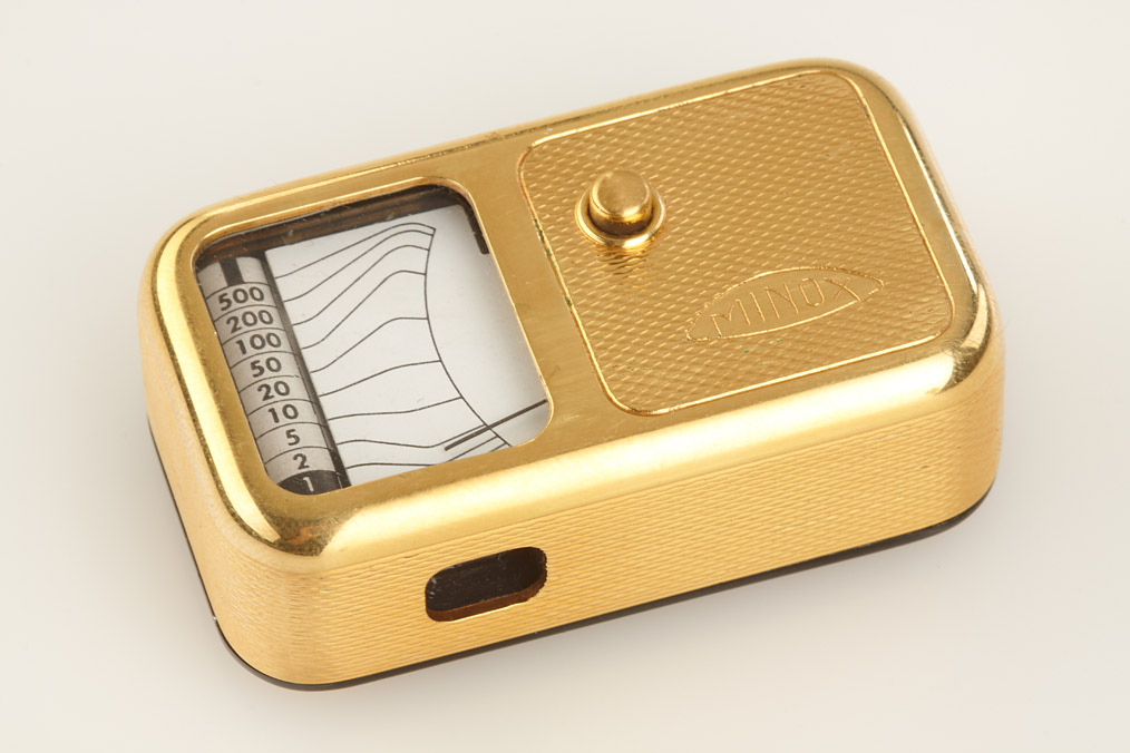 Minox A engraved Wetzlar (in meter, synchronised), diamond gold-plated brass body (only gold-plated cameras have the 122 gram body), in perfect working order with gold-plated chain and a crocodile leather slip case, matching golden Minox exposure meter (working) in a crocodile leather slip case, both instructions. Early gold-plated Minox are extremely rare and were only made by special order