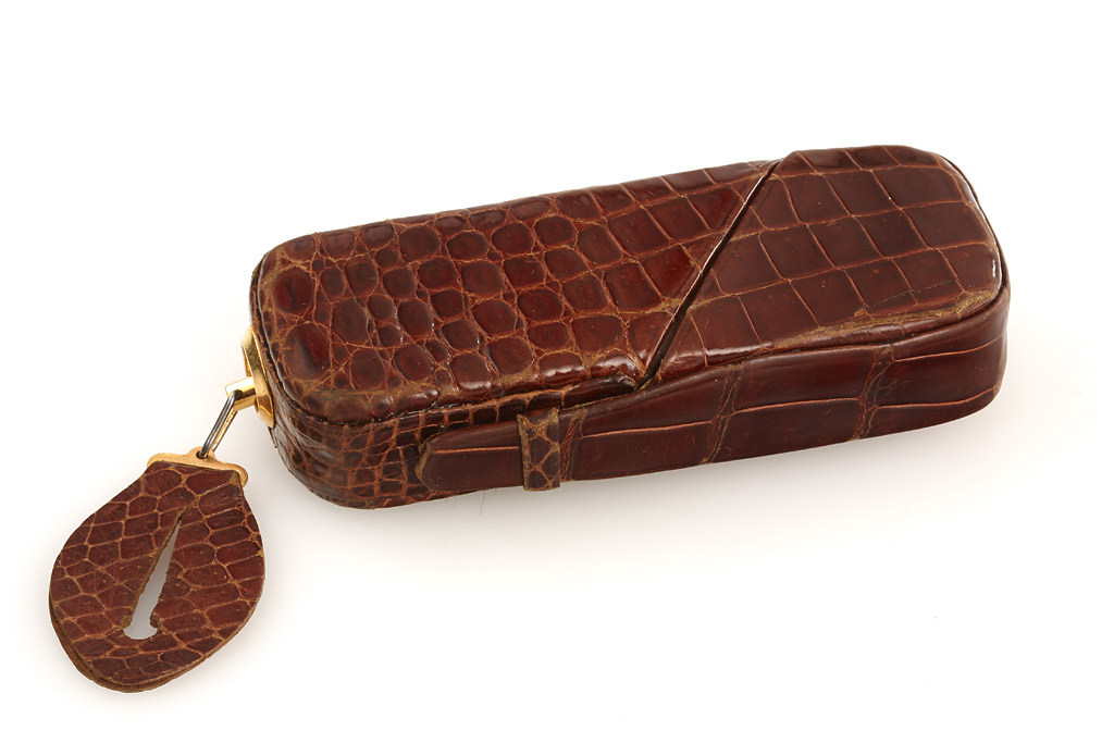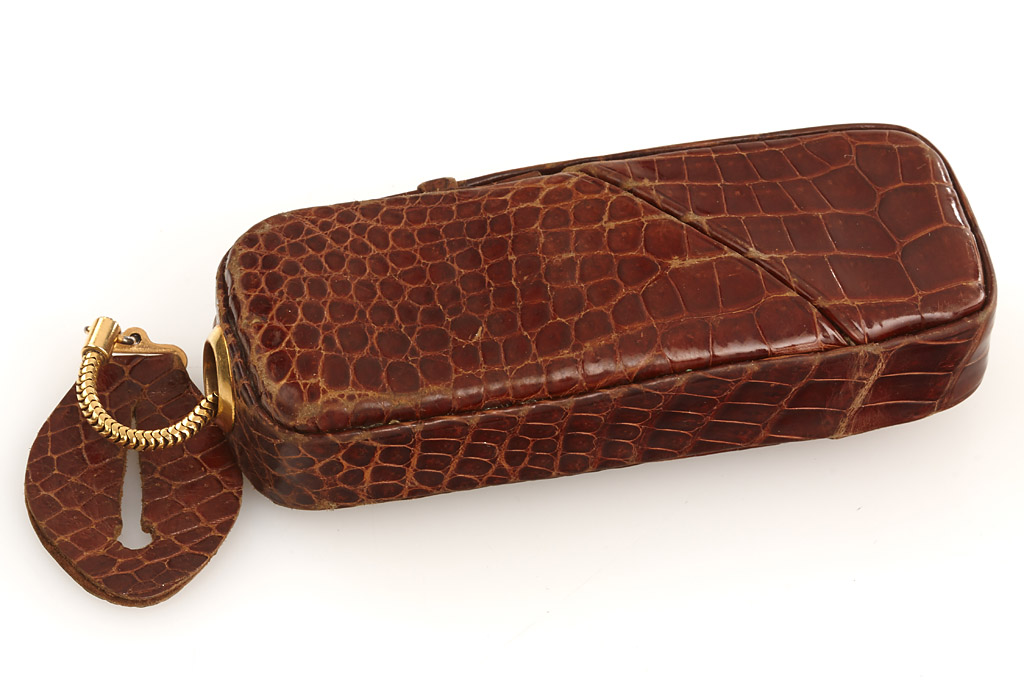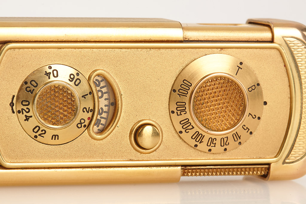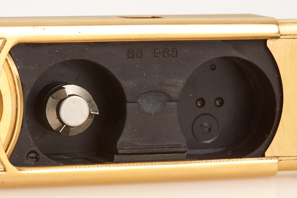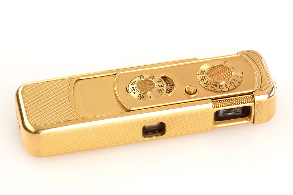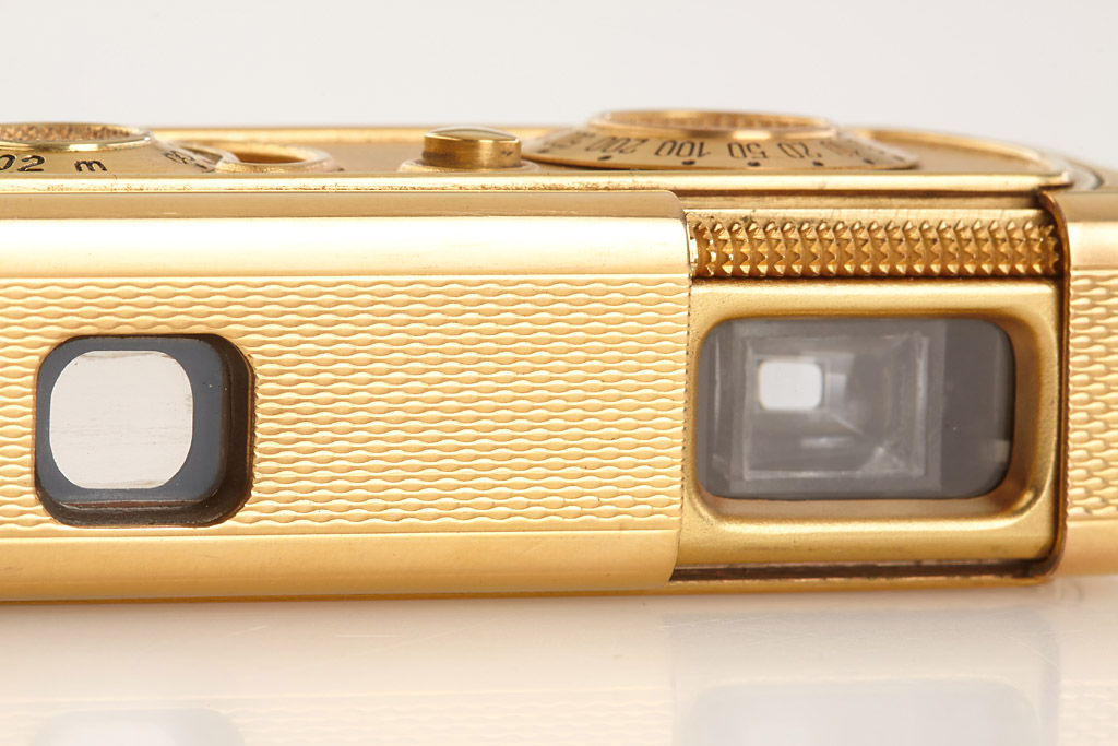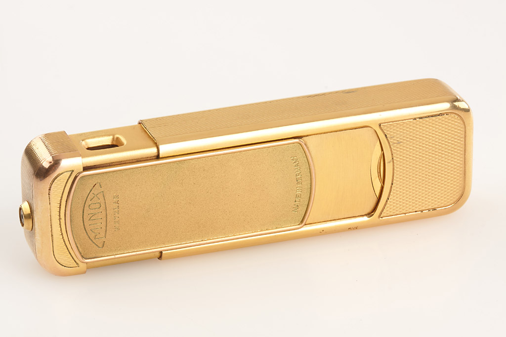 Minox A engraved Wetzlar (in meter, synchronised), diamond gold-plated brass body (only gold-plated cameras have the 122 gram body), in perfect working order with gold-plated chain and a crocodile leather slip case, gold-plated Minox are extremely rare and were only made by special order