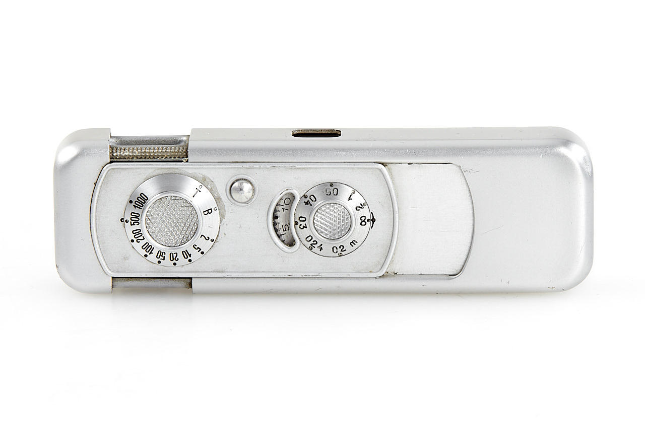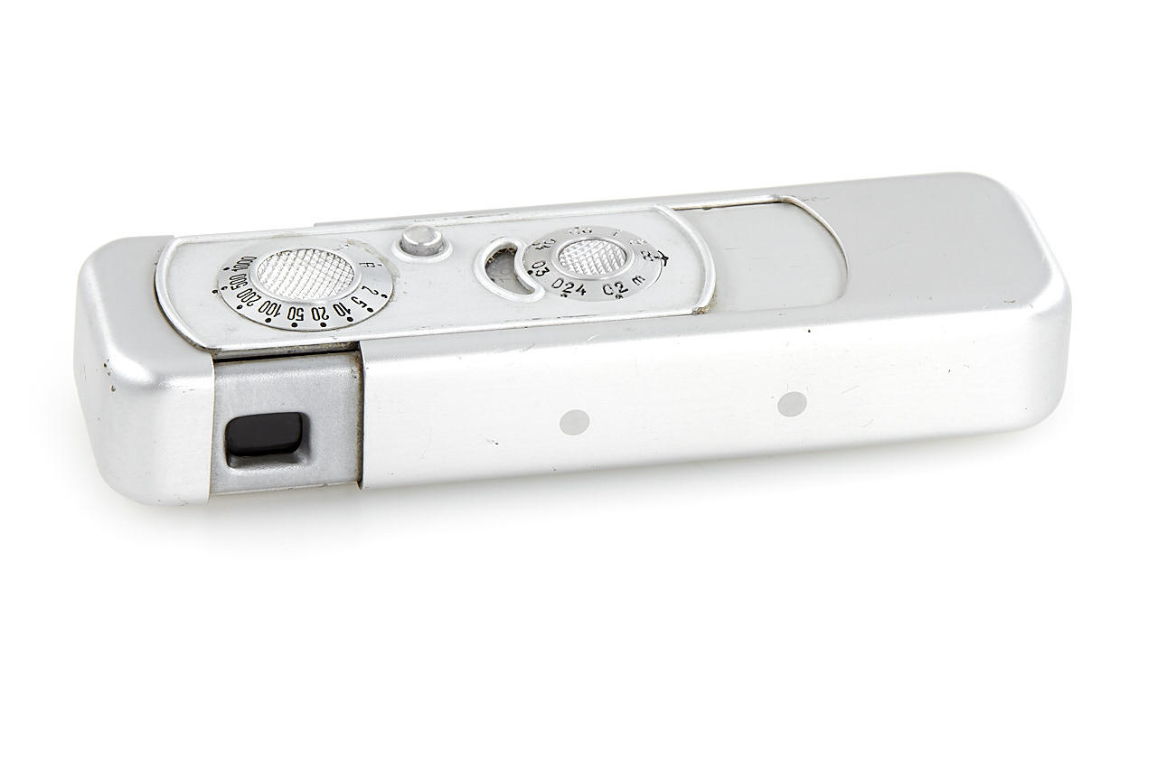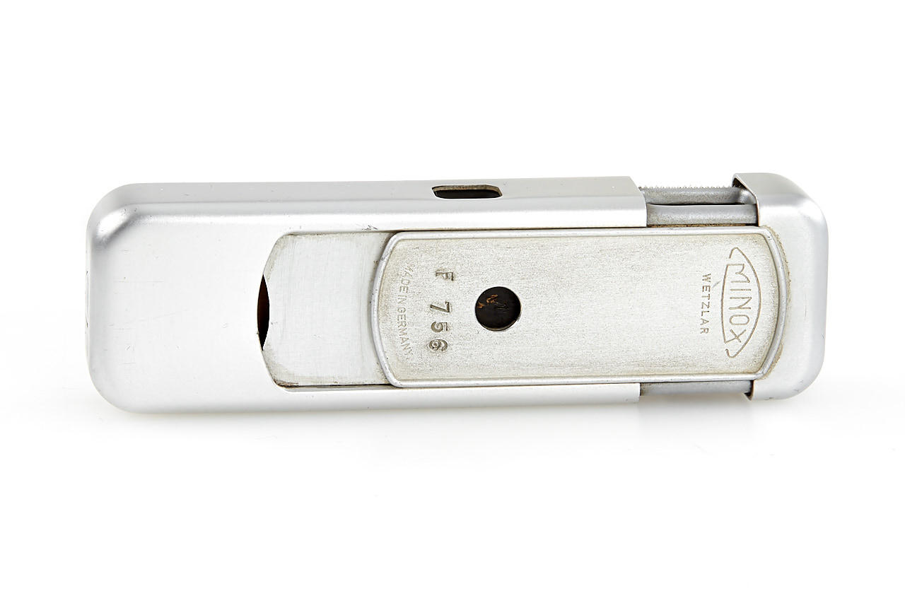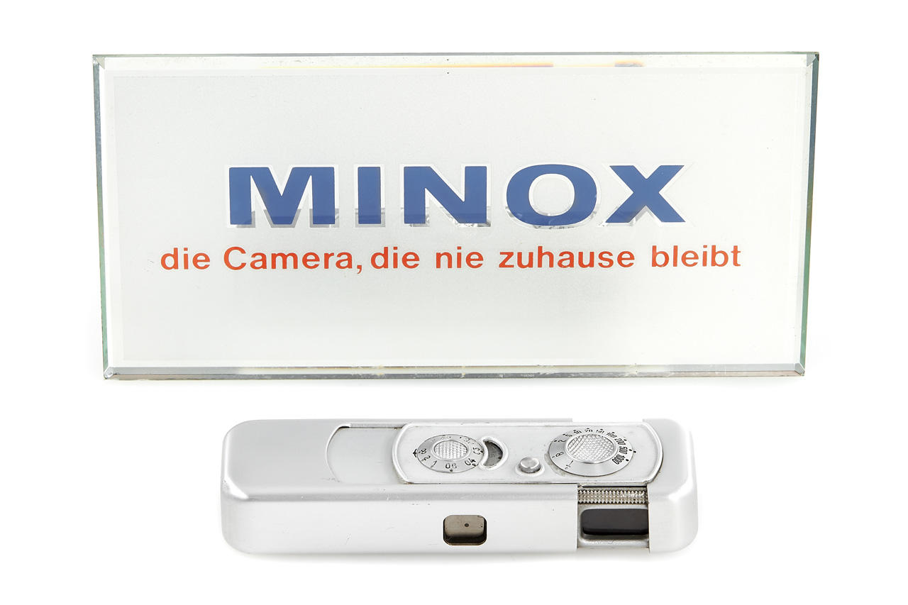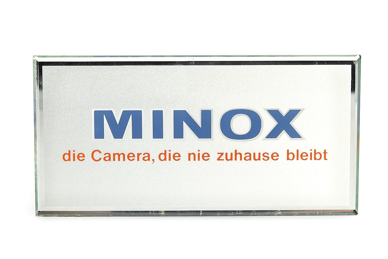 original Minox glass display sign 7.5x15cm in beautiful condition, with Minox A dummy (stamped with F756)